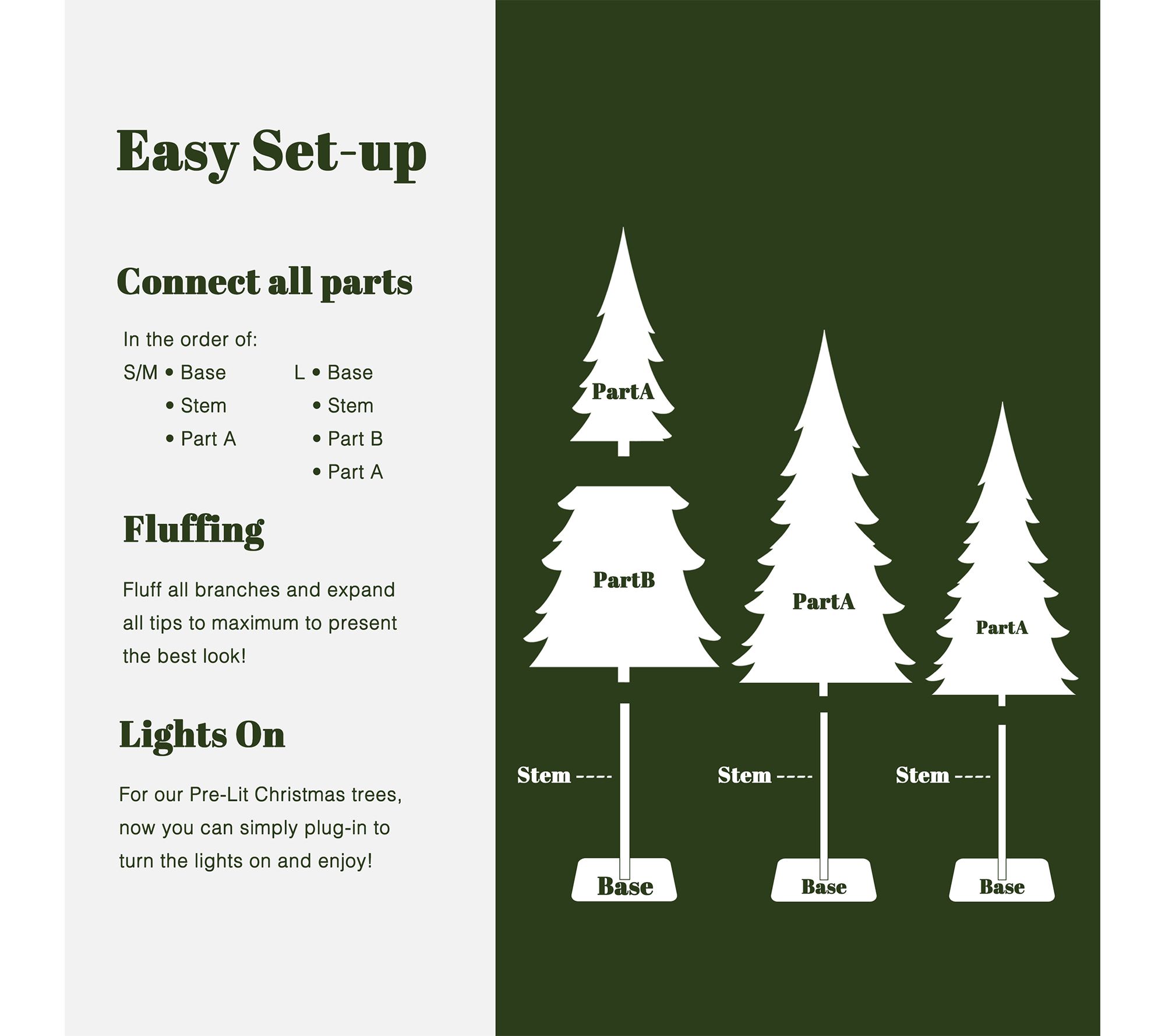 Measures: large tree 60"H x 21.6"Diam, medium tree 48"H x 20.4"Diam, small tree 36"H x 18"Diam; Cord 6"L
