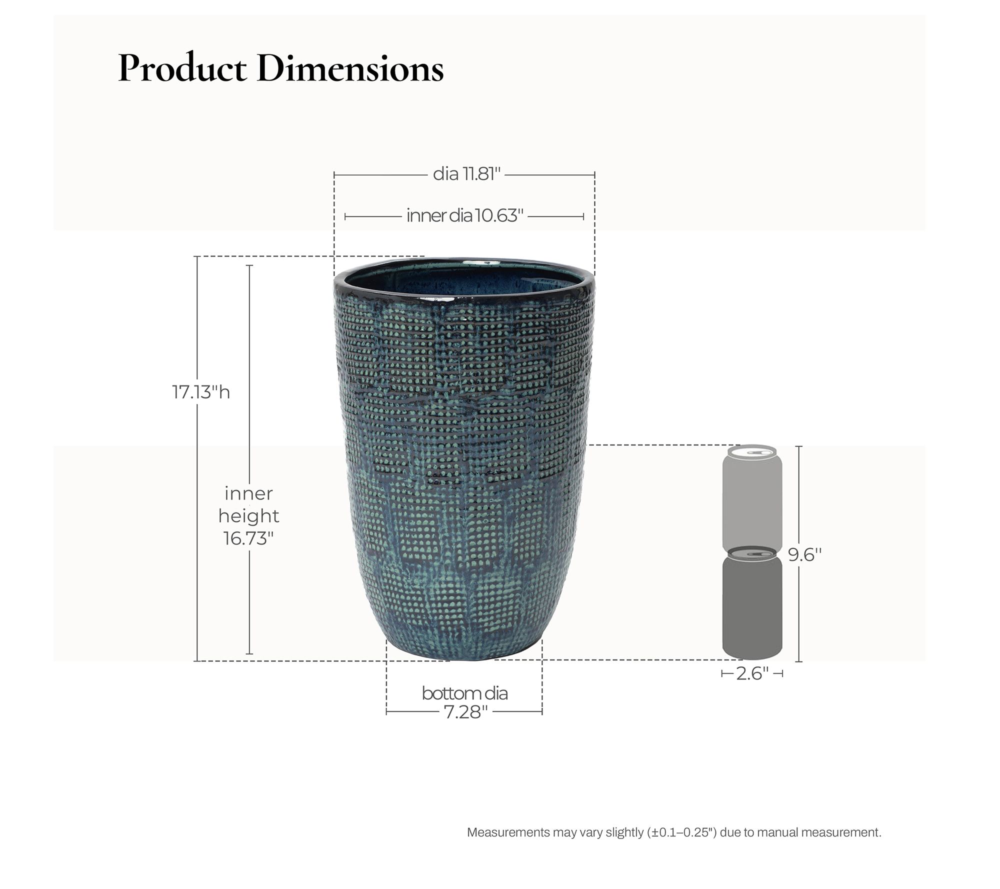 • Measures 17.13 inches tall x 11.81 inches diameter