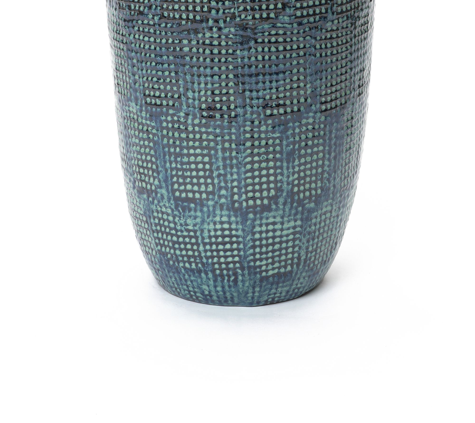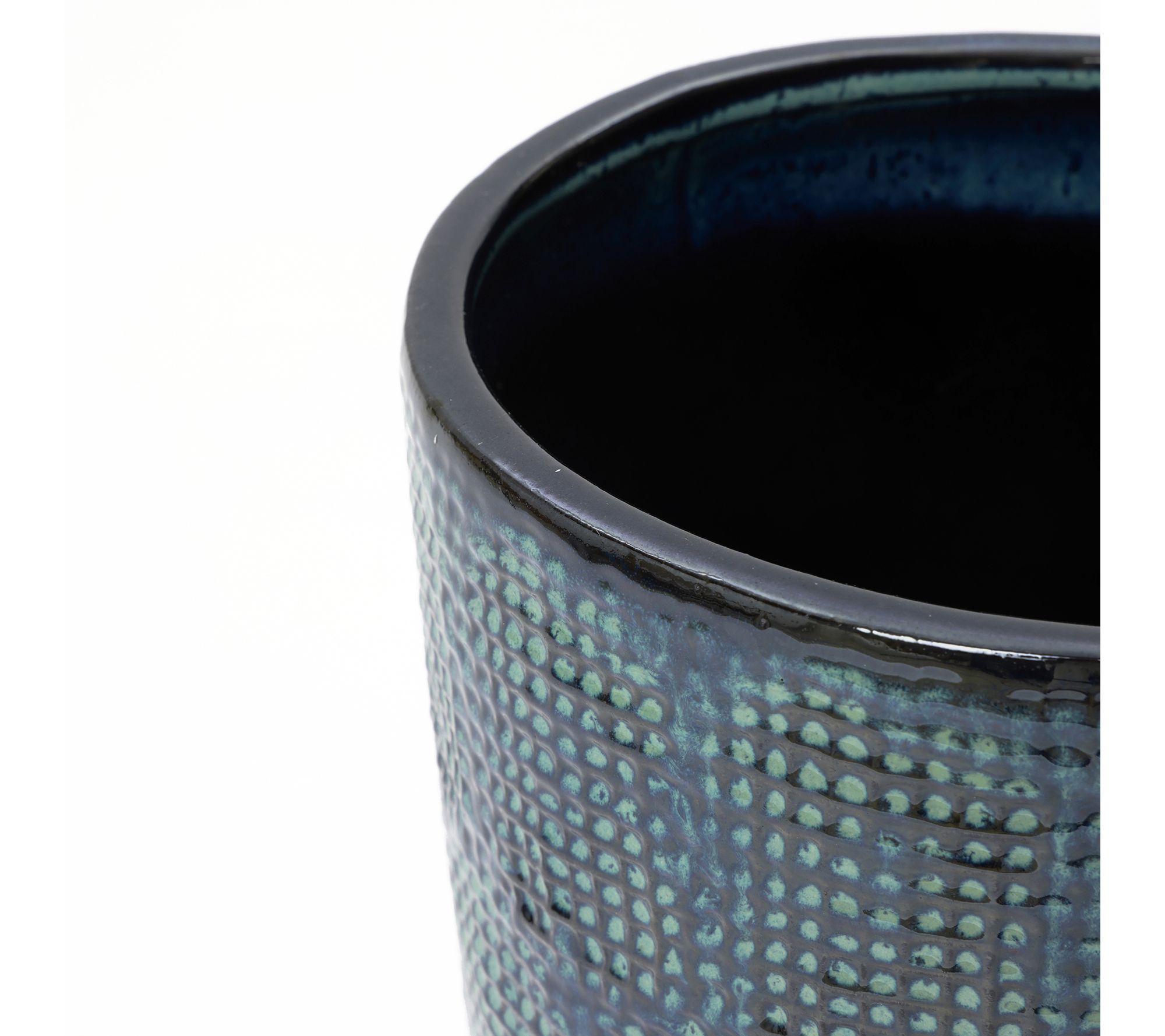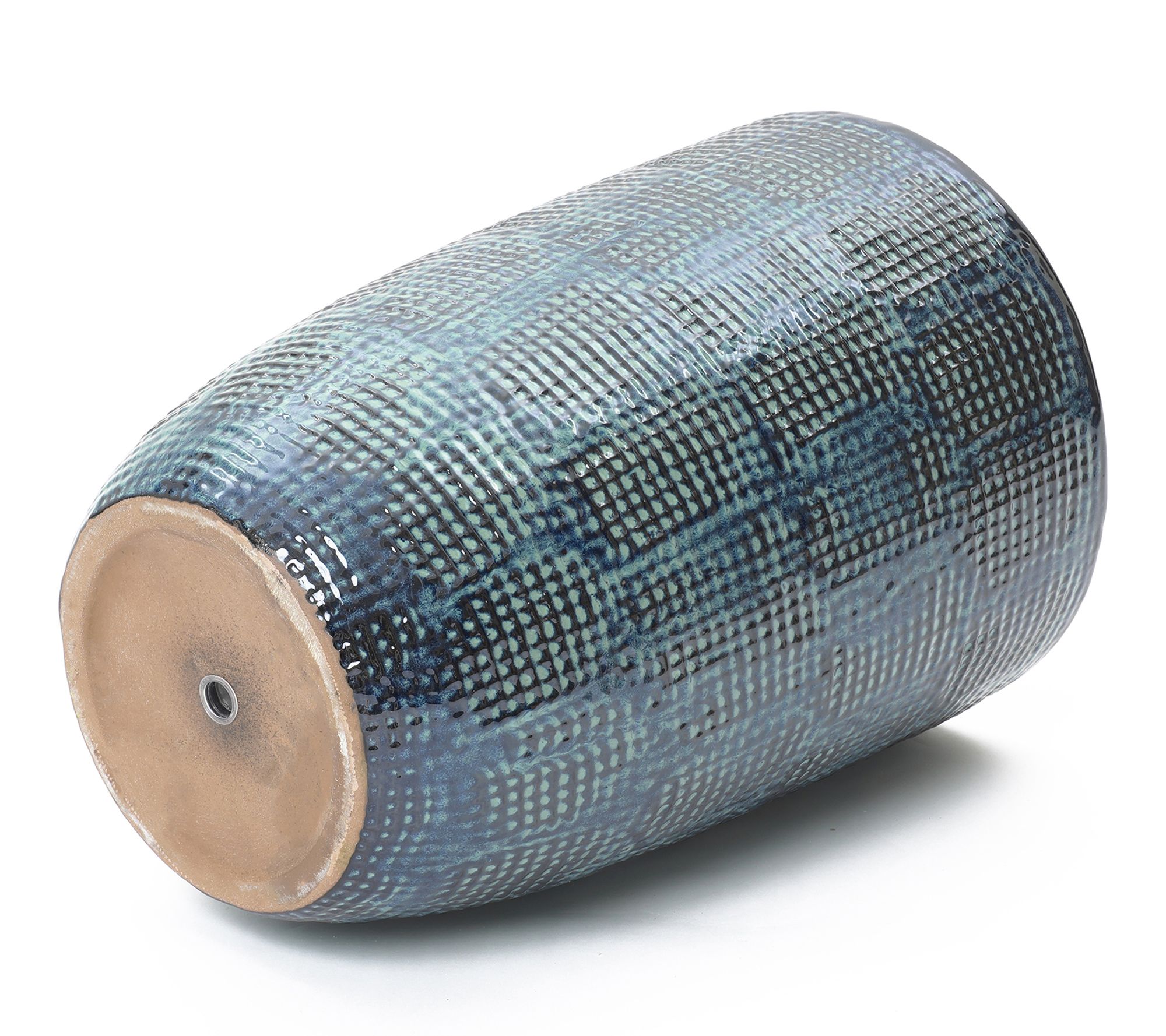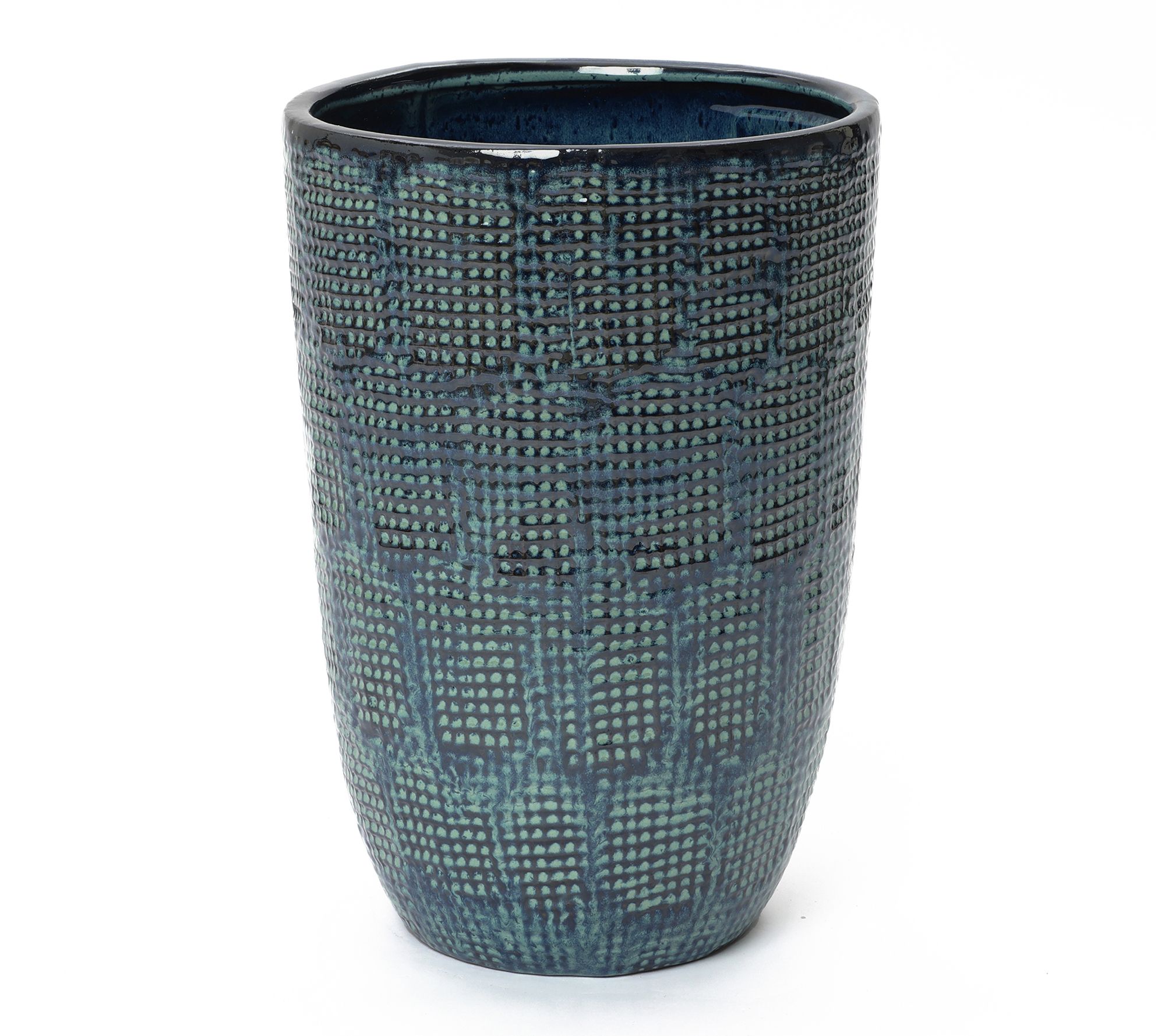 Create a statement corner or centerpiece with this Ocean Grid Textured Ceramic Planter, featuring shimmering green-blue tones and a sculpted grid that feels inspired by coastal waves. Its tall design welcomes lush foliage, decorative trees, or cascading vines in entryways, sunny patios, or living rooms. The glossy finish, generous size, and drainage hole combine visual appeal with plant-friendly function. From LuxenHome.