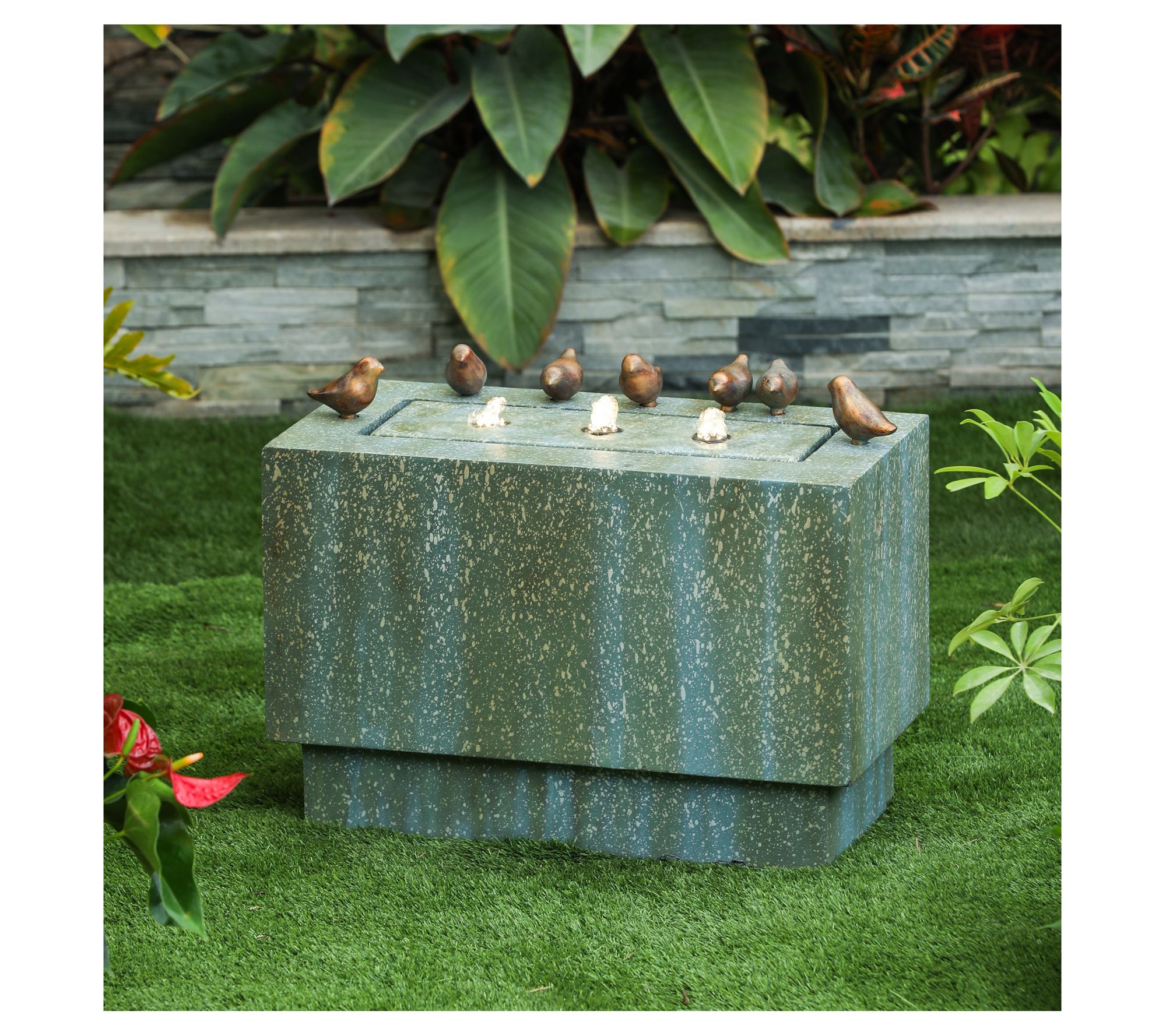 • Includes fountain base, fountain top with LED lights and seven bird sculptures, electric pump, and instructions