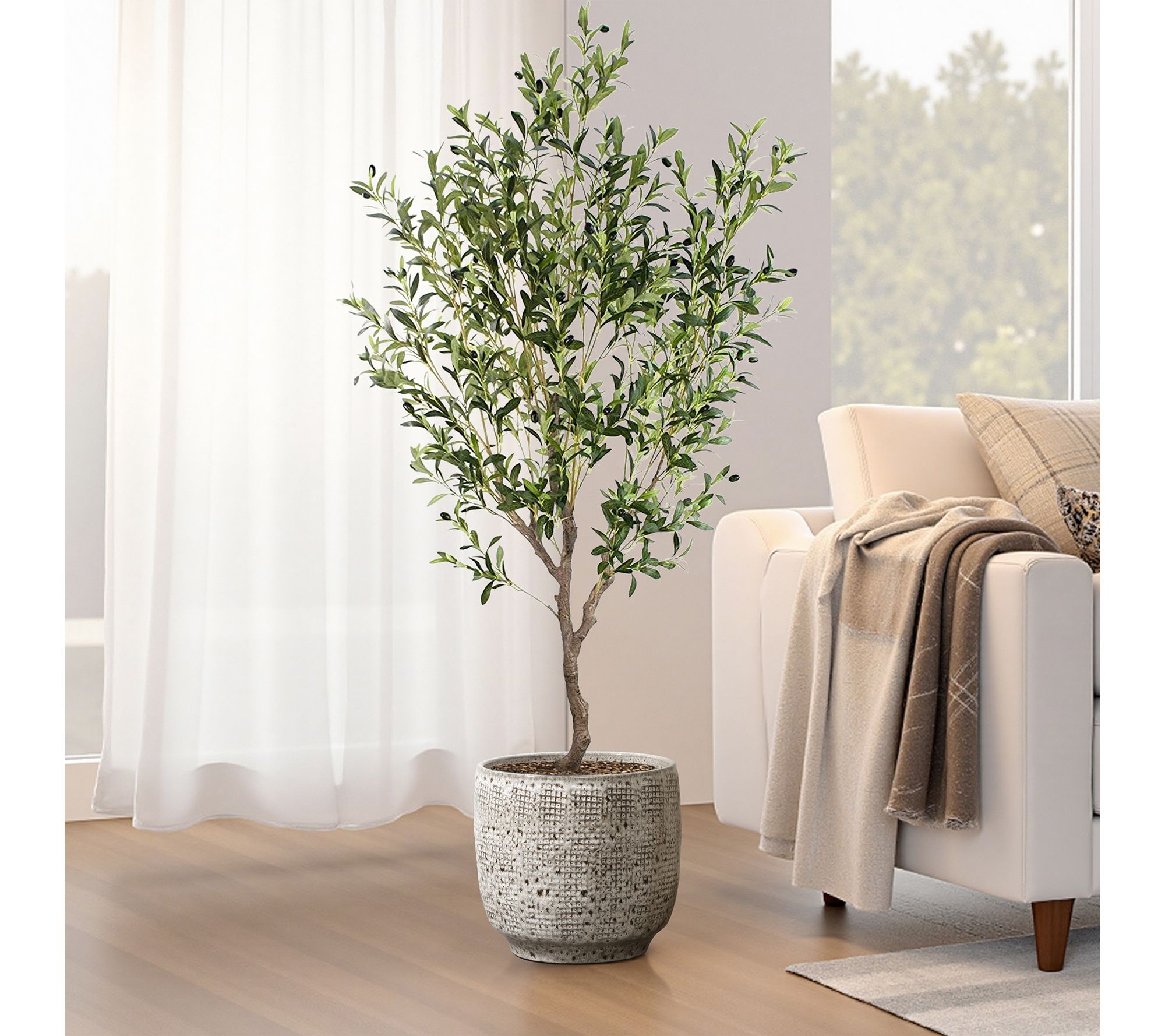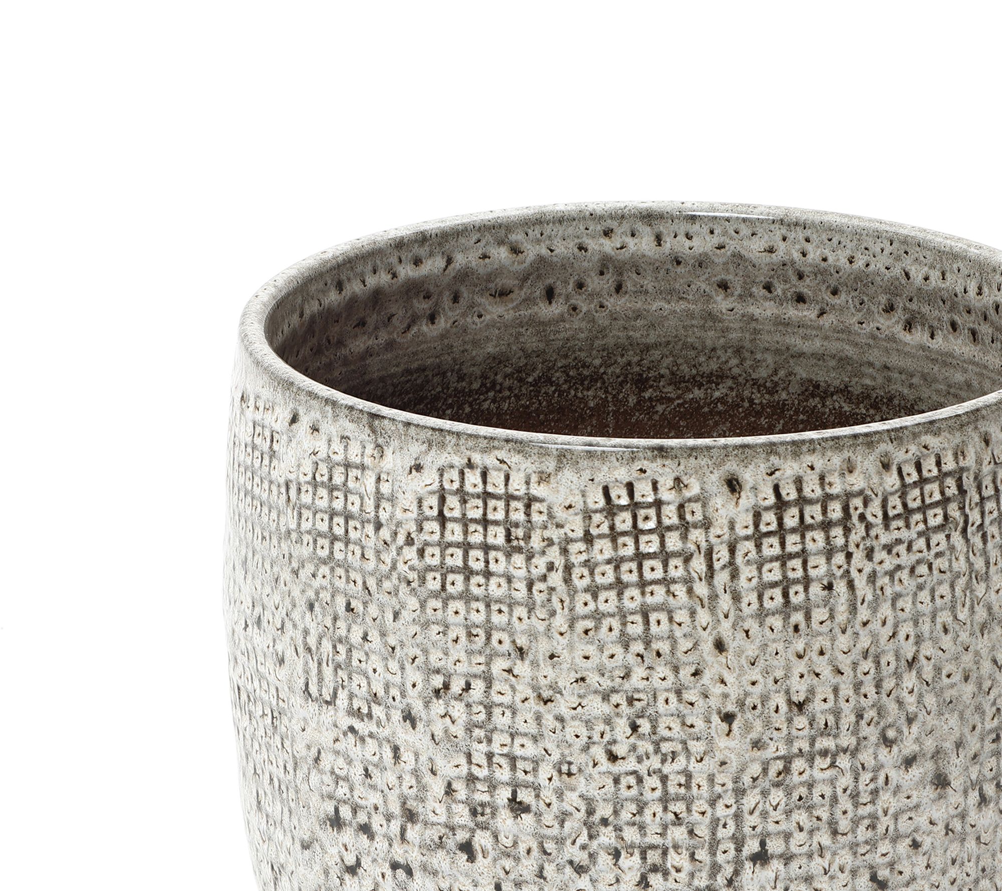Infuse your home with elegant texture and artistry using this ceramic planter, featuring a speckled stone-inspired finish and an eye-catching gray grid pattern. Its deep interior and built-in drainage hole offer a practical foundation for leafy greens, ferns, or palms. From LuxenHome.