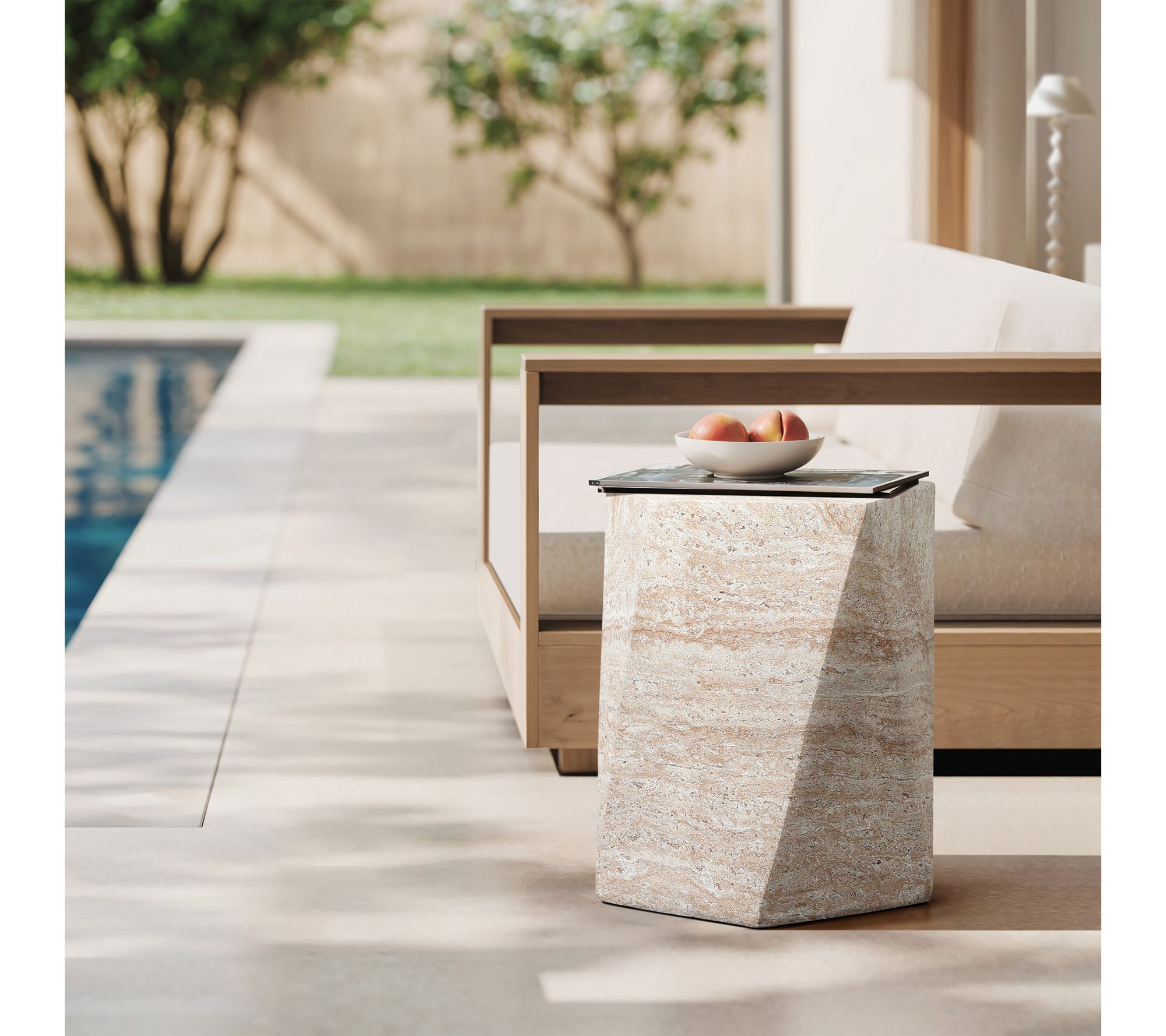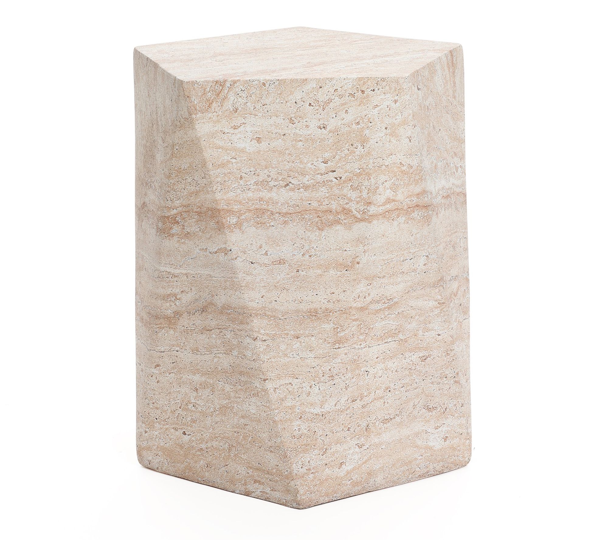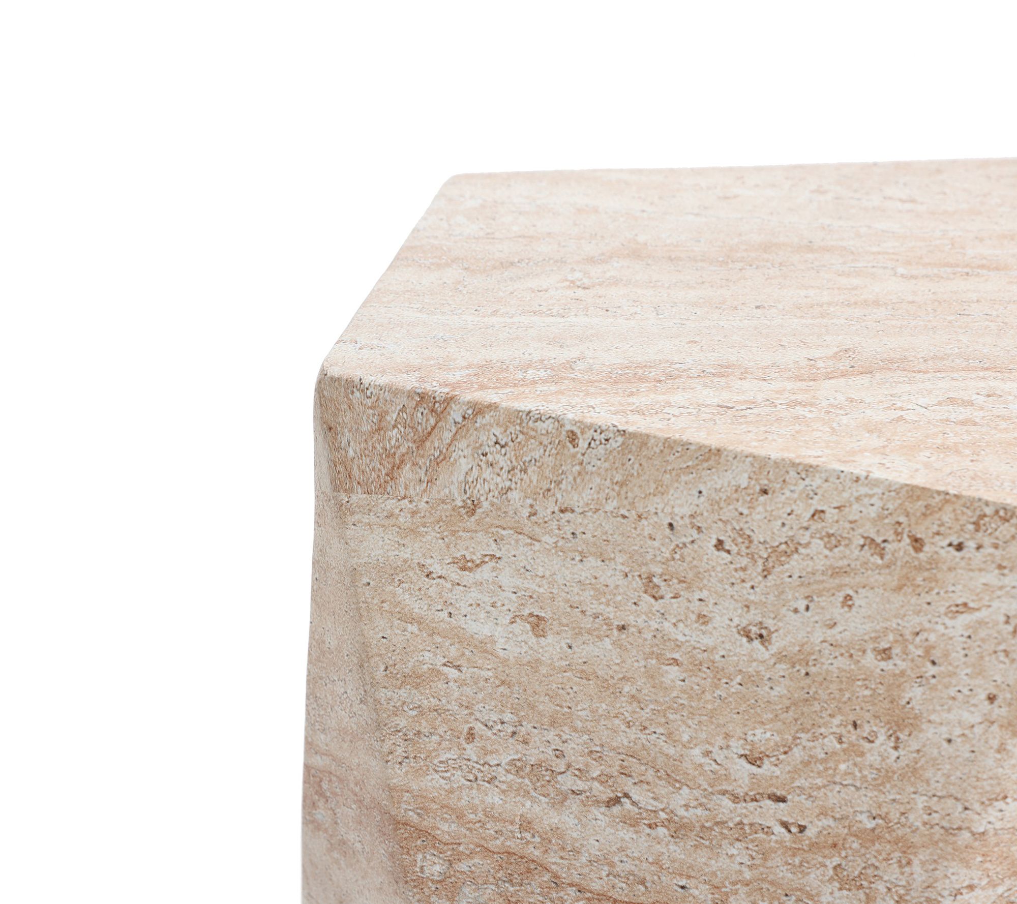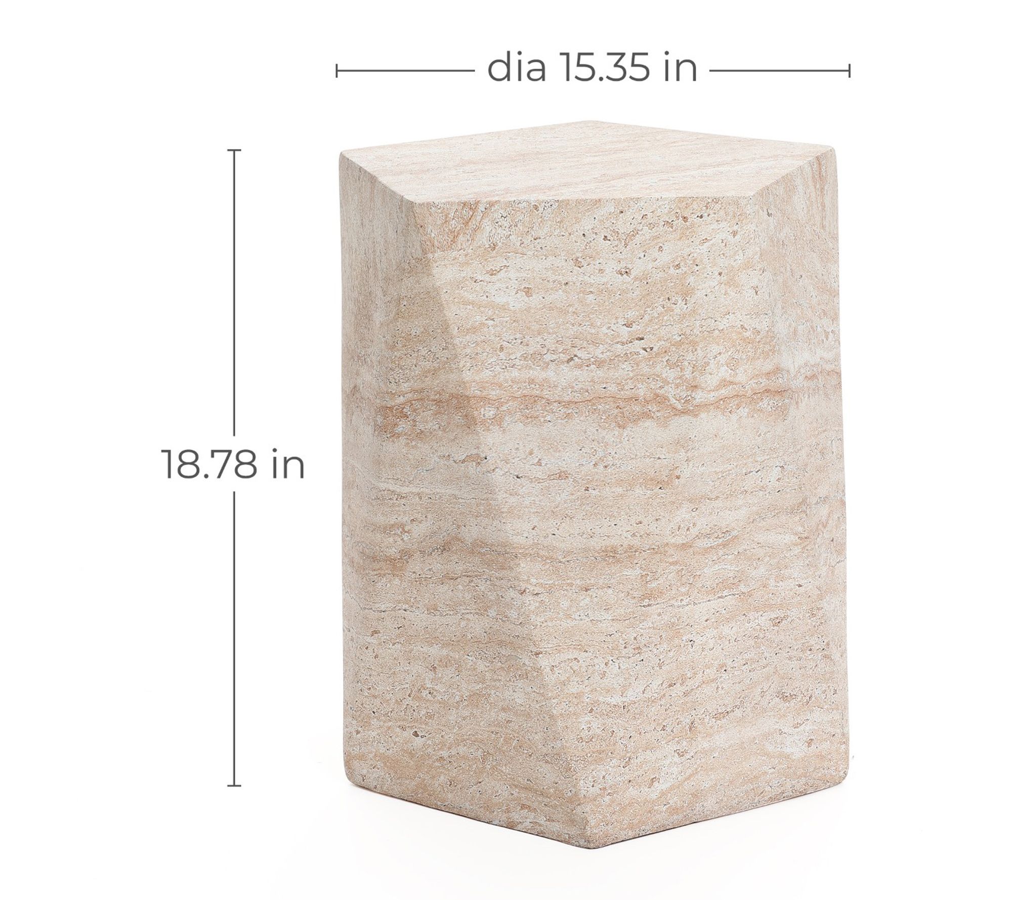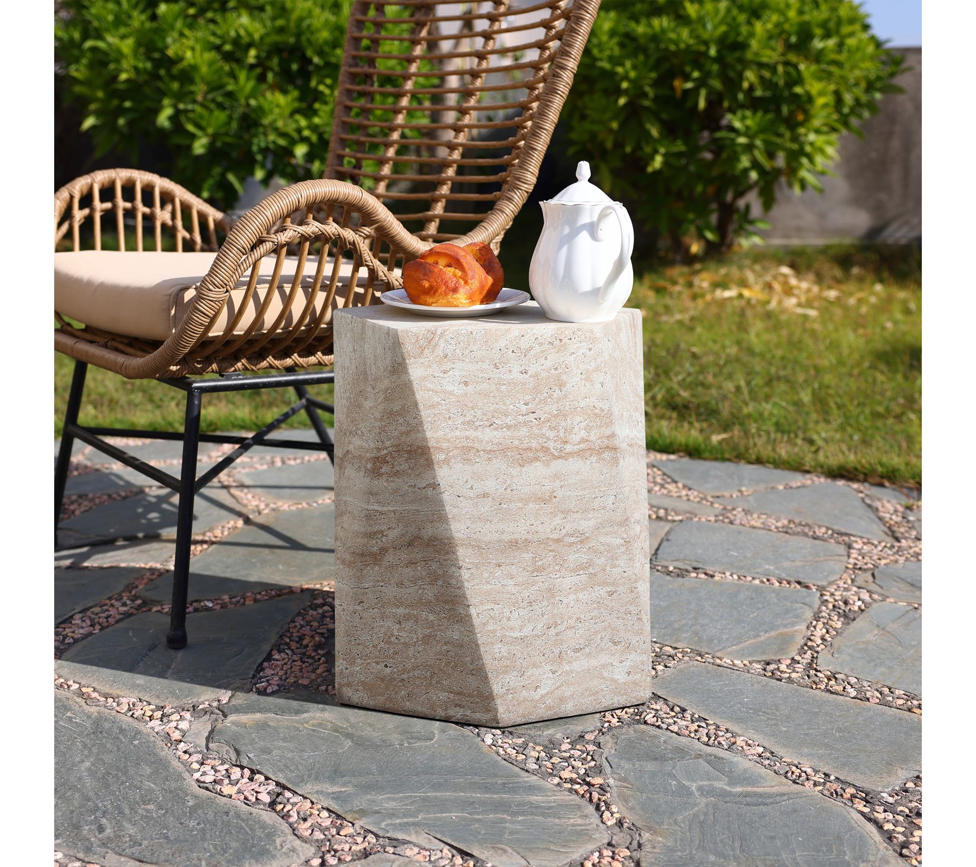With its travertine-style finish and striking irregular shape, this outdoor side table transforms your patio or living room into an inviting oasis -- providing a stylish spot for drinks, books, or decorative accents. It's designed to blend seamlessly with your decor, indoors or out, making every gathering or quiet moment feel a bit more special. From LuxenHome.