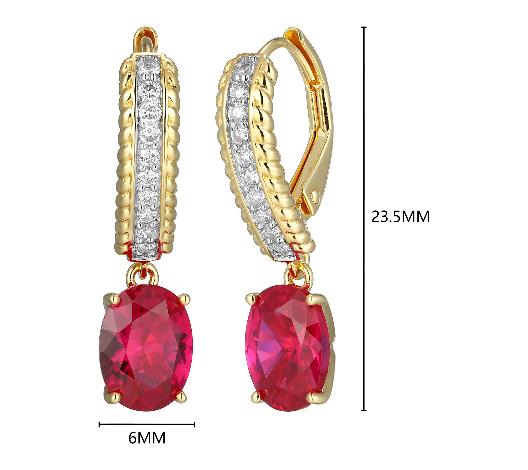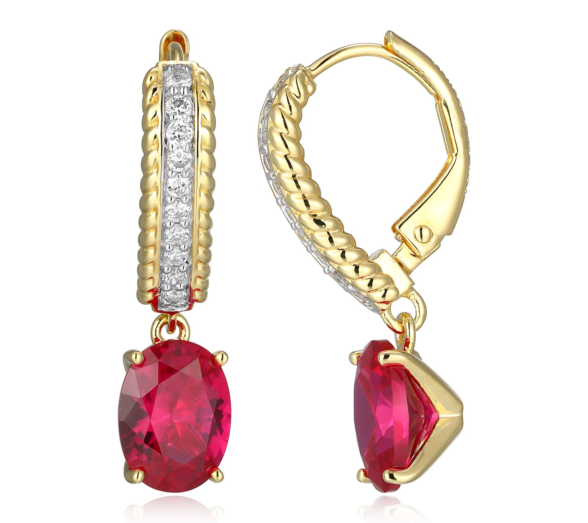 A burst of color and light uplifts any occasion with these dangle earrings, showcasing vibrant oval lab-created rubies accented by round lab-grown diamonds. The warmth of 18K yellow gold-plated sterling silver frames each stone, while lever back closures keep them secure from morning brunch to evening celebrations. From LuxLab.