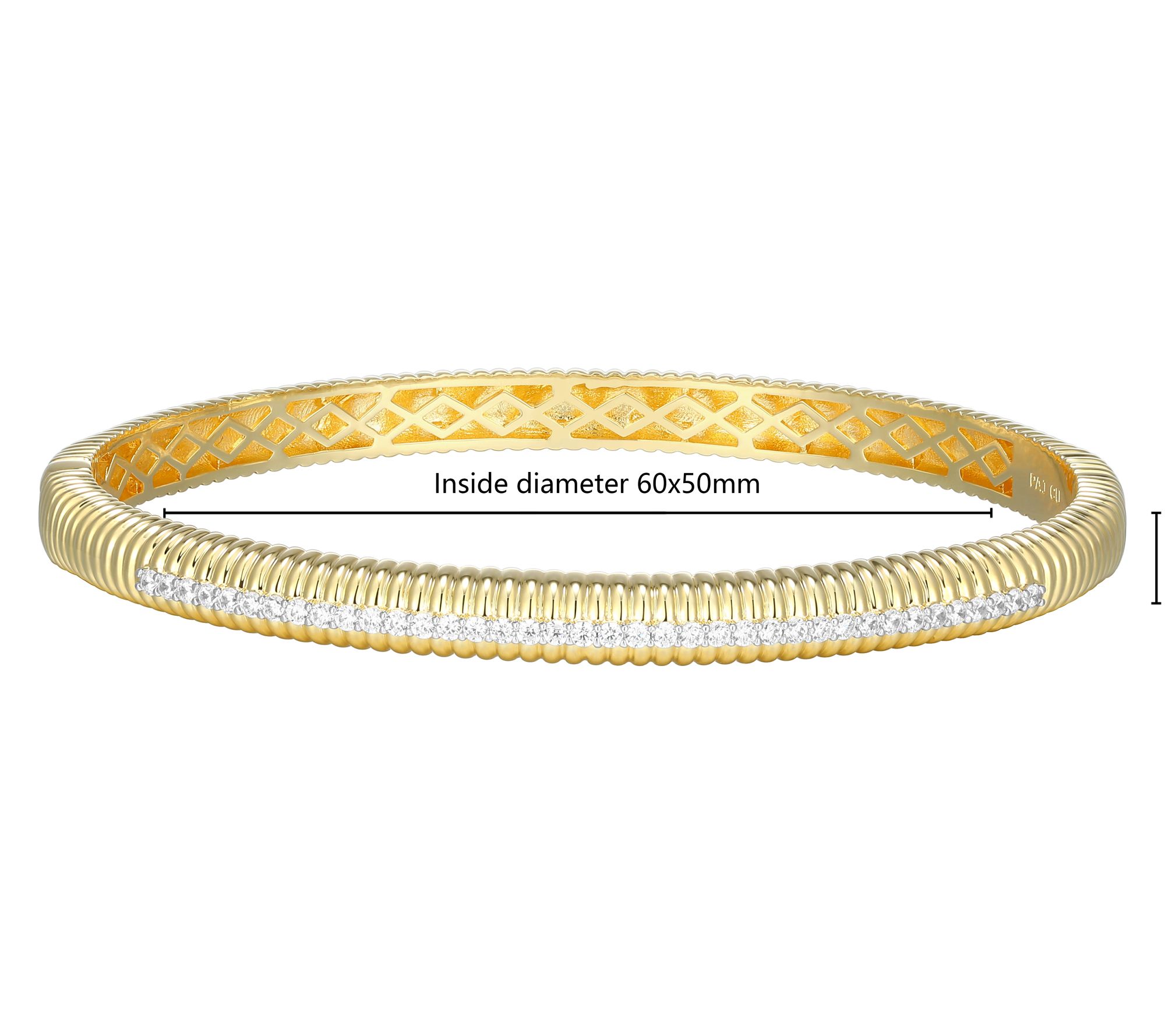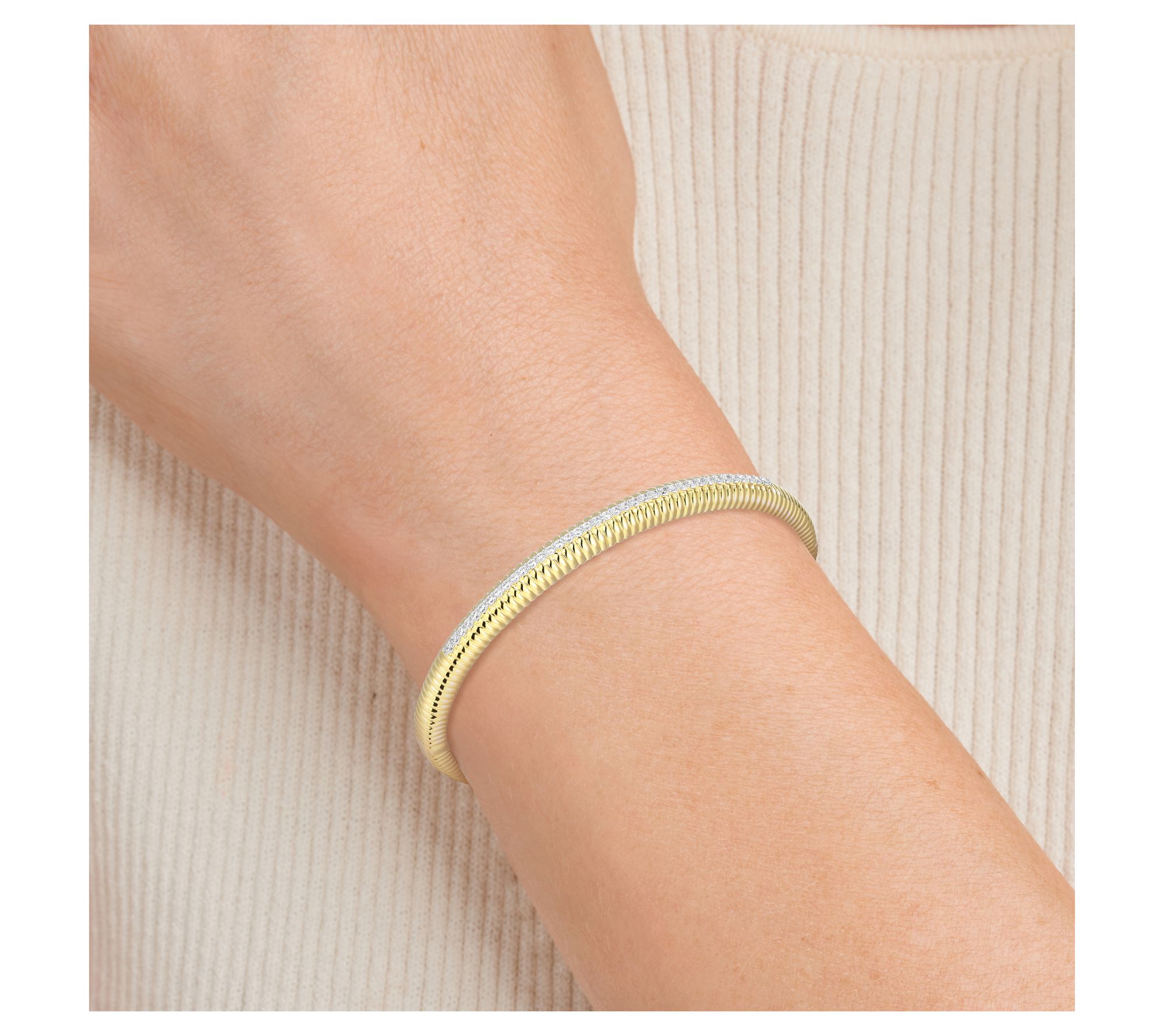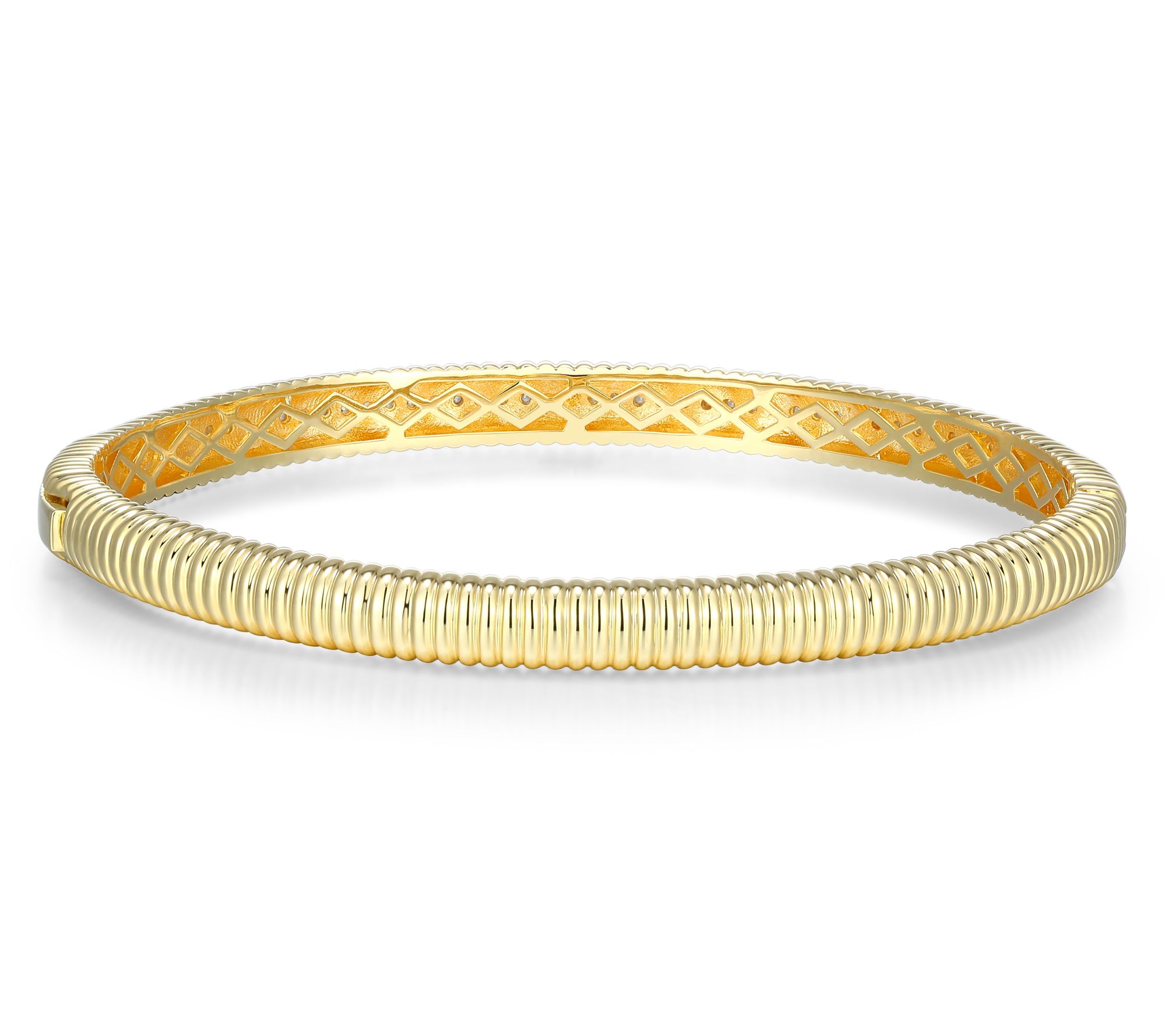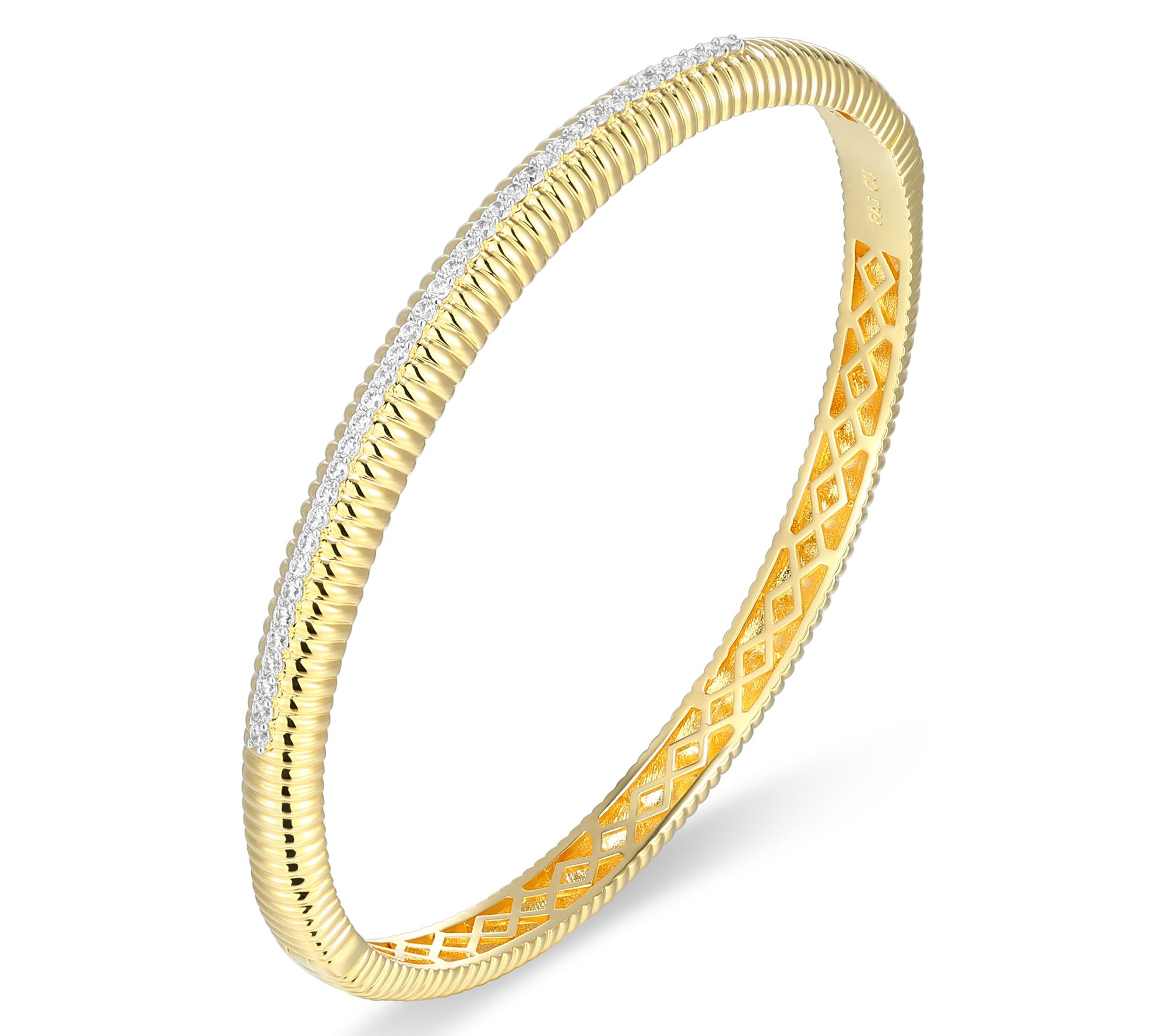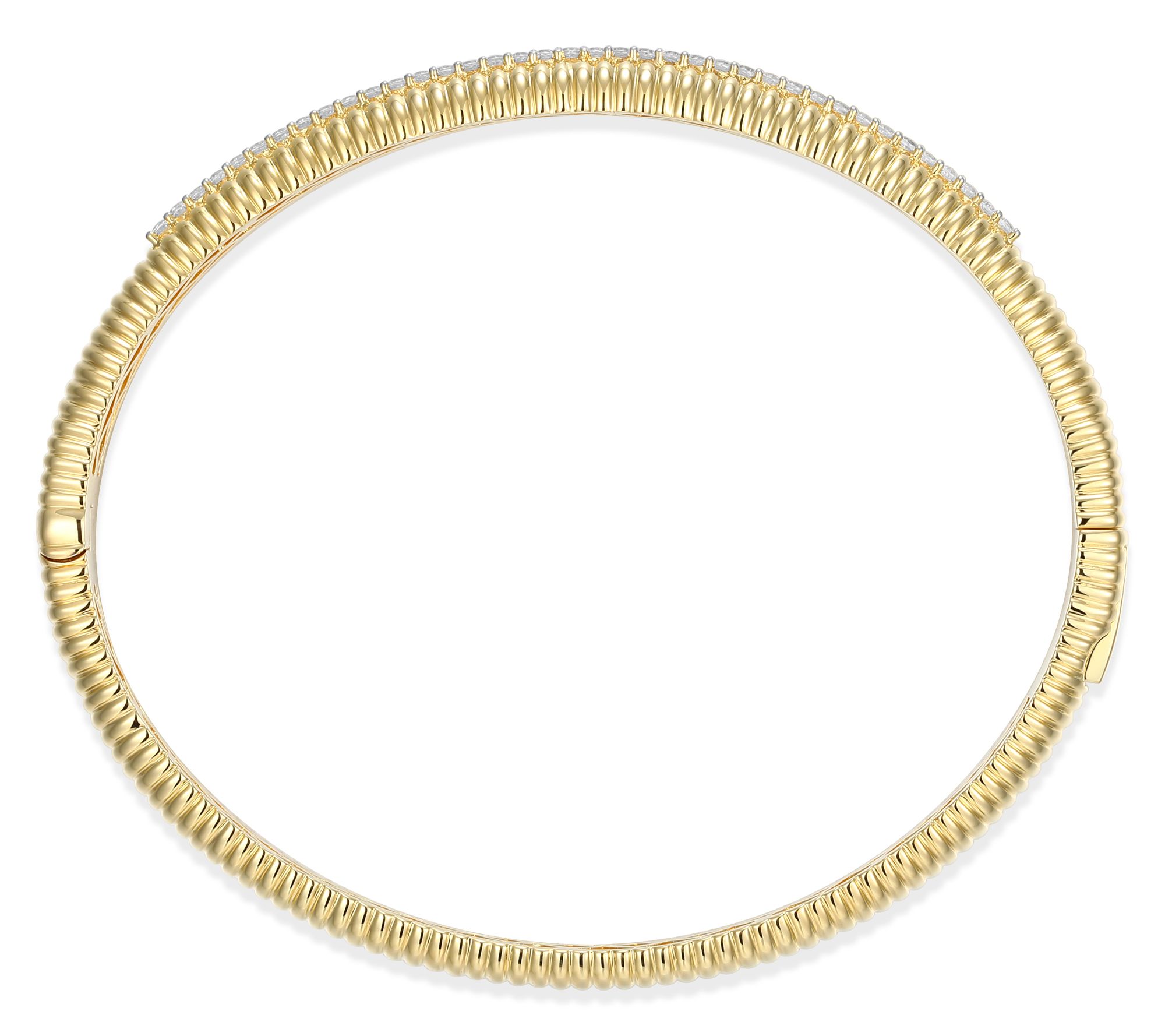 Everyday moments are made a little more radiant when your wrist catches the light with a shimmer of pave-set lab-grown diamonds. Whether you're at a morning coffee meeting or out for dinner, this bangle in 18K yellow gold-plated sterling silver elevates your look with sophistication and modern brilliance. Layer it with other pieces or let it shine solo for a striking effect. From LuxLab Diamonds.