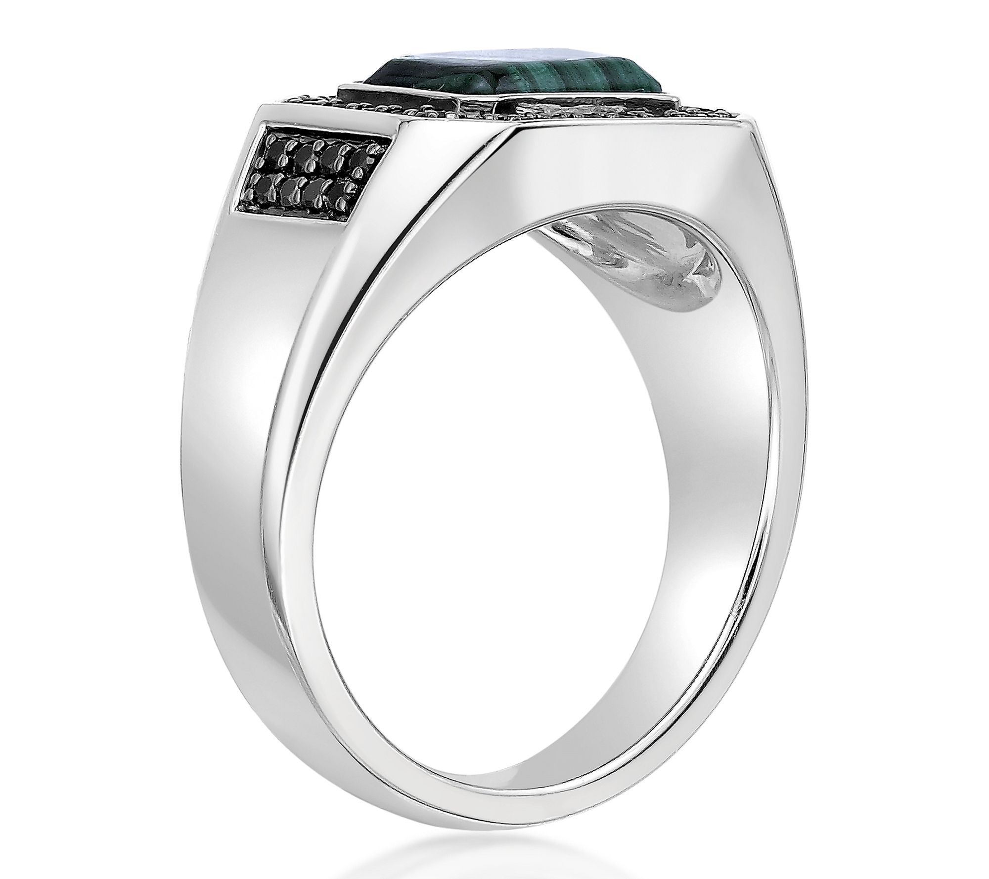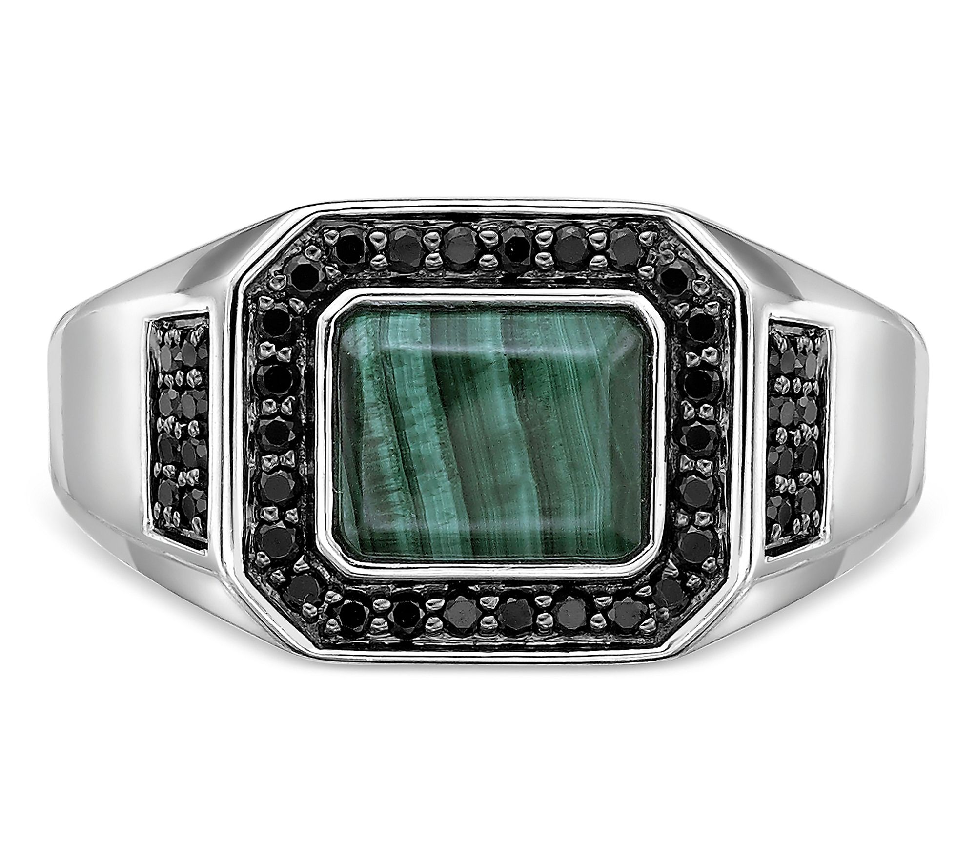 Rich, dramatic tones come together in this men's ring -- ideal for everyday confidence or marking a special moment. The striking malachite centerpiece displays distinctive banding, while genuine black diamonds set in polished sterling silver add a sophisticated edge to any look. From LYMX.