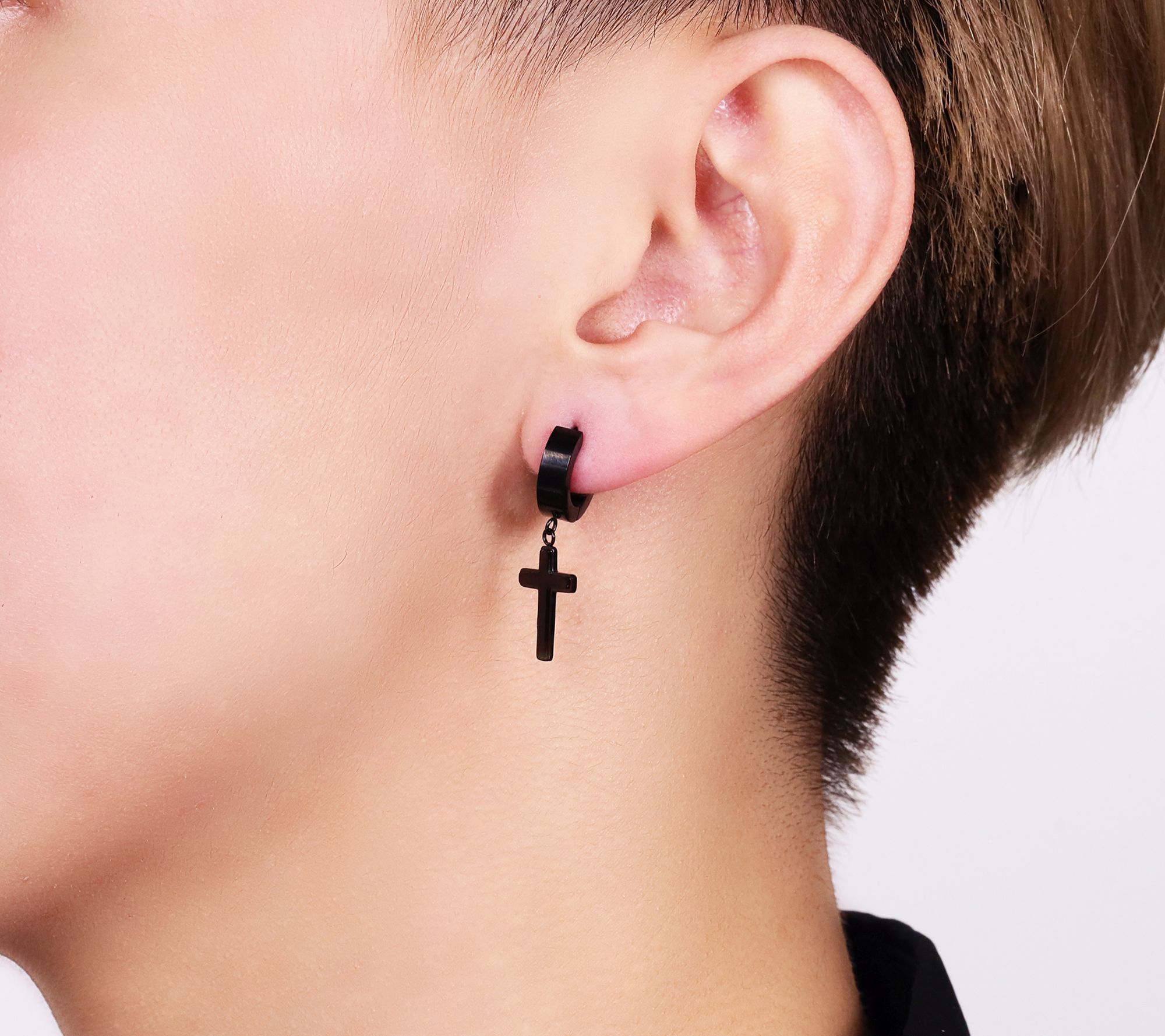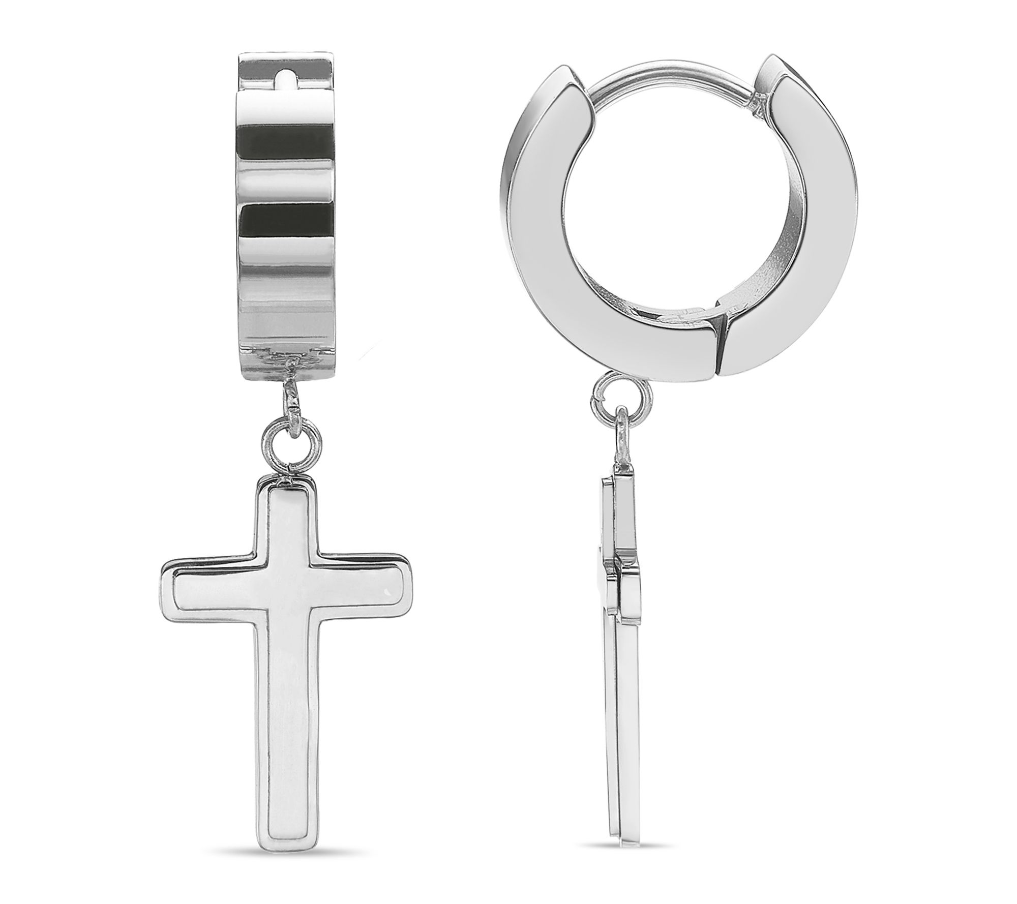 • Cross dangle design; hoop style; polished finish