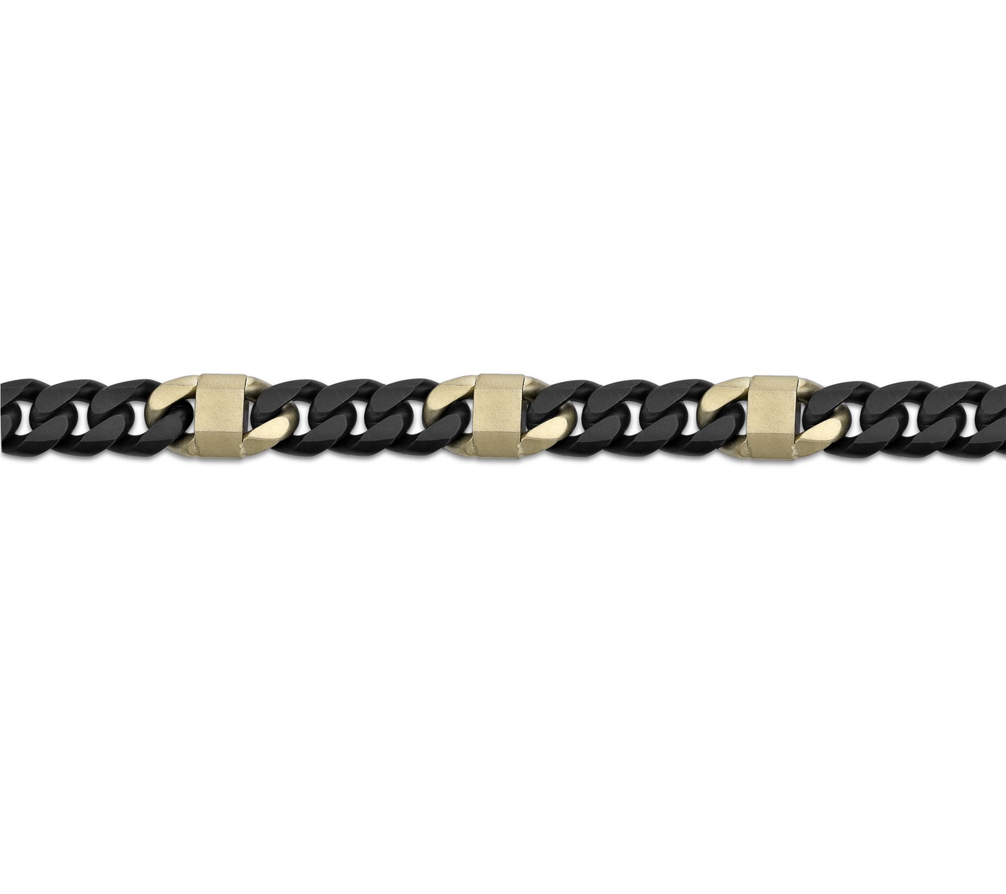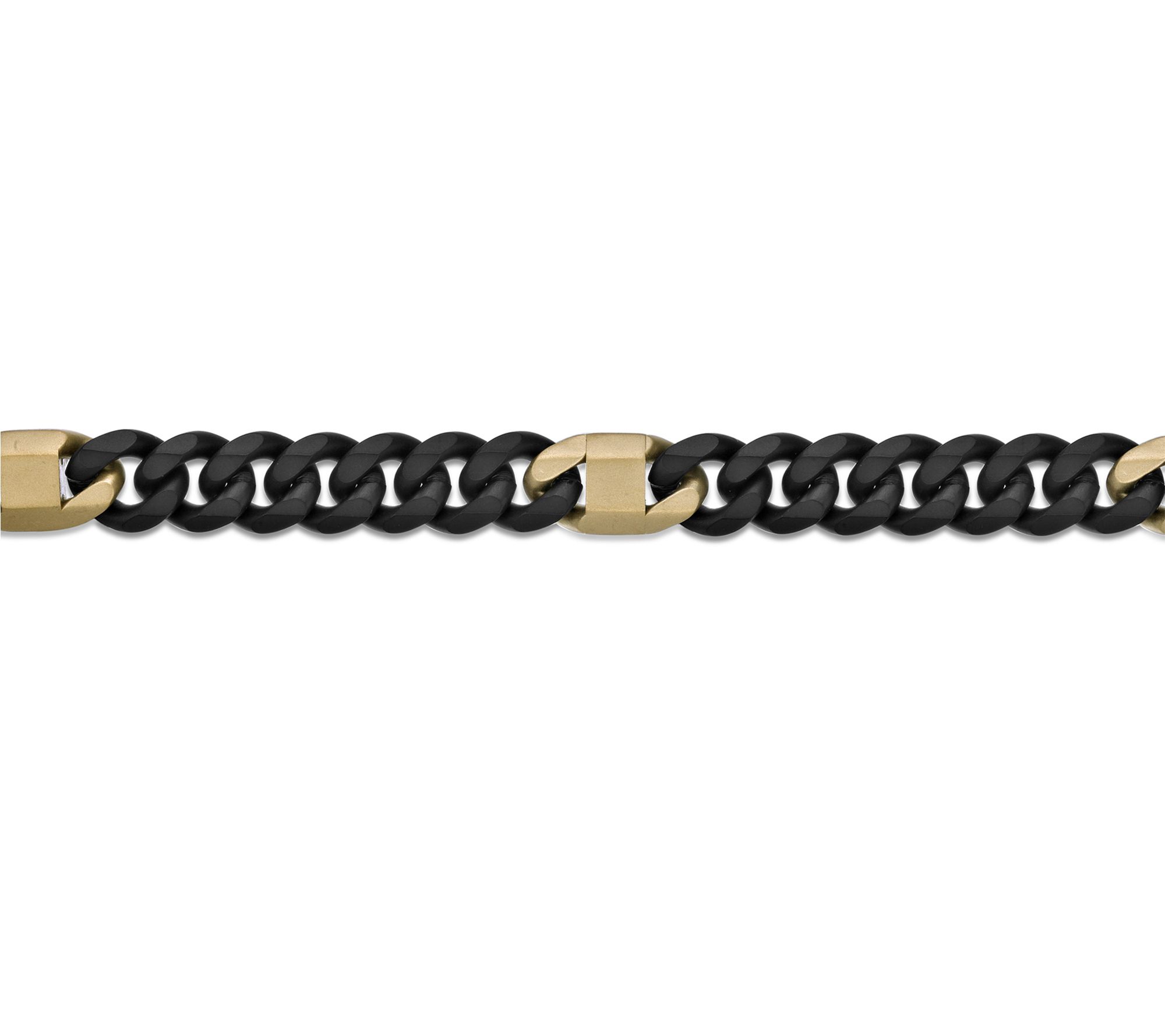 • Matte black curb links with polished goldtone rectangular accents; structured Miami Cuban chain design