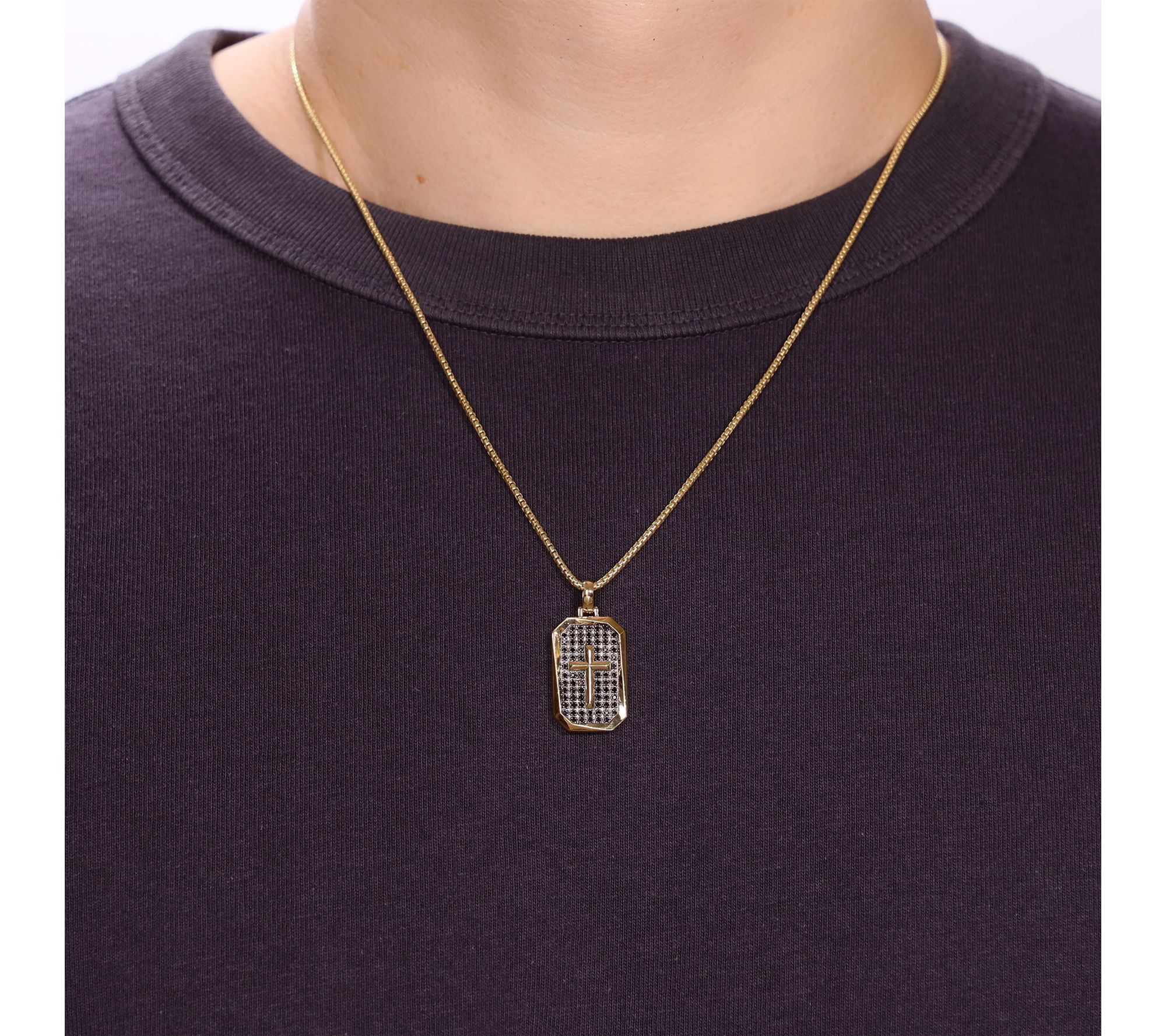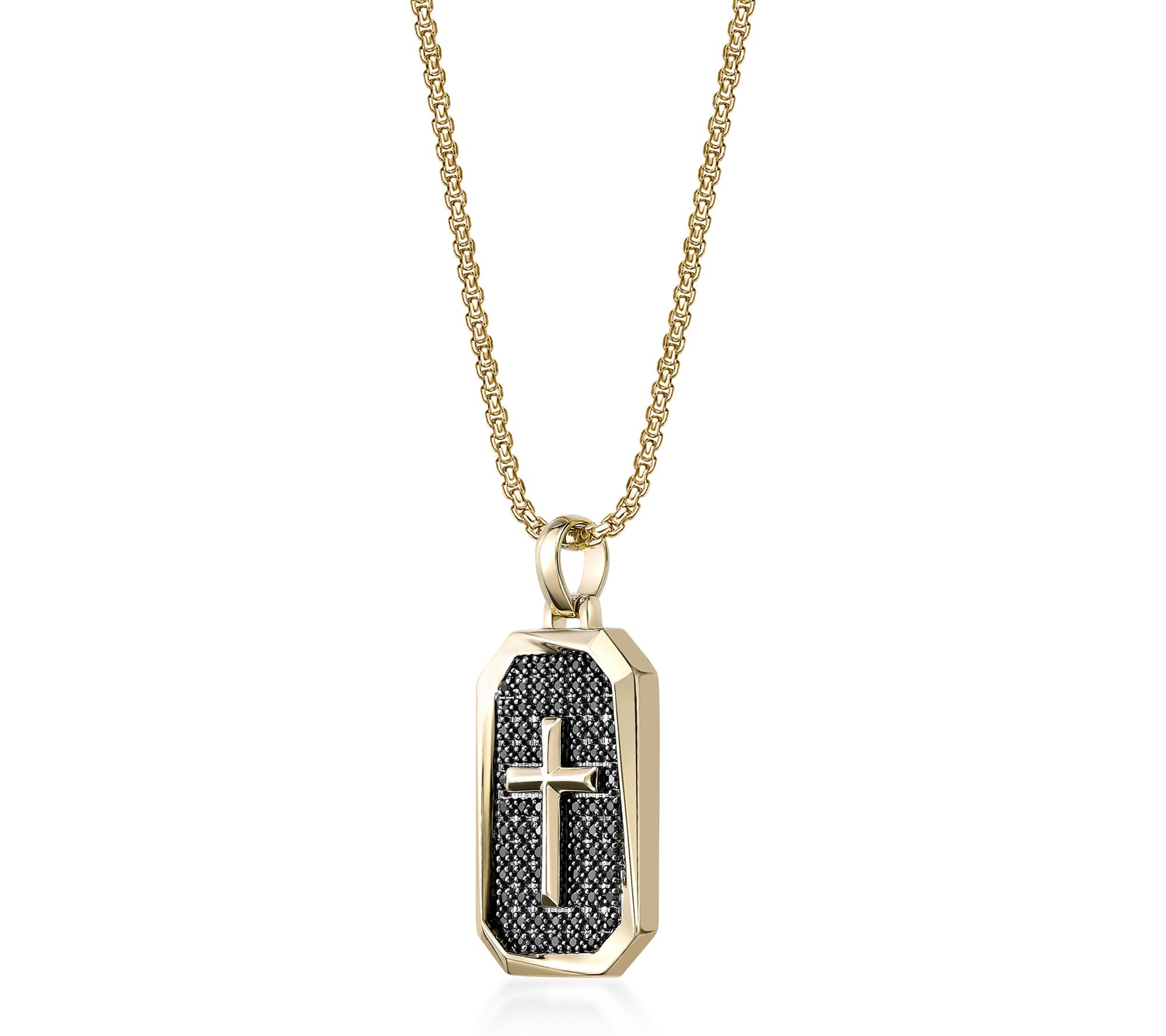 Dog tag style; cross detail; round, prong-set black diamonds