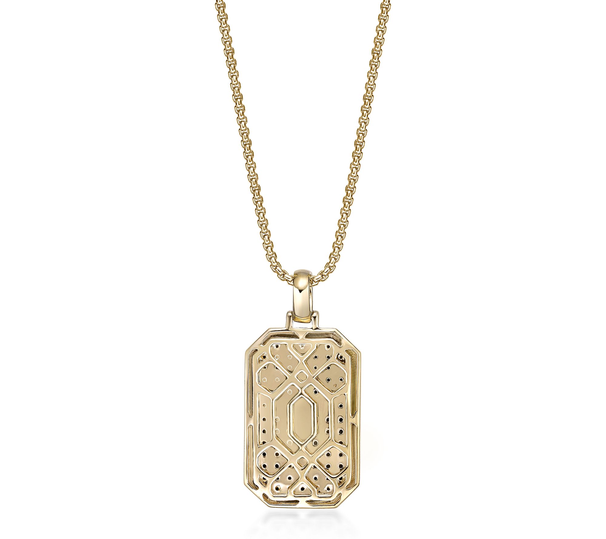 Style meets confidence with this dog tag necklace, designed to catch the eye with a modern edge. Set with round-cut black diamonds in a sleek silhouette, the bold contrast and rich goldtone-plated sterling silver offer standout style for special occasions or everyday wear. From LYNX.