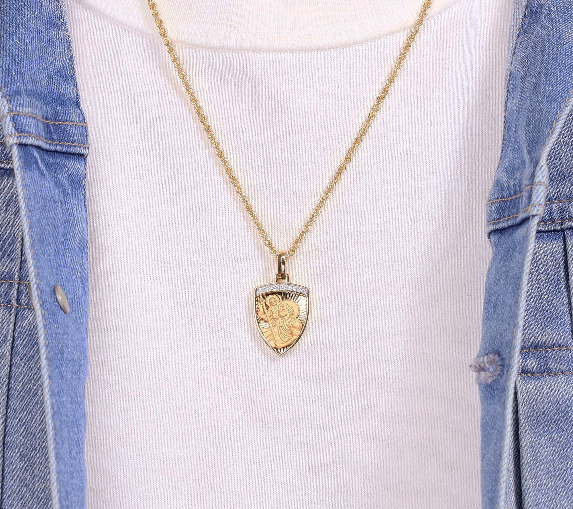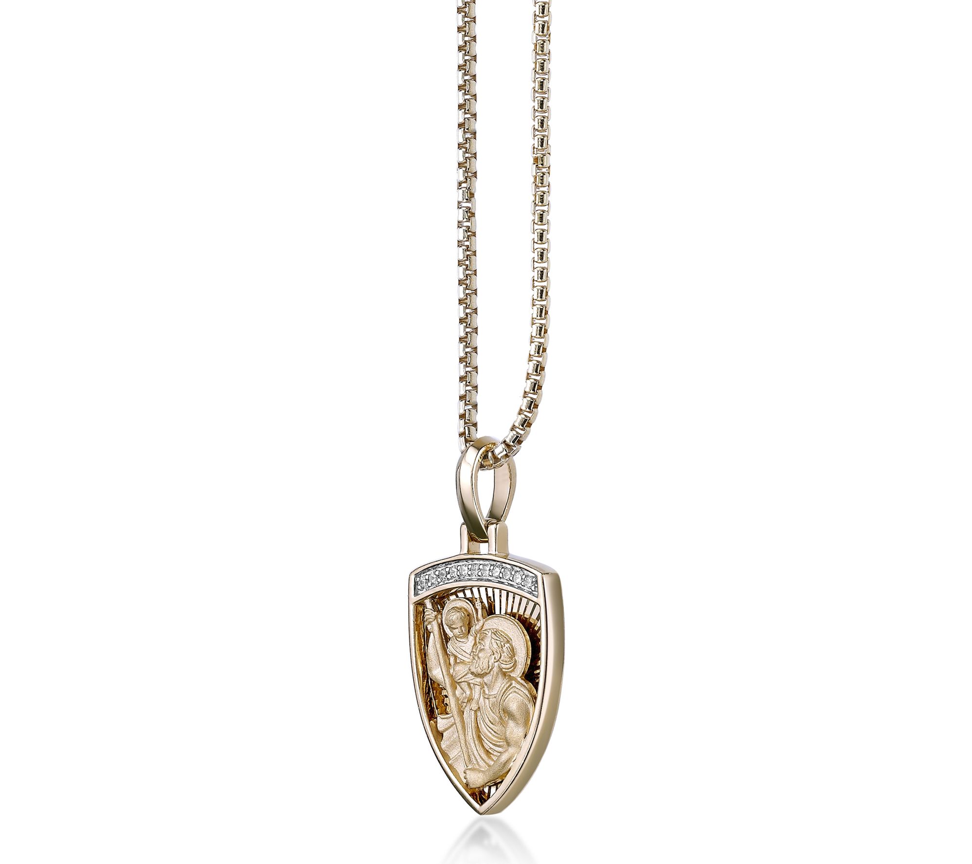 Round, prong-set white diamond border; Saint Michael the Archangel shield-shaped pendant; two-tone finish; polished