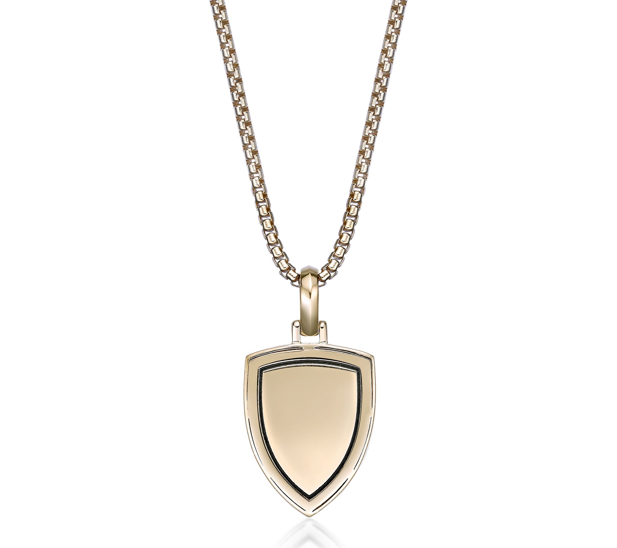 A symbol of faith and strength, this men's shield pendant pairs meaningful inspiration with eye-catching style. Diamonds frame a detailed Saint Michael the Archangel design, while selective accents on sterling silver add dimensional warmth. The 24" box chain makes it a striking choice for everyday wear or gifting. From LYNX.
