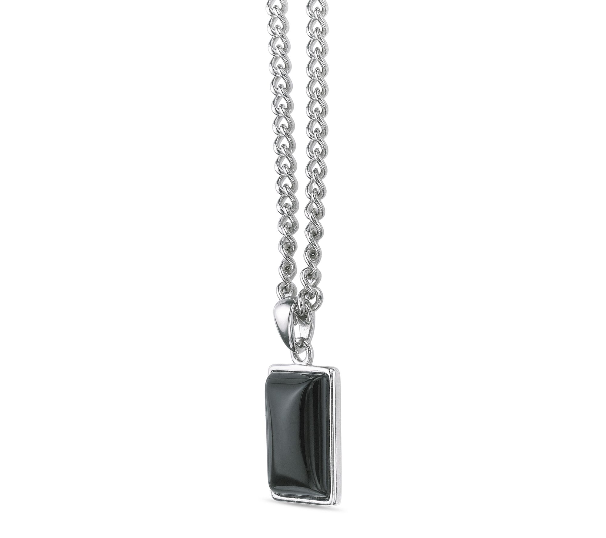 • Genuine black agate in rectangular, bezel-set pendant; polished sterling silver frame; softly beveled edges; clean geometric details