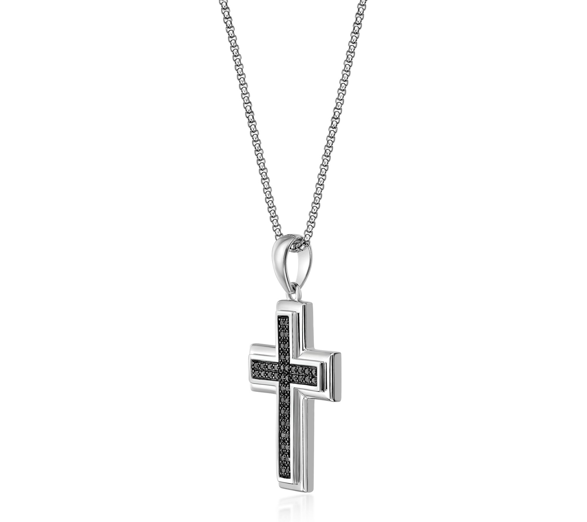 Bold sparkle and timeless meaning come together in this sterling silver cross pendant, highlighted by black diamonds. With a striking contrast and refined appeal, it's a powerful addition to your jewelry collection -- ideal for everyday style or special occasions. From LYNX.