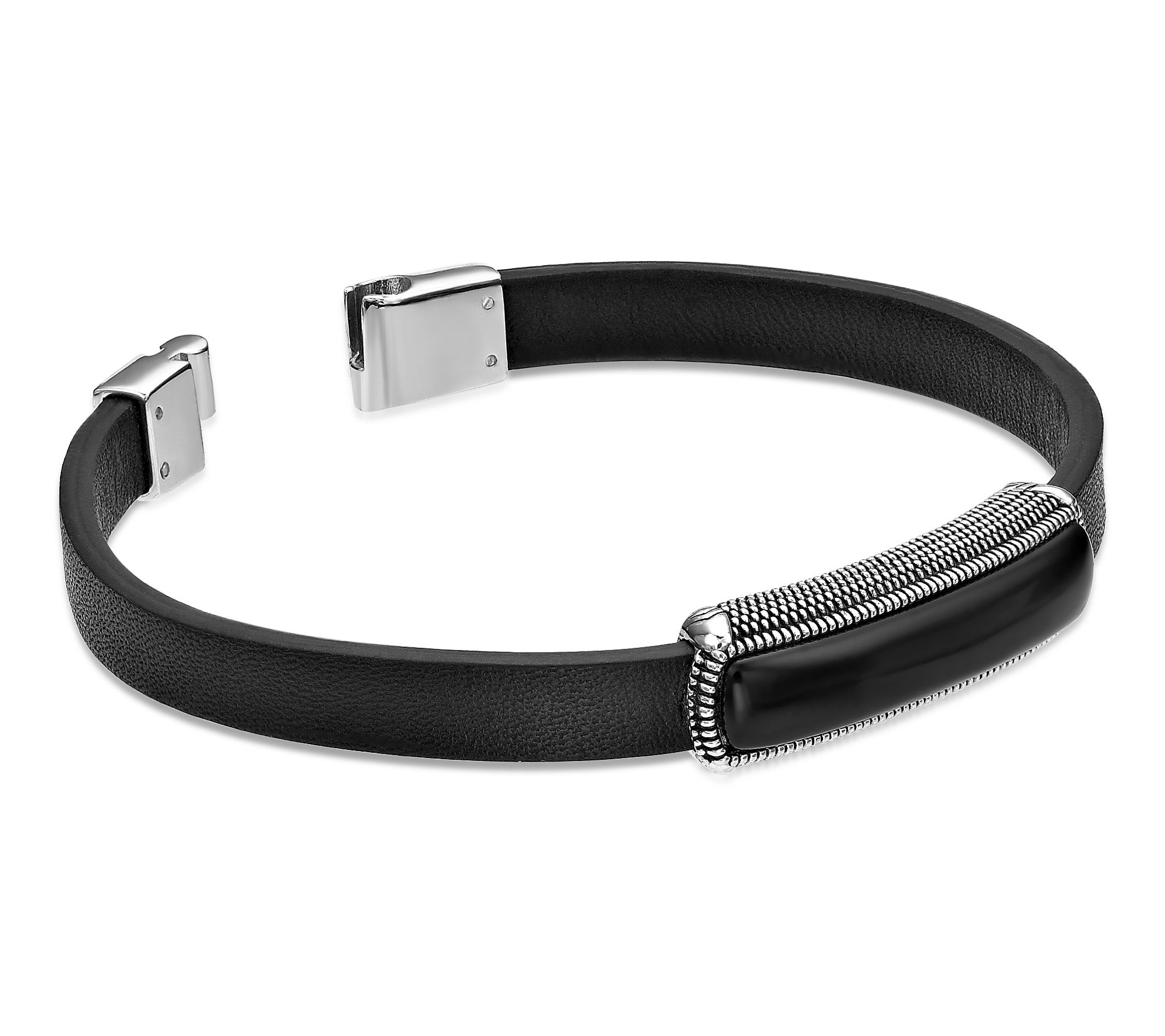 Designed for those who appreciate understated style, this men's bracelet seamlessly combines the strength of sterling silver with the bold look of black leather. The striking black agate centerpiece amps up visual interest, making this a standout choice for daily wear or special occasions. From LYNX.