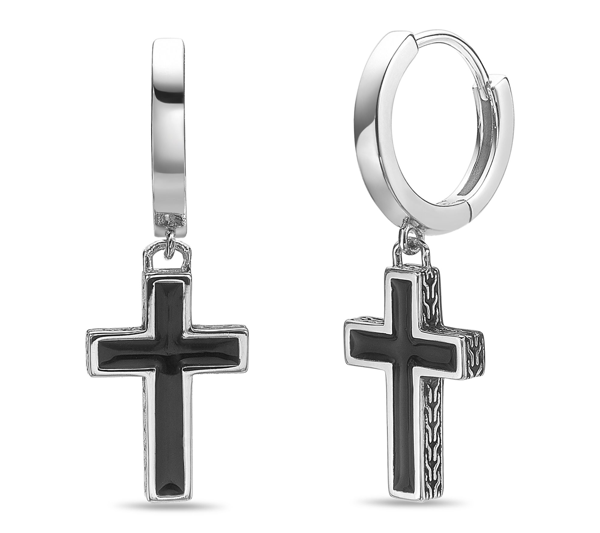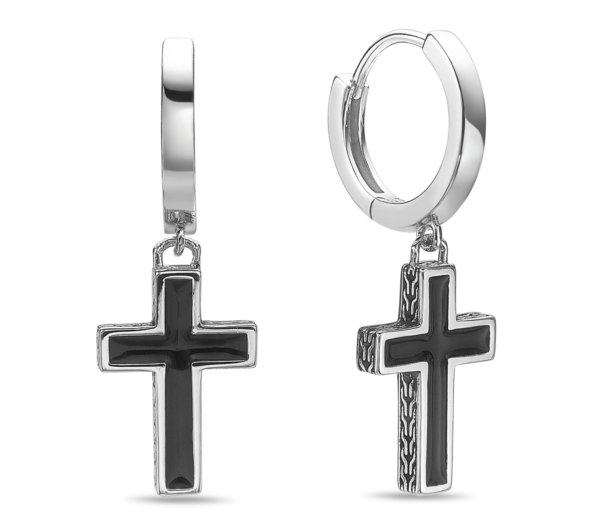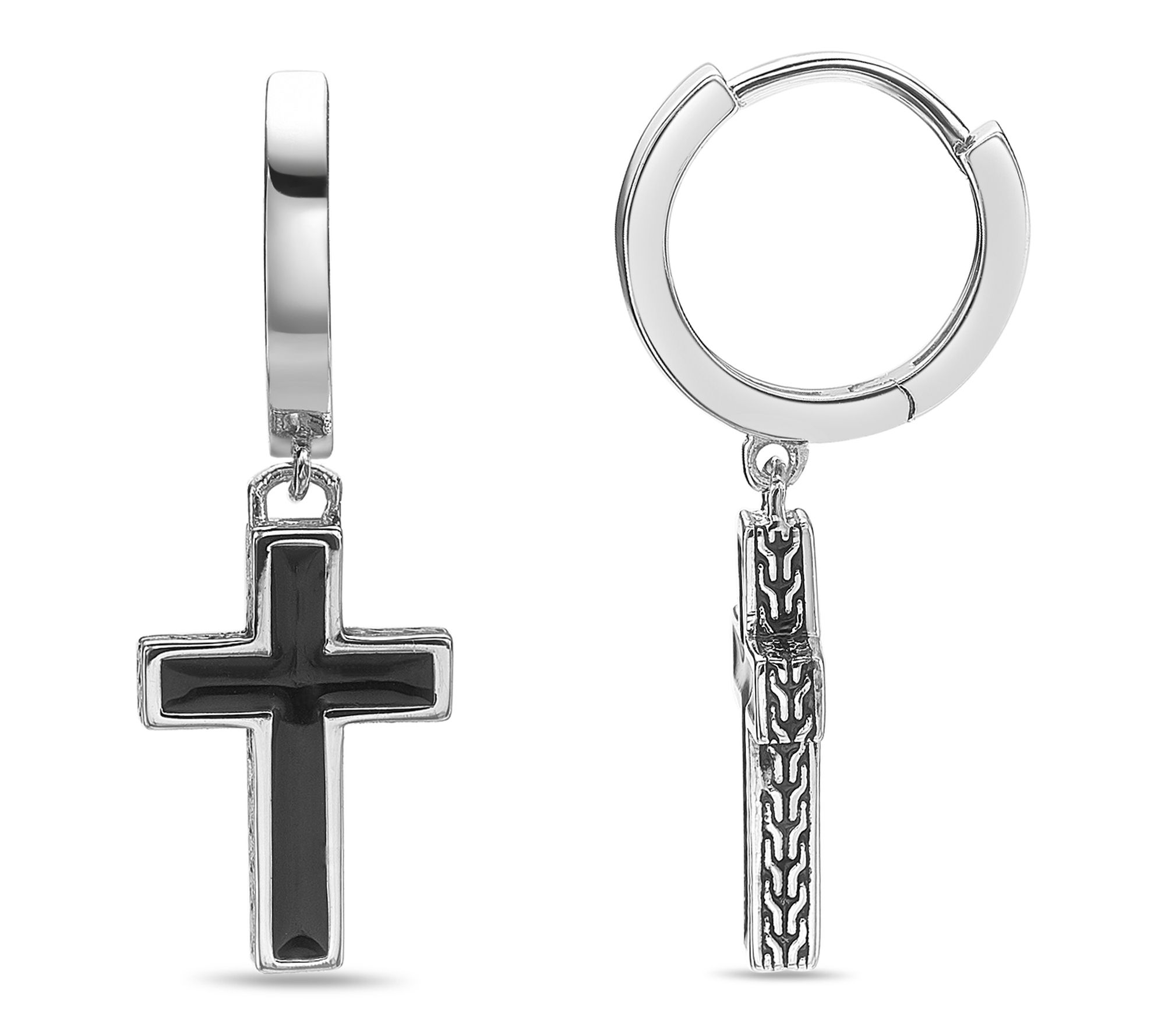 LYNX Men's Sterling Silver Black Cross Dangle Earrings