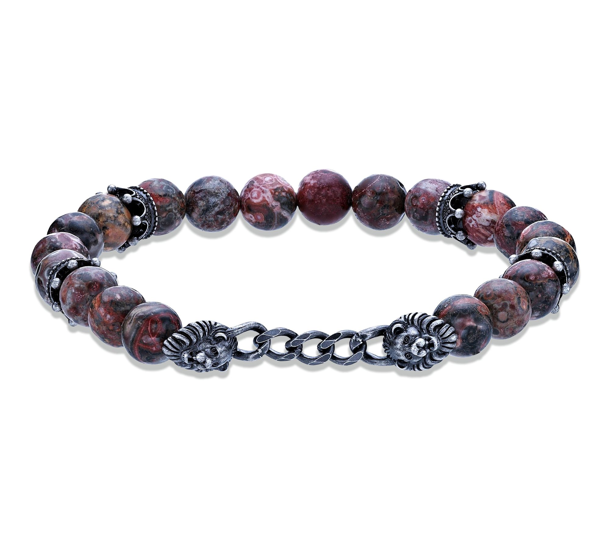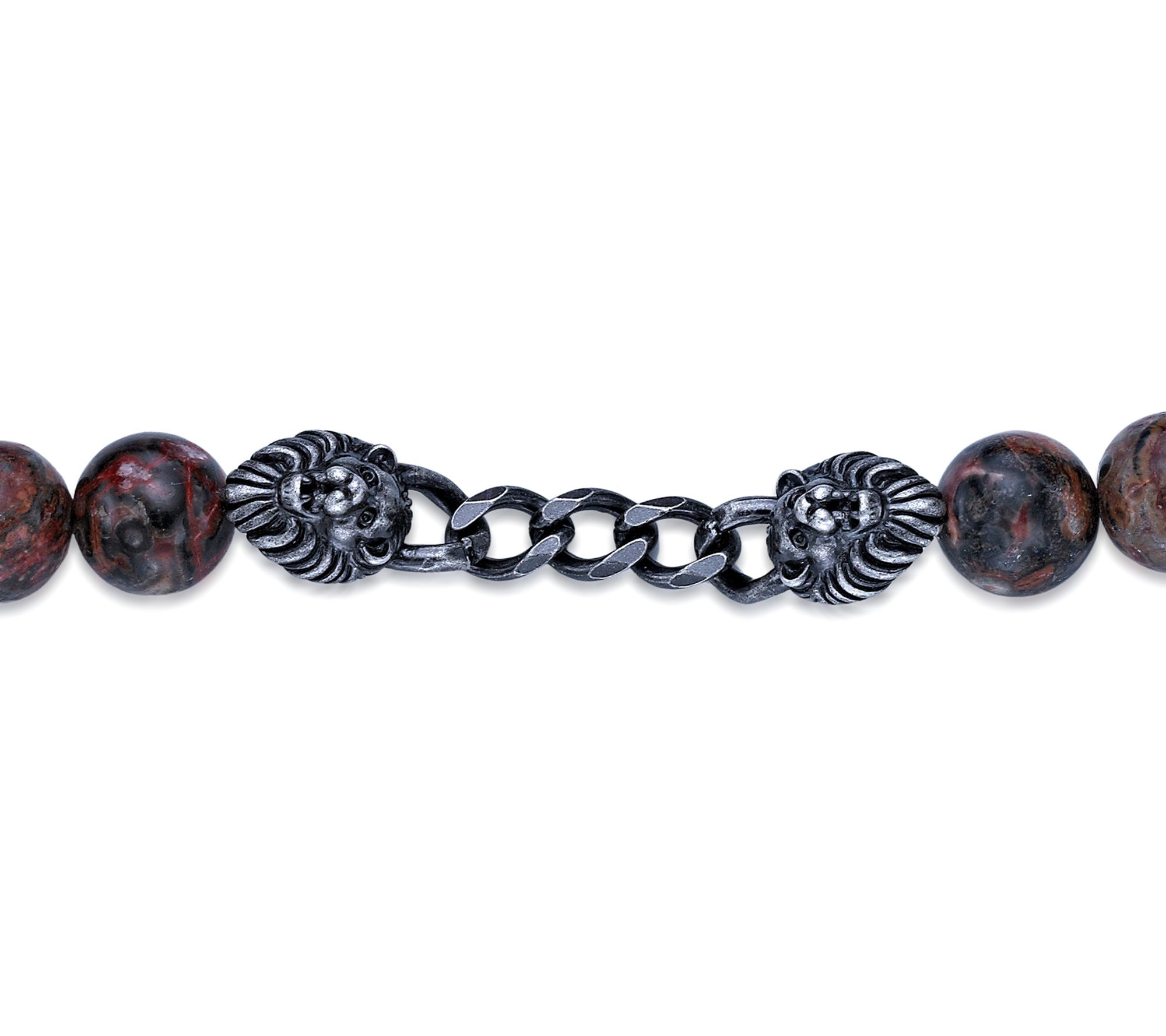 • Round jasper gemstone beads; sterling silver lion head accents; stretch design