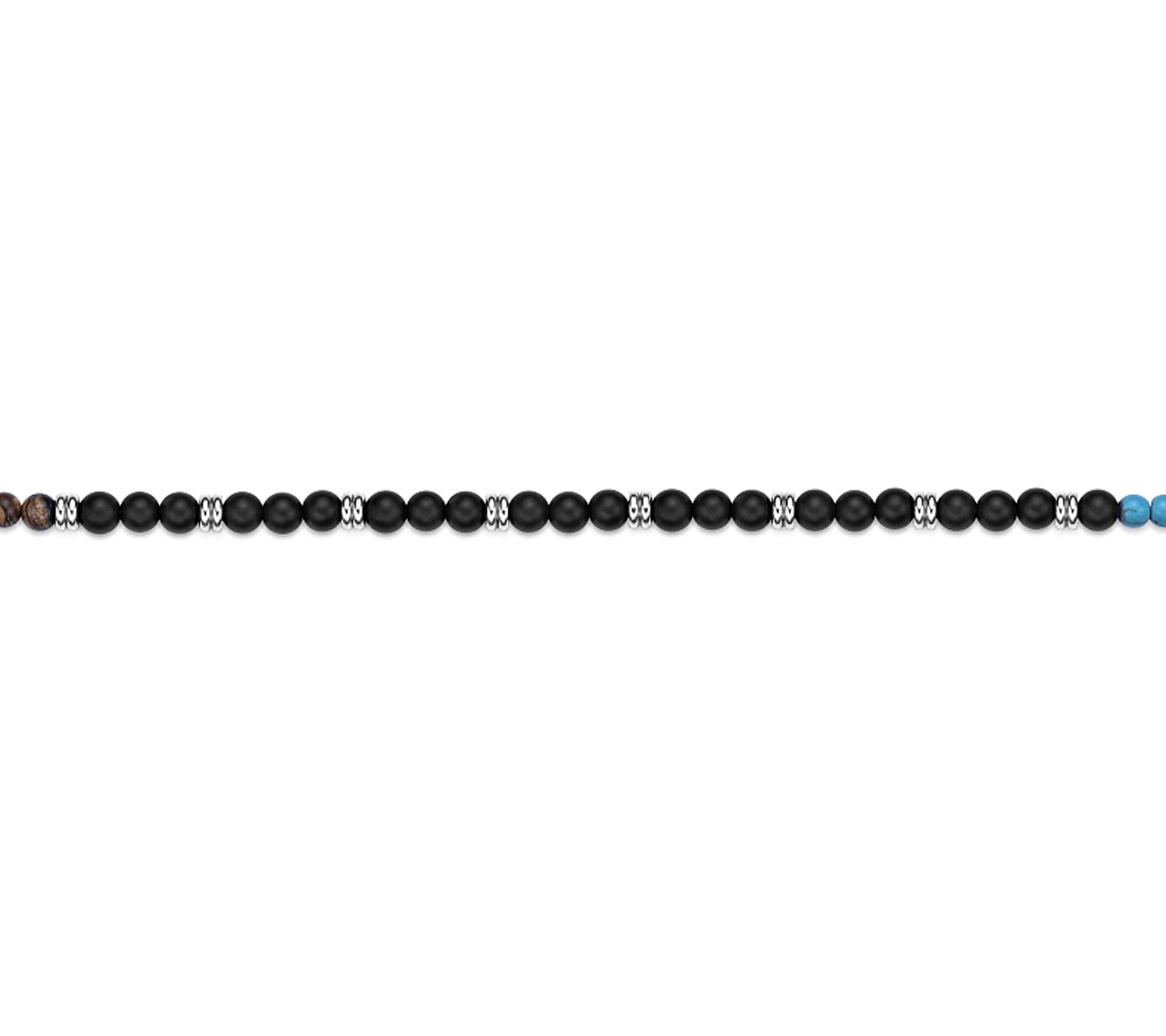Where casual artistry meets versatile style, this men's sterling silver bead necklace combines picture jasper, black agate, and simulated turquoise beads with polished silver accents for a refined touch. Effortlessly transition from everyday outings to special events, wearing it solo for understated confidence or layered for a personalized statement. From LYNX.