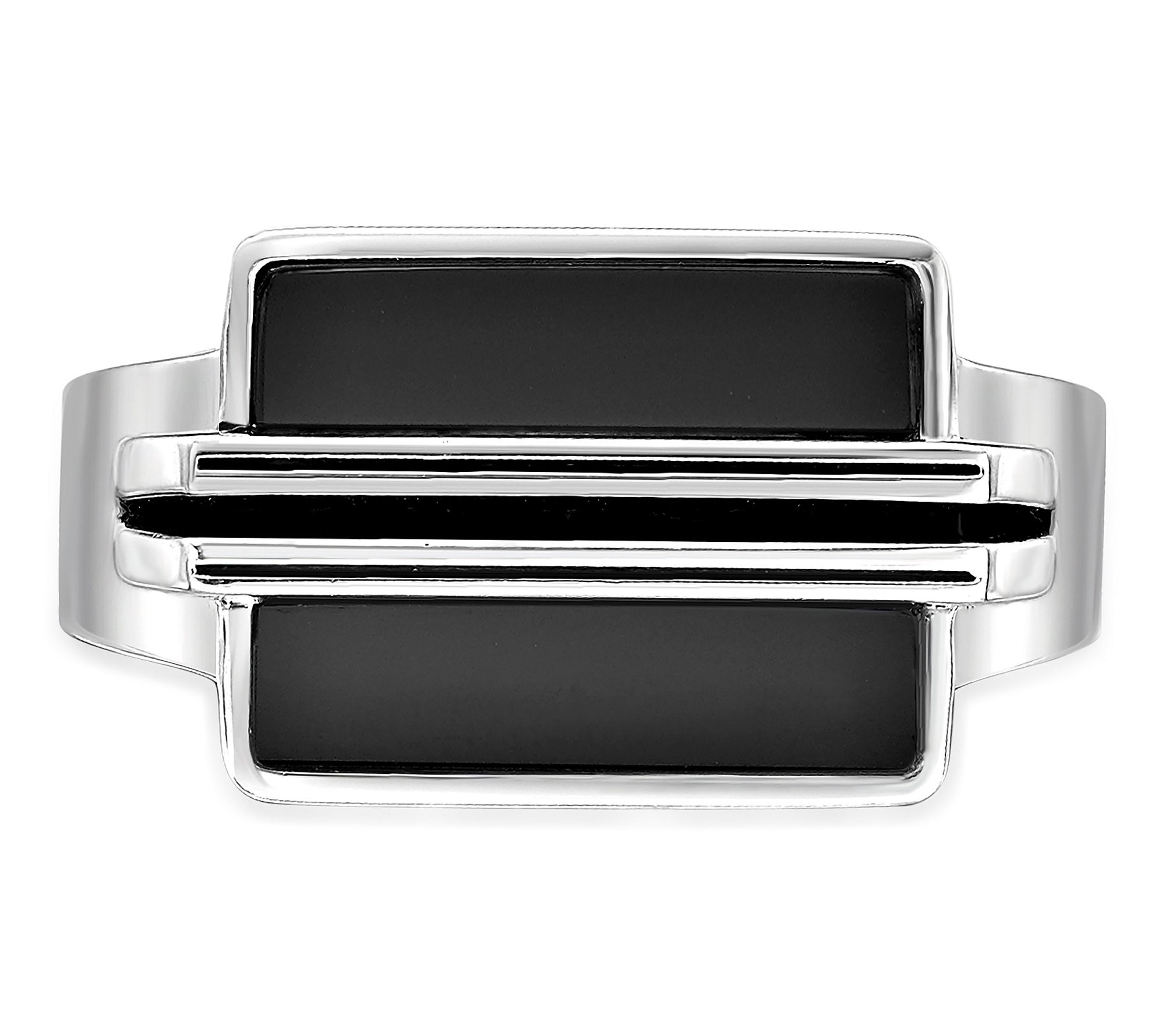 Rectangle, bezel-set black onyx in center with resin detail; polished finish; contemporary signet design