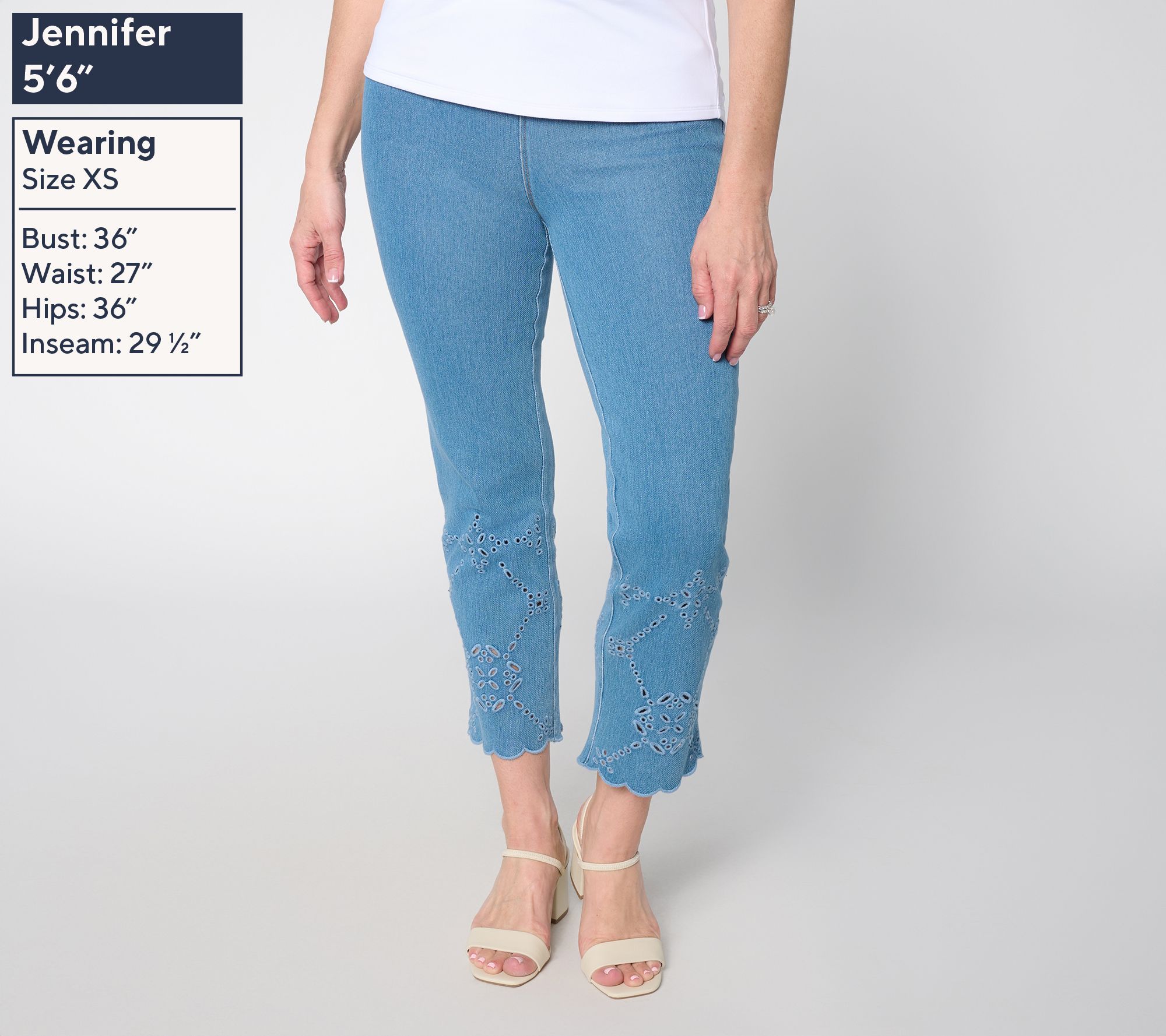 Features: pull-on style, knee-to-hem eyelet embellishments, concealed waistband, cropped, faux front pockets, beltloops, back yoke
