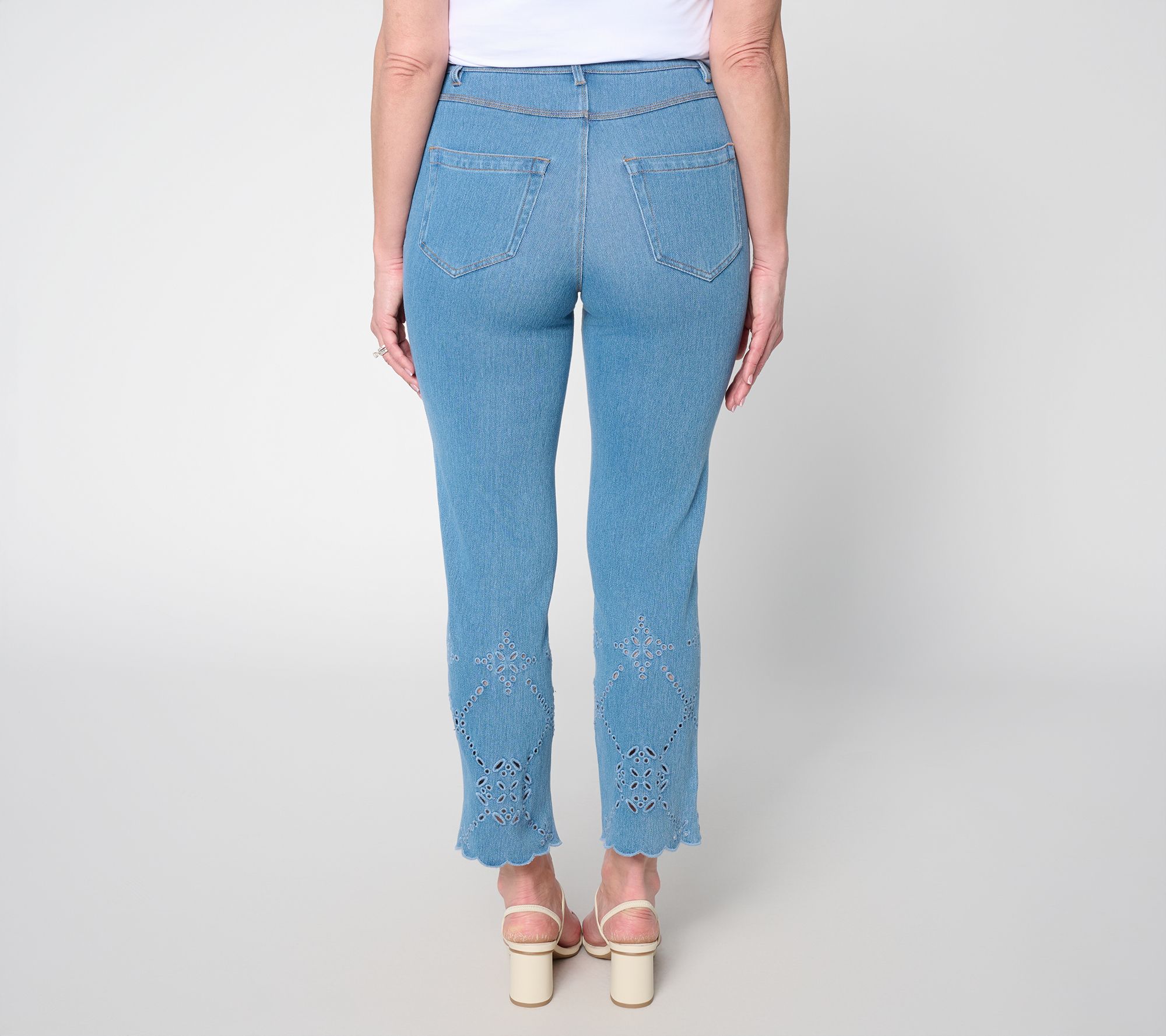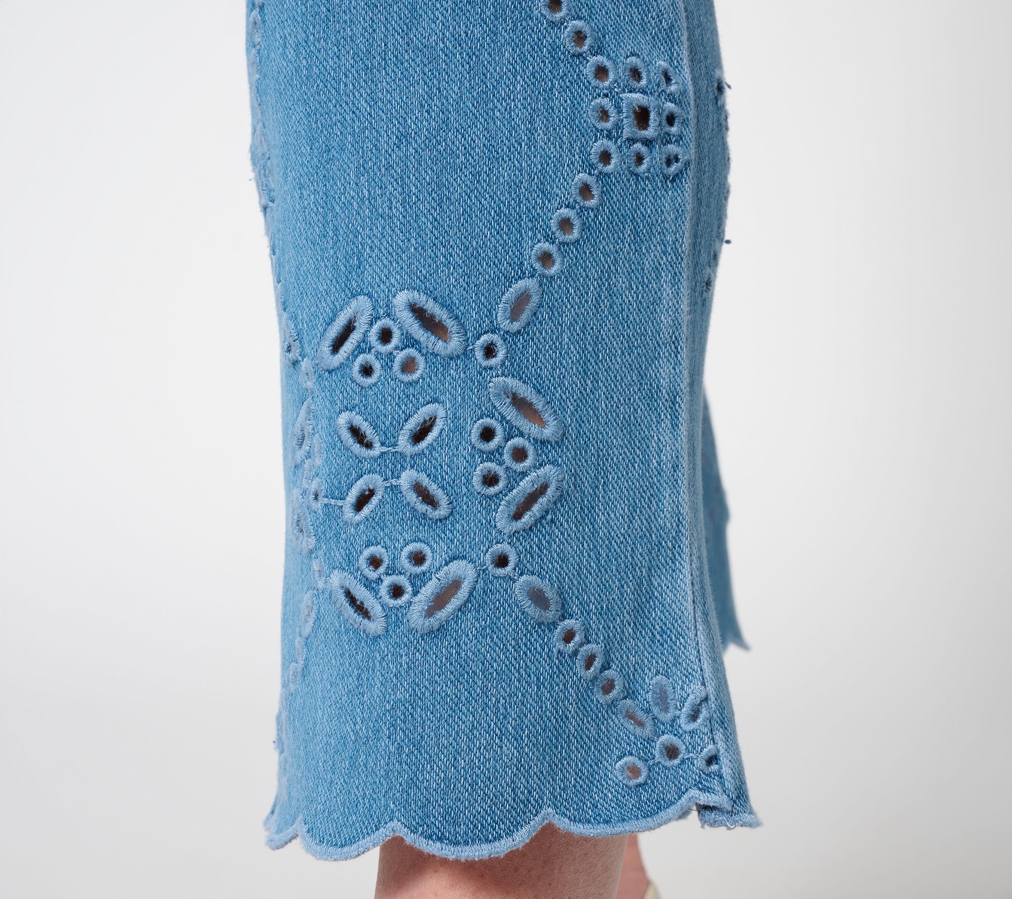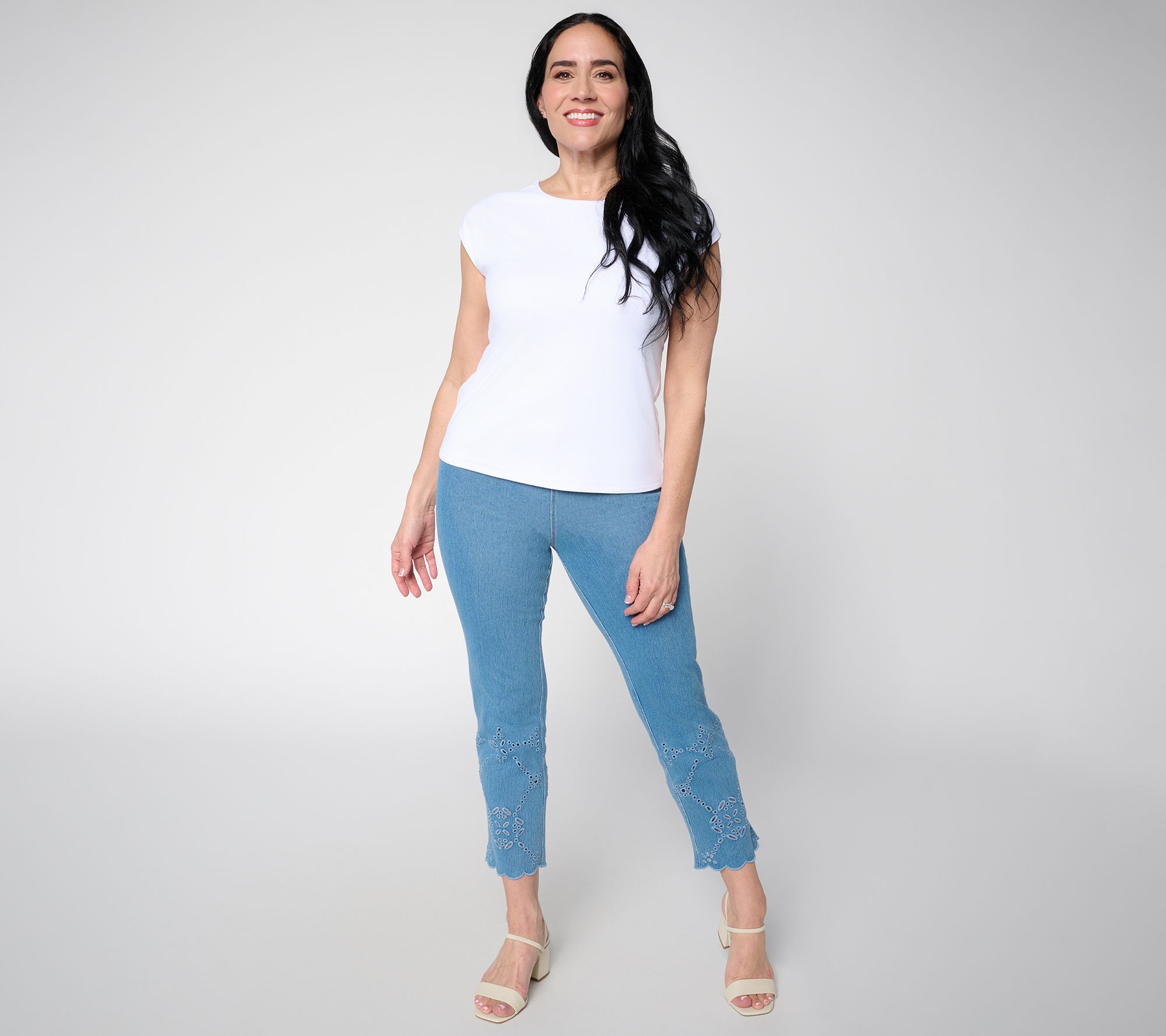 Take your everyday looks up a notch with these cropped denim pants featuring playful eyelet details from knee to hem. Whether paired with a breezy tee for errands or dressed up for brunch with friends, the four-way stretch knit keeps you comfortable and confident all day. From Lysse New York.