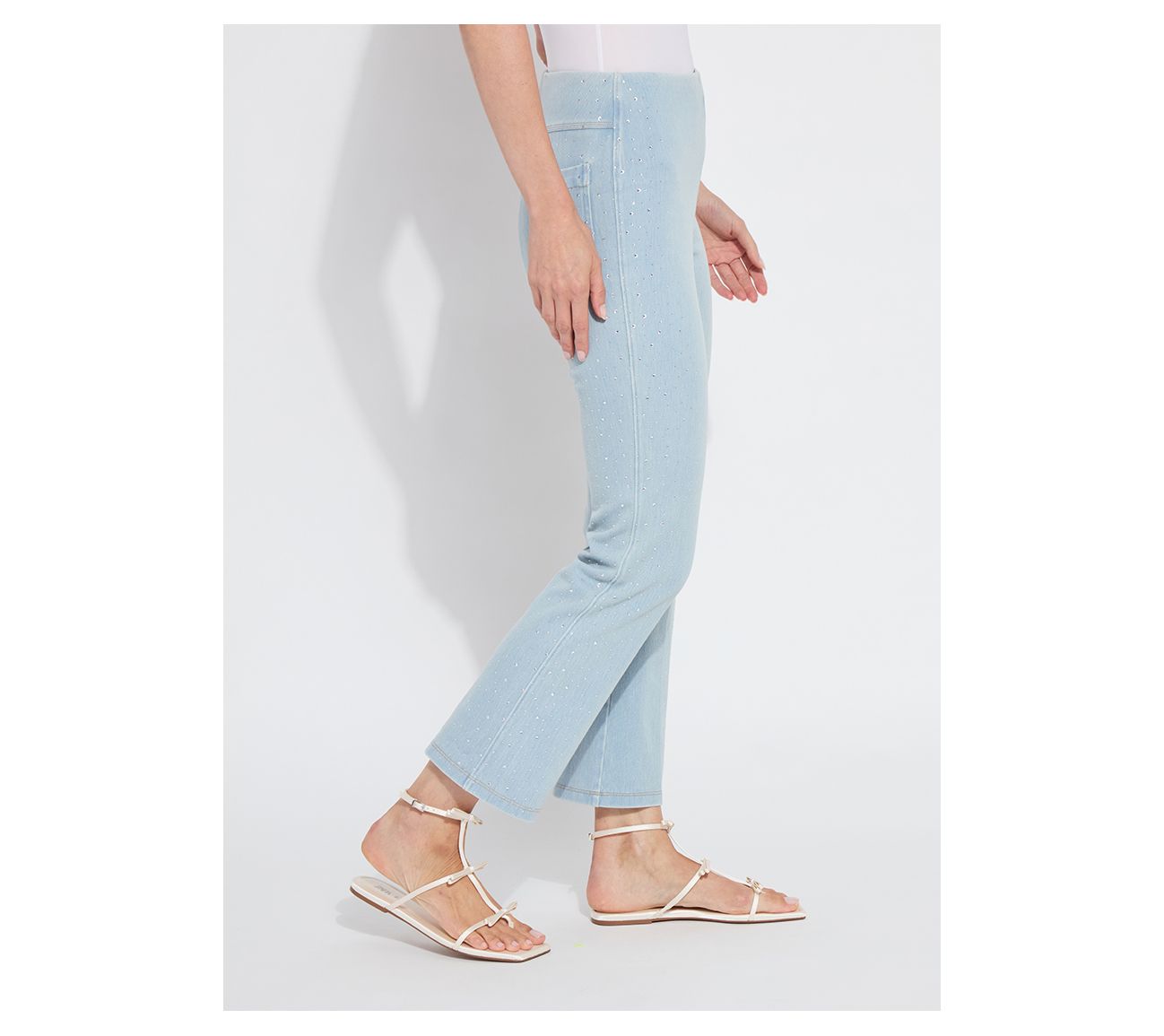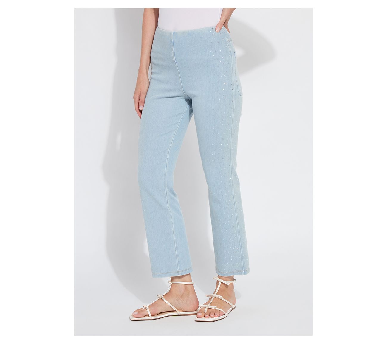 Step into the spotlight with Lysse New York crystal-embellished ankle baby boot jeans. These jeans bring a touch of glamour to your everyday wardrobe with clear crystals adorning the side panels in a unique raindrop pattern. Designed with a concealed patented waistband and flat front, they offer a sleek look that skims your waist and hips before flowing into a bootcut hem. Pair them with your favorite top and turn heads whether you're out for a casual brunch or an evening stroll. From Lysse New York.