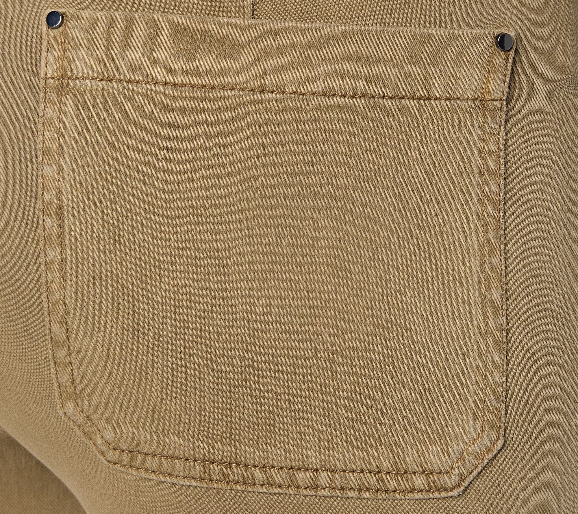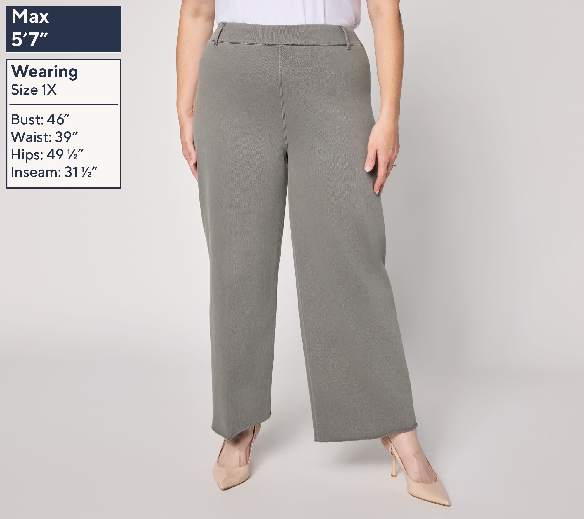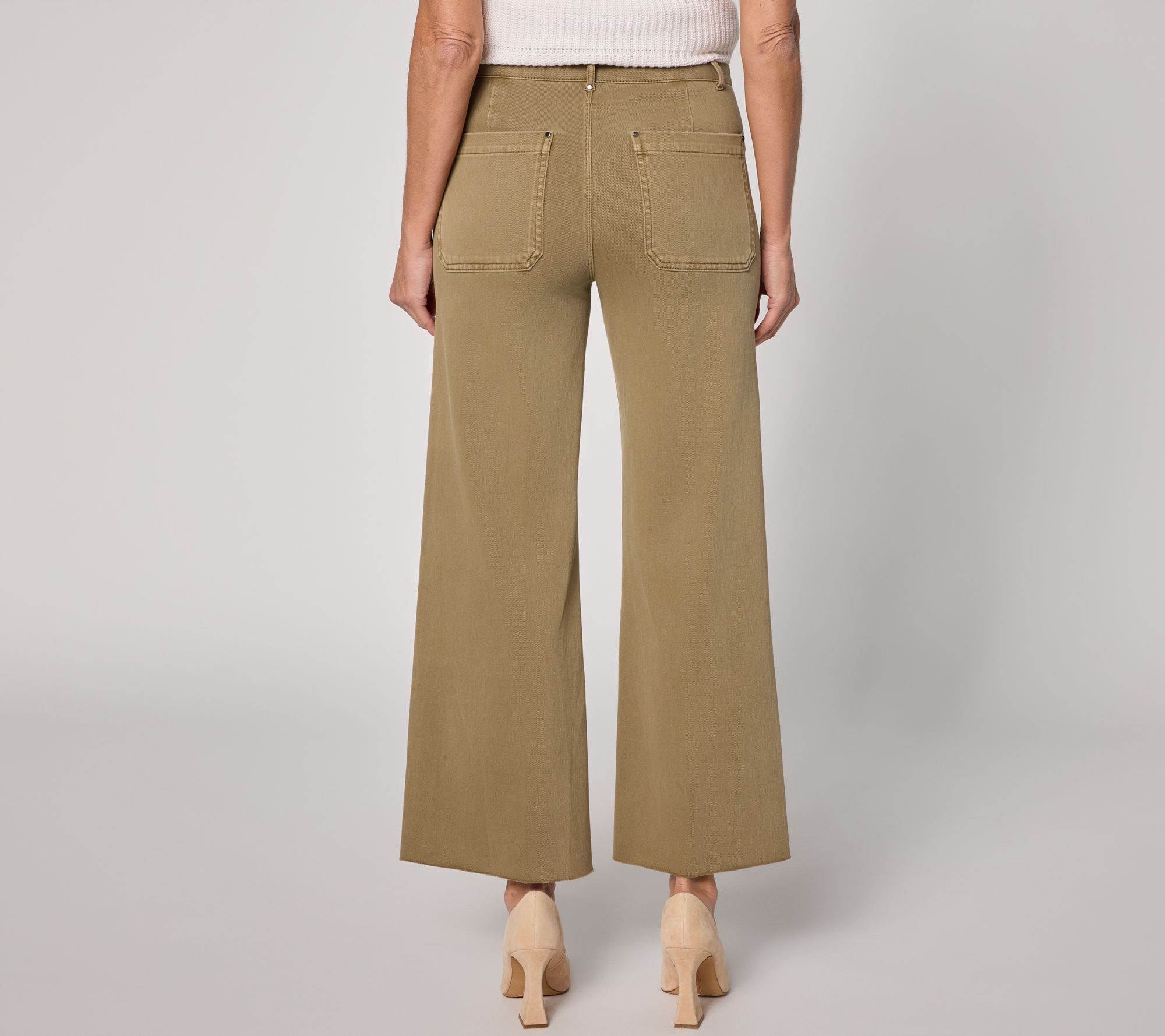 Features: pull-on style, four-way stretch, high-waisted with concealed waistband, back patch pockets, belt loops, raw edge hem, no side seams, crop length
