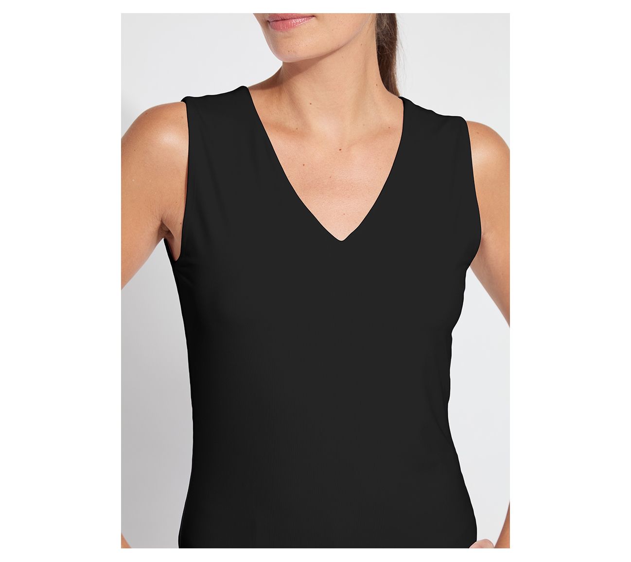 This V-neck tank is your year-round layering staple, offering four-way stretch for easy movement and COOL-FRESH Jersey comfort. Wear it solo for sun-filled afternoons or slip it under a blazer as you head to the office -- the double front panel provides confident coverage wherever the day takes you. From Lysse New York.
