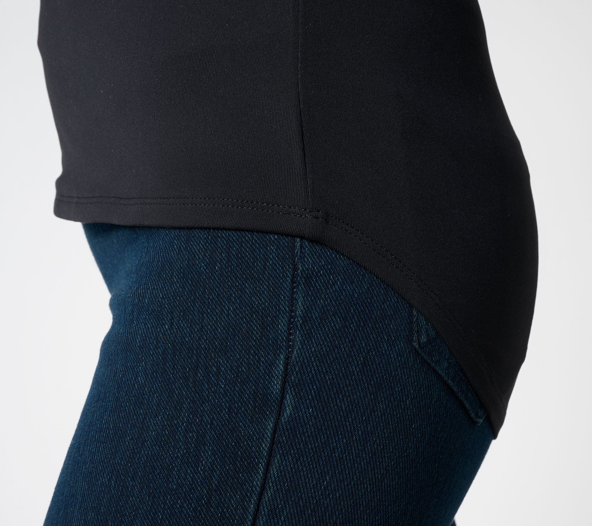 Features: scoop neckline, cap sleeves, drop-shoulder detail, high-low hem, double self front, four-way stretch