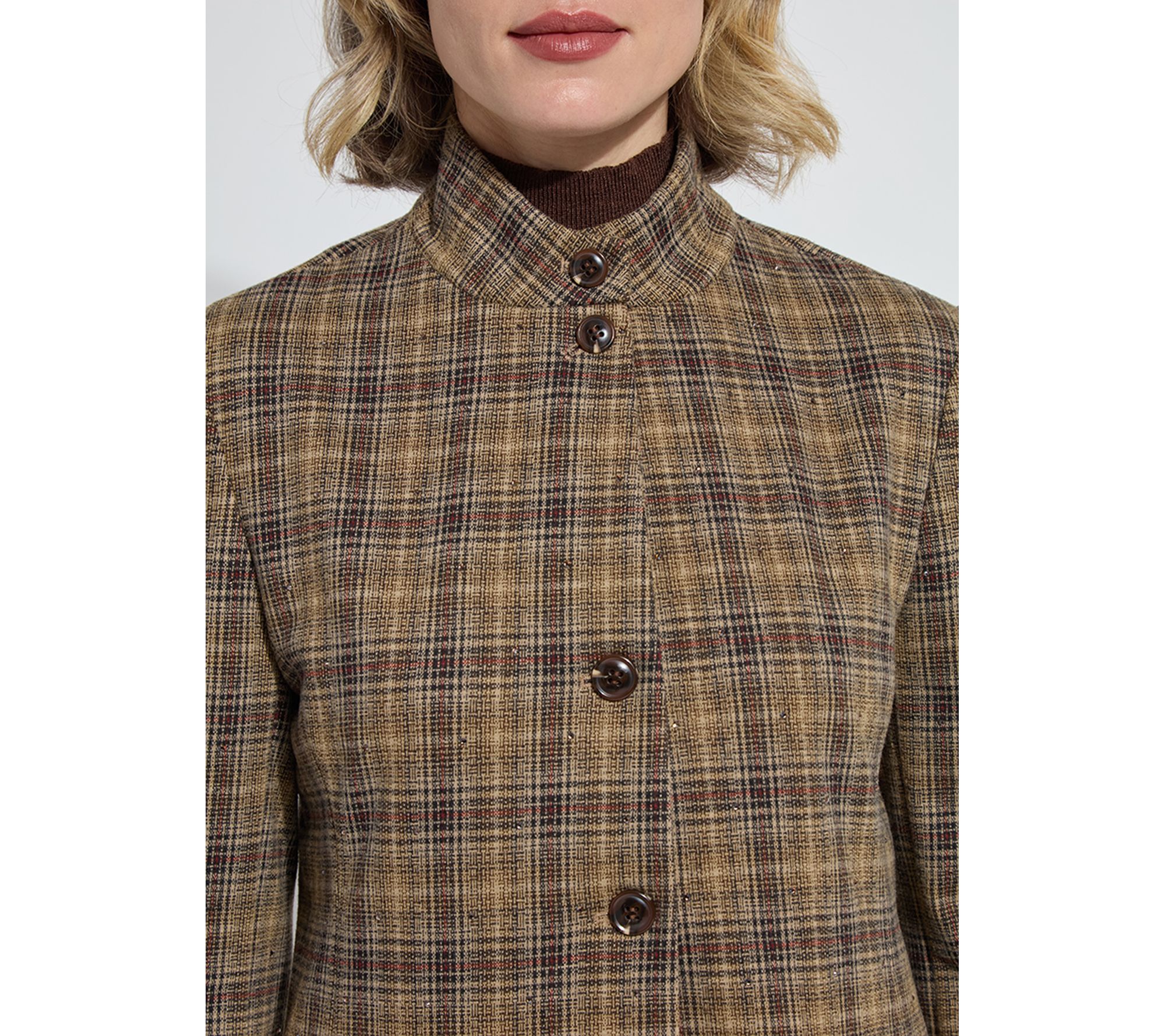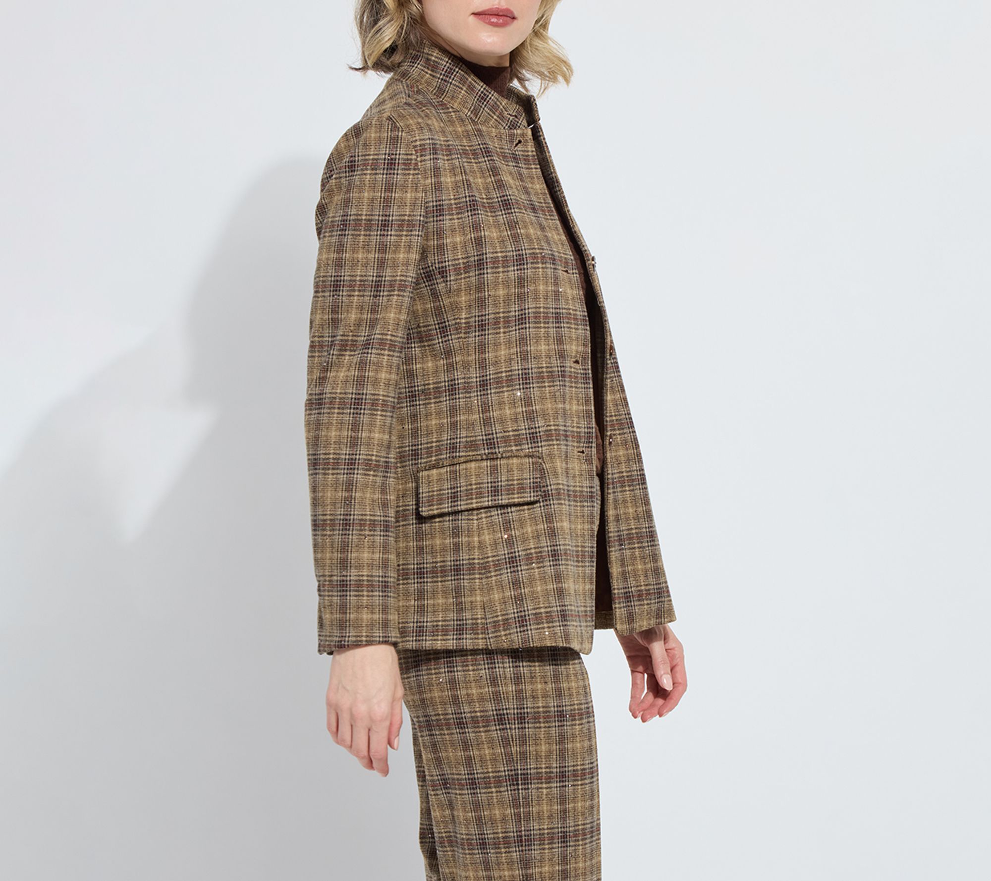 Whether you're headed to the office or dressing up for a night out, this blazer brings British-inspired flair to any occasion. Its convertible collar lets you switch up your look, while copper rhinestone crystal accents add a festive, feminine touch. From Lysse New York.