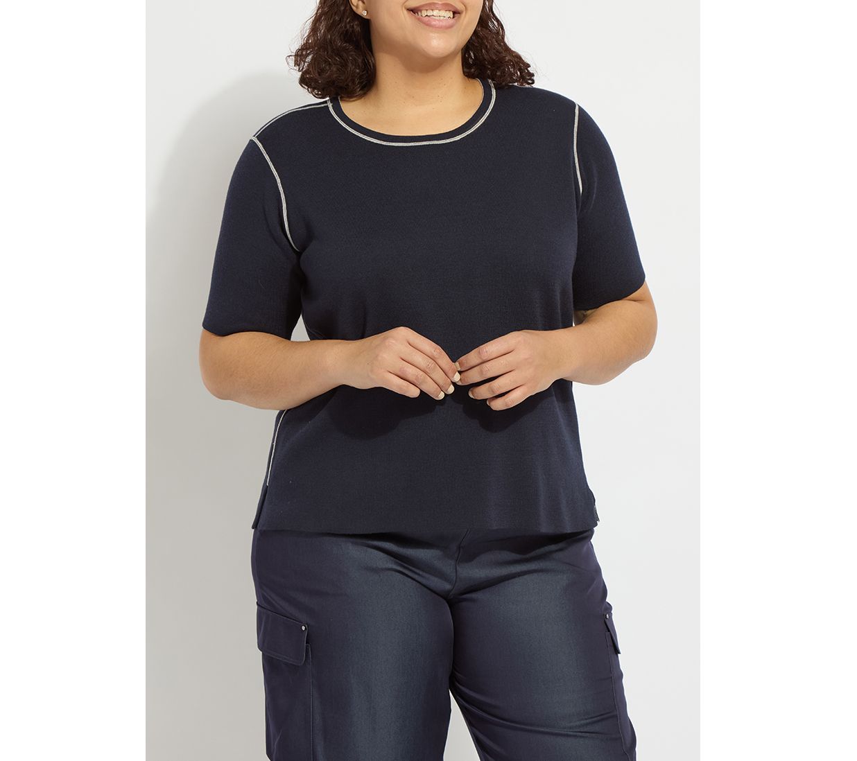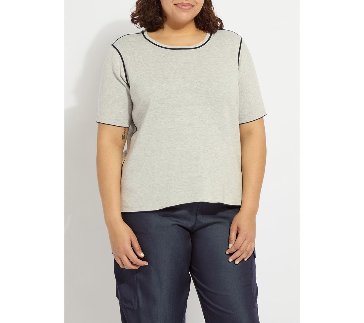 • Features: reversible, short sleeves, boxy silhouette, crew neckline, center-back seam
