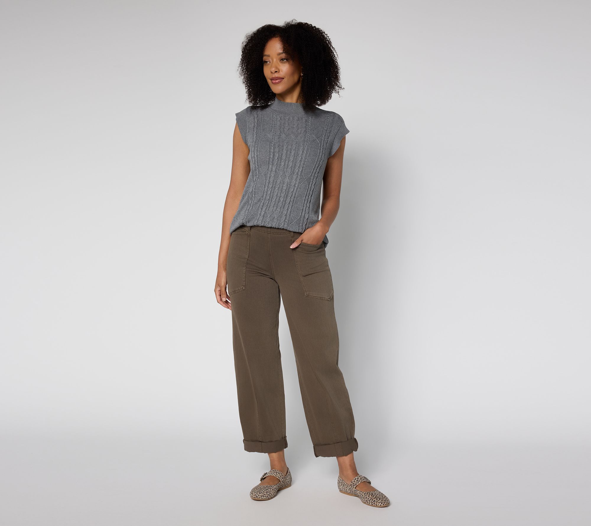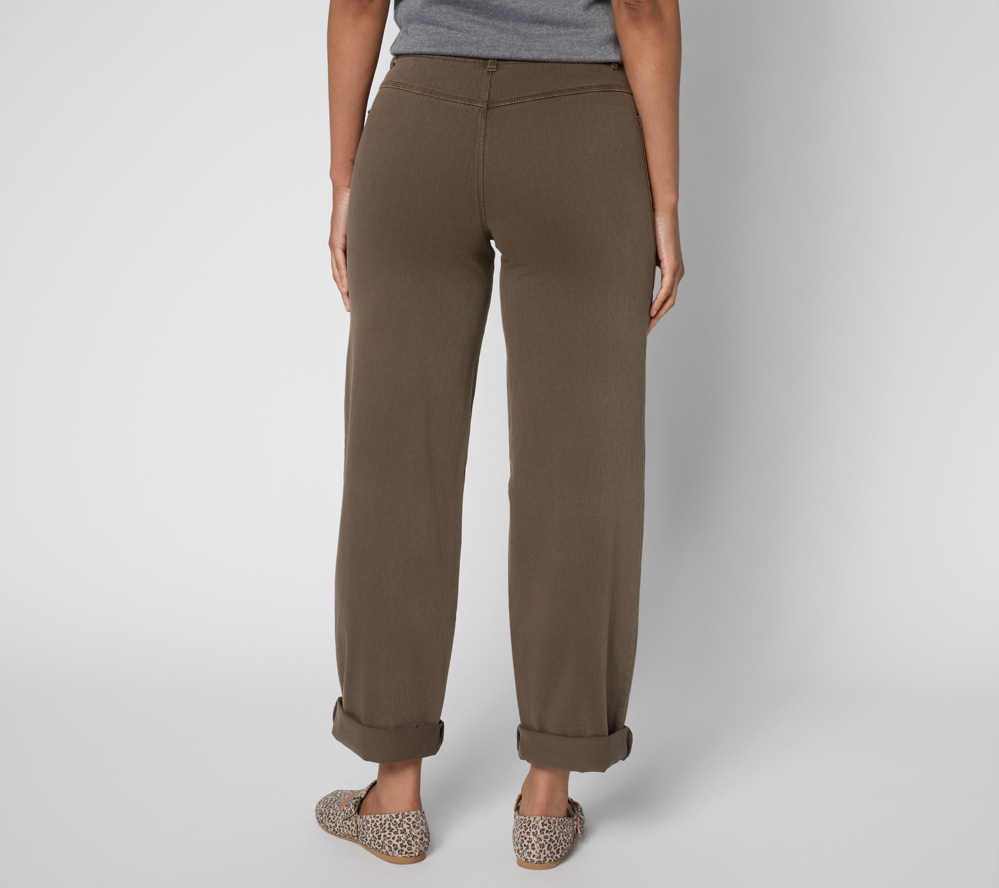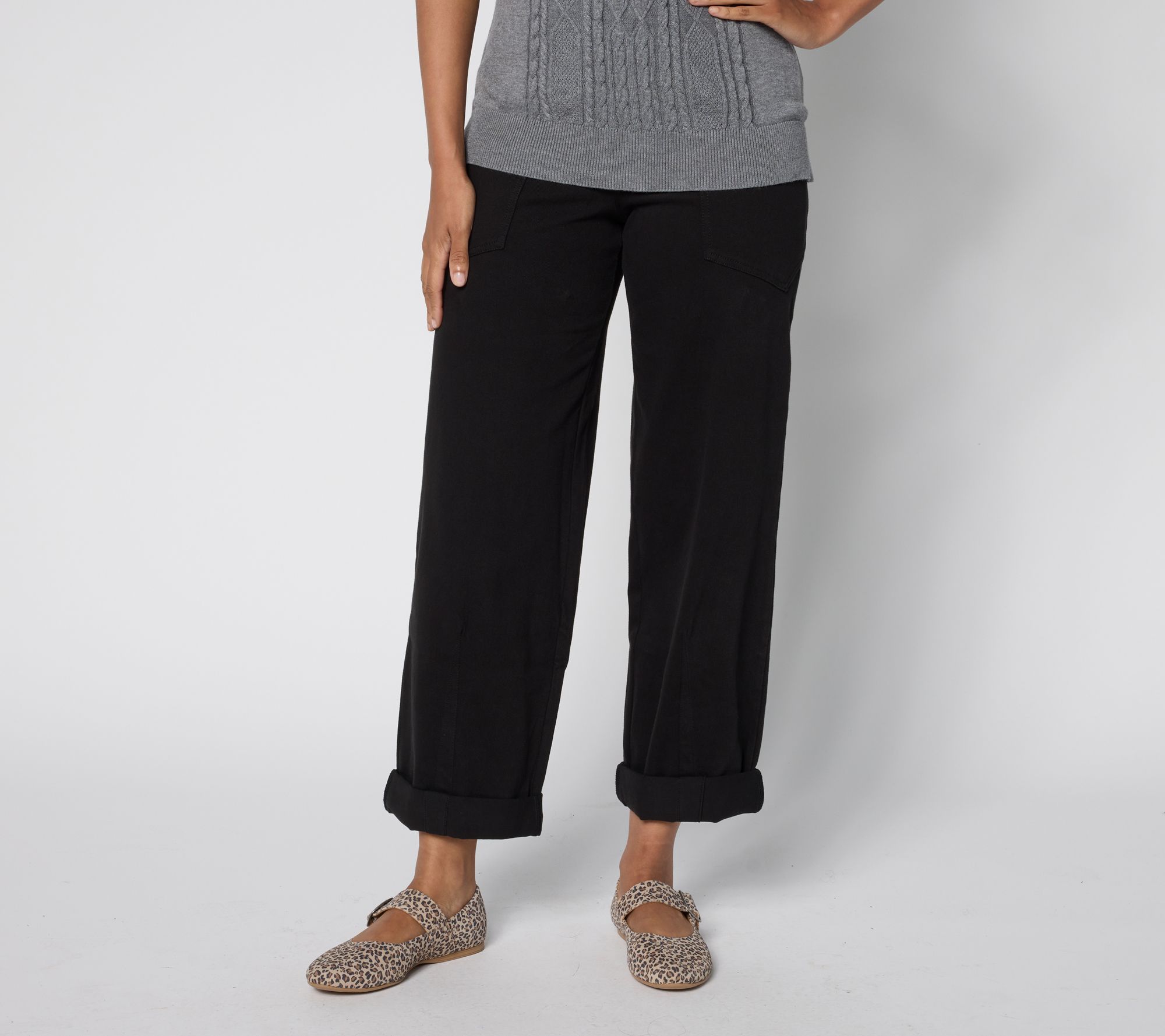 When your calendar's packed, pick Penelope. These knit denim pants make it easy to move from one activity to the next while keeping you looking polished and on point. Their curved cuff frames your footwear perfectly -- from ballet flats to booties. From Lysse New York.