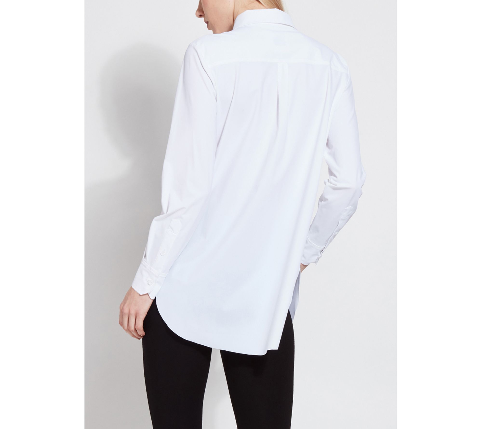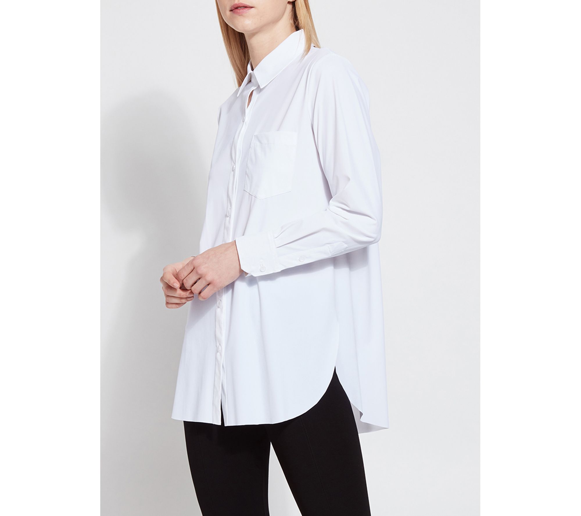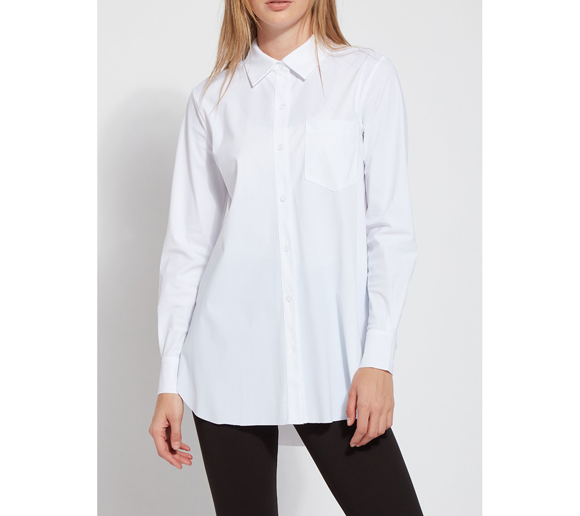 Look polished in a flash when you pair this classic button down with your favorite pants or leggings. Featuring a generous amount of stretch, a relaxed cut, and a hi-low hemline, it offers all-day comfort and spiffy style. From Lysse New York.