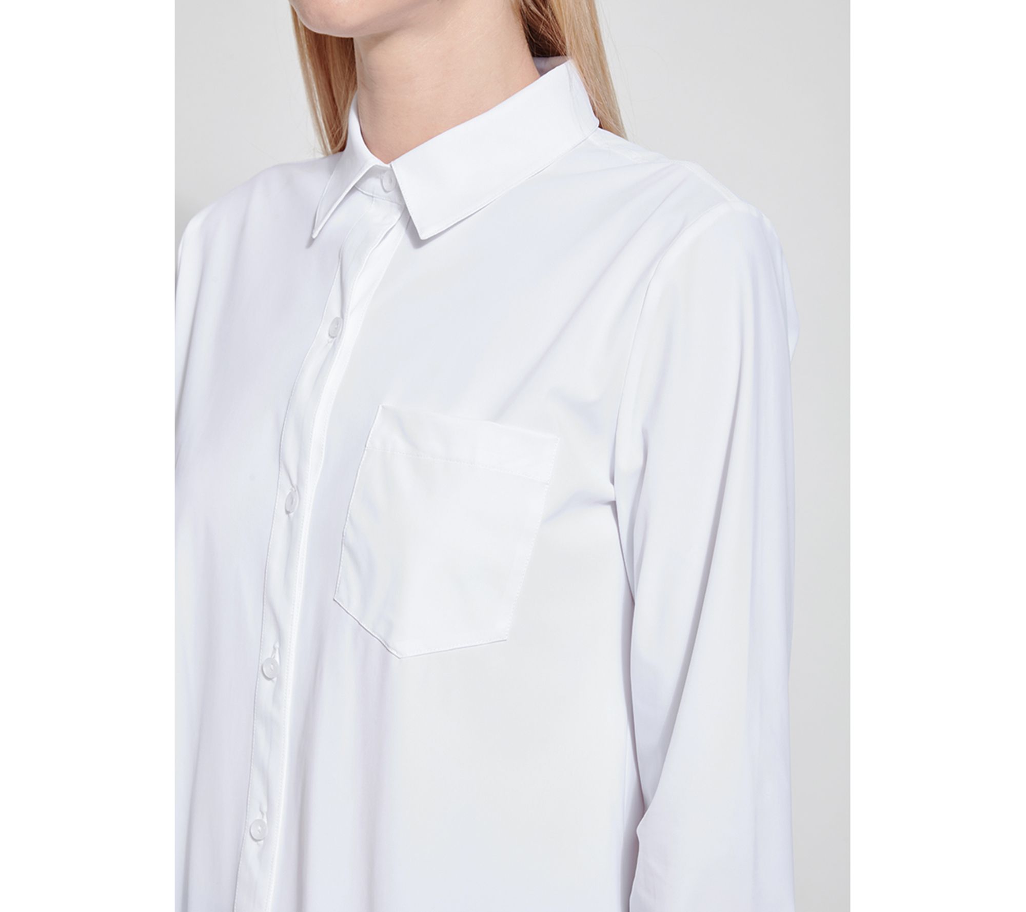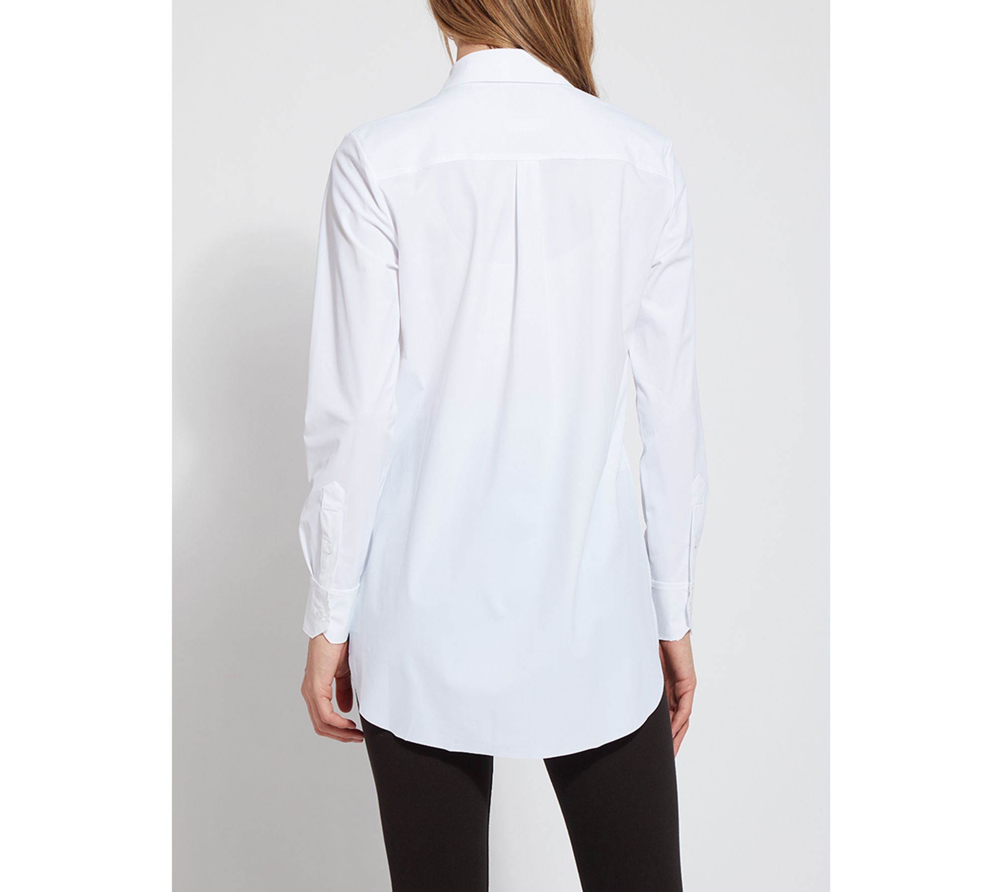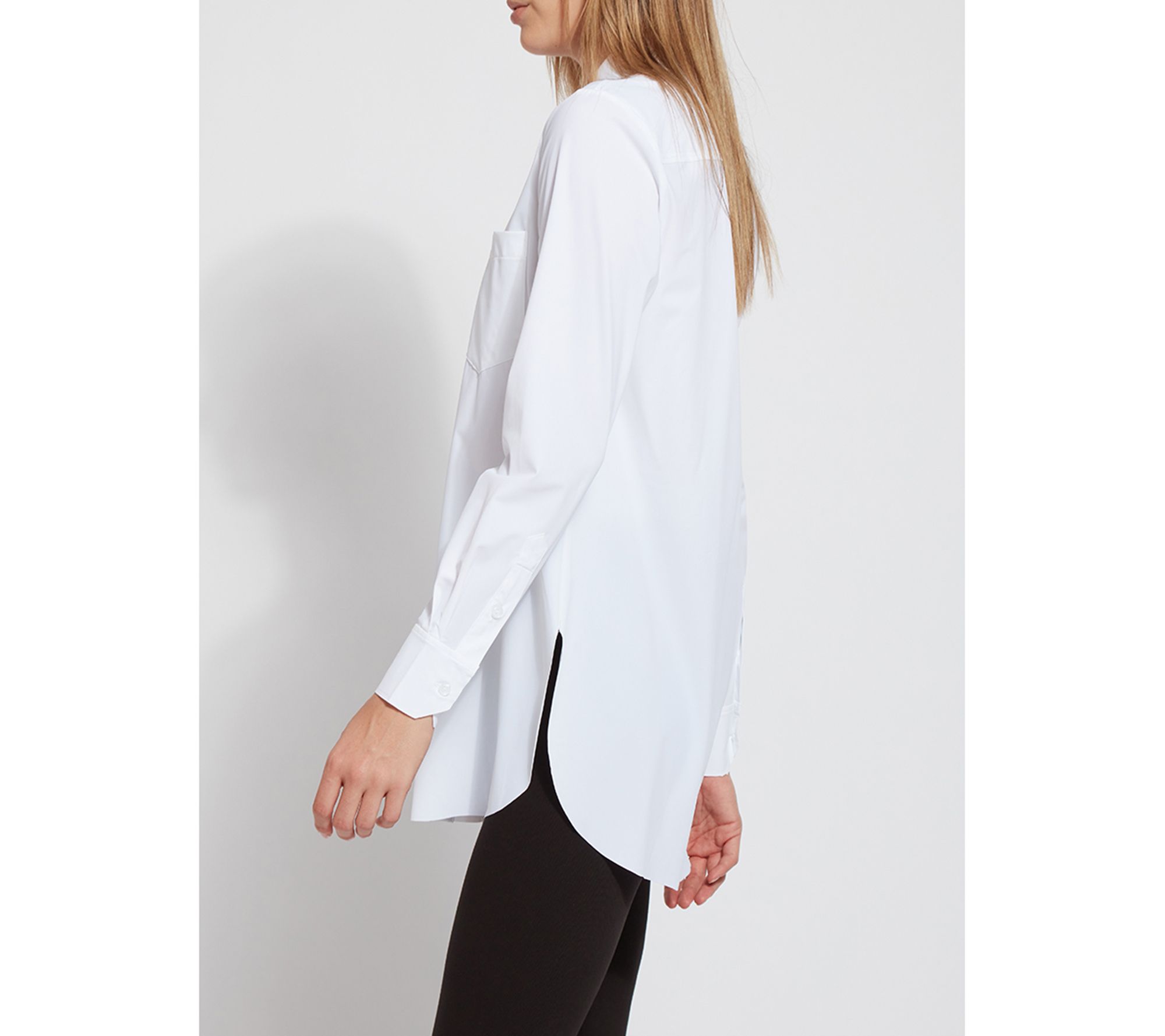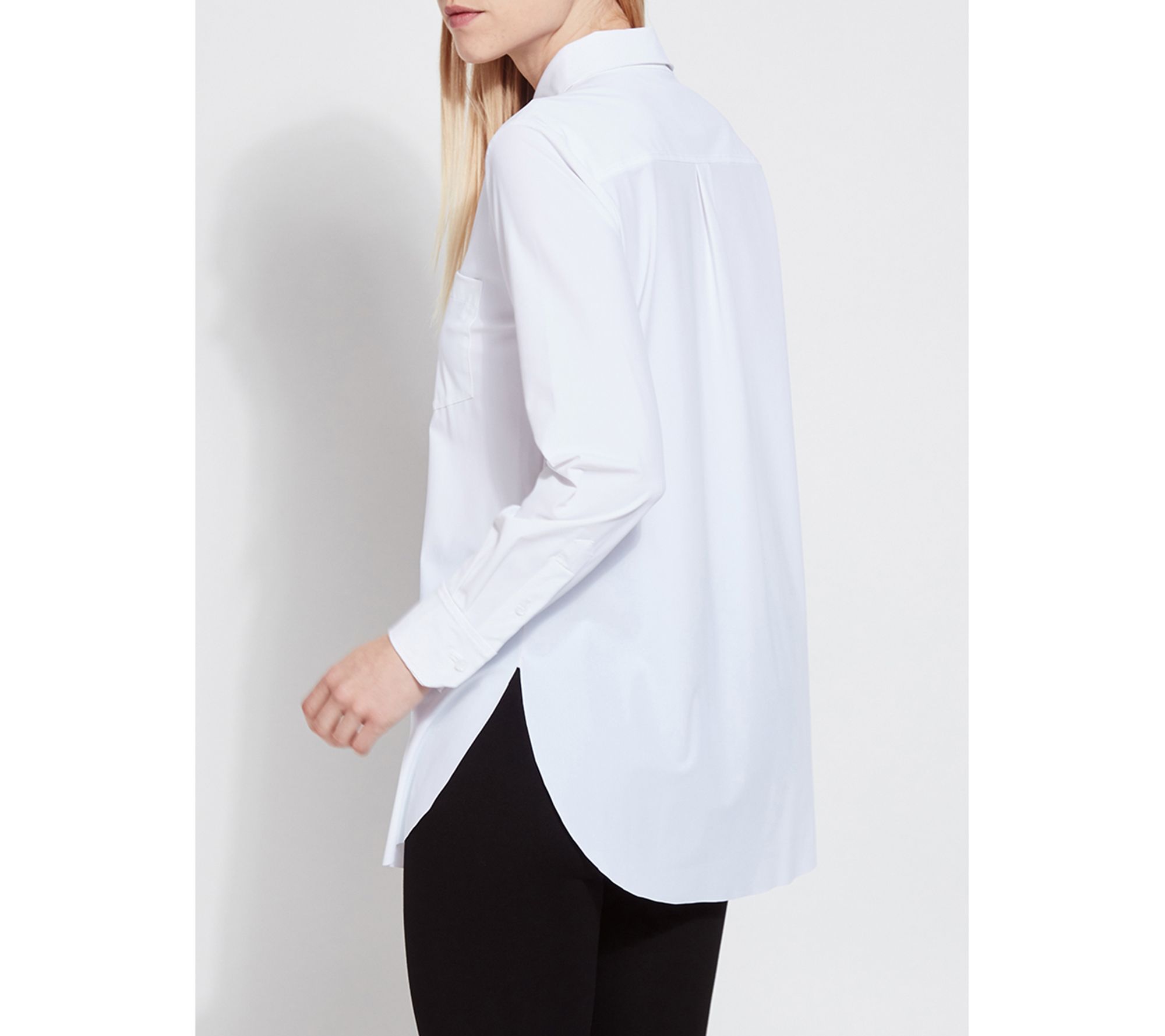 Look polished in a flash when you pair this classic button down with your favorite pants or leggings. Featuring a generous amount of stretch, a relaxed cut, and a hi-low hemline, it offers all-day comfort and spiffy style. From Lysse New York.