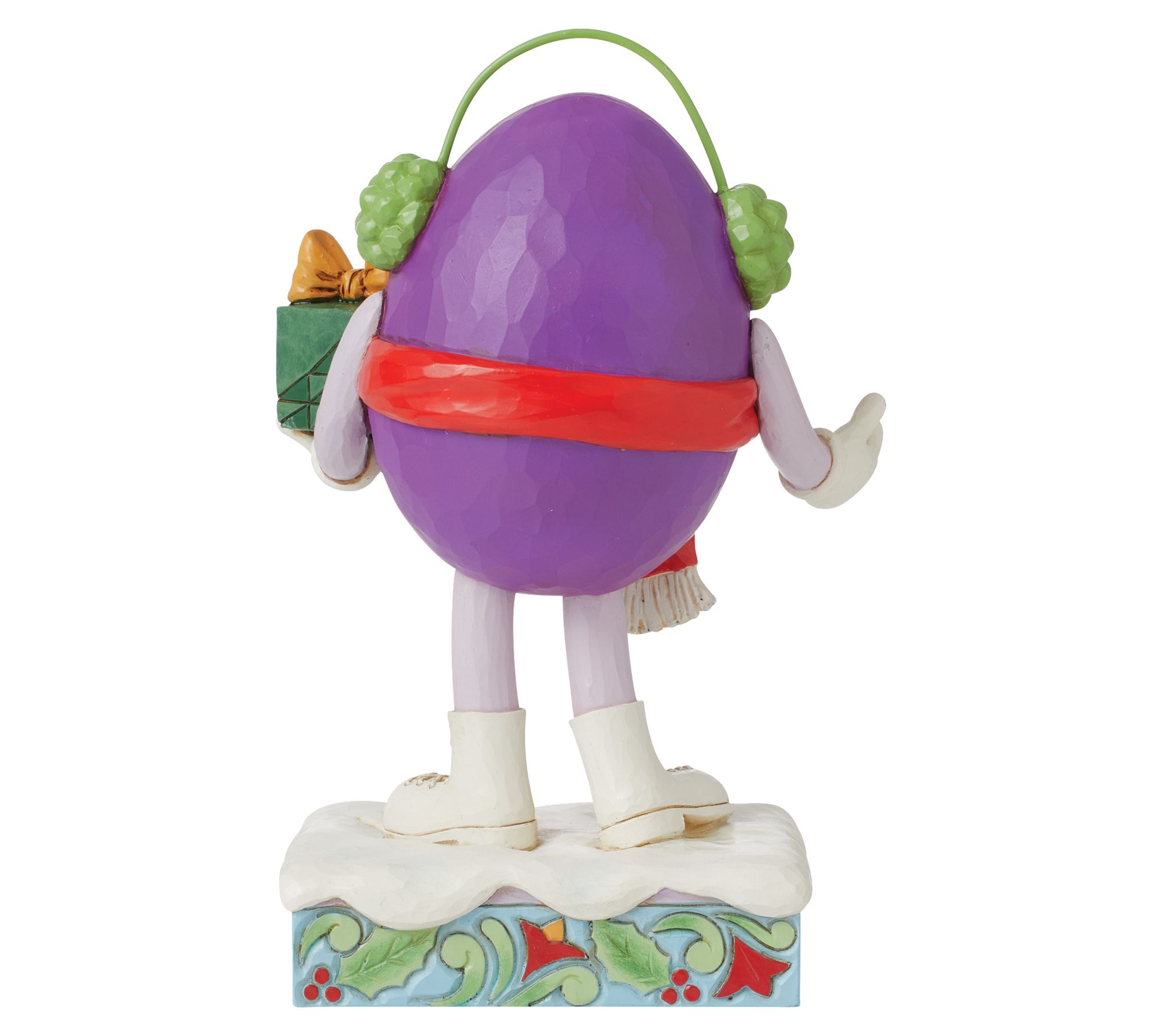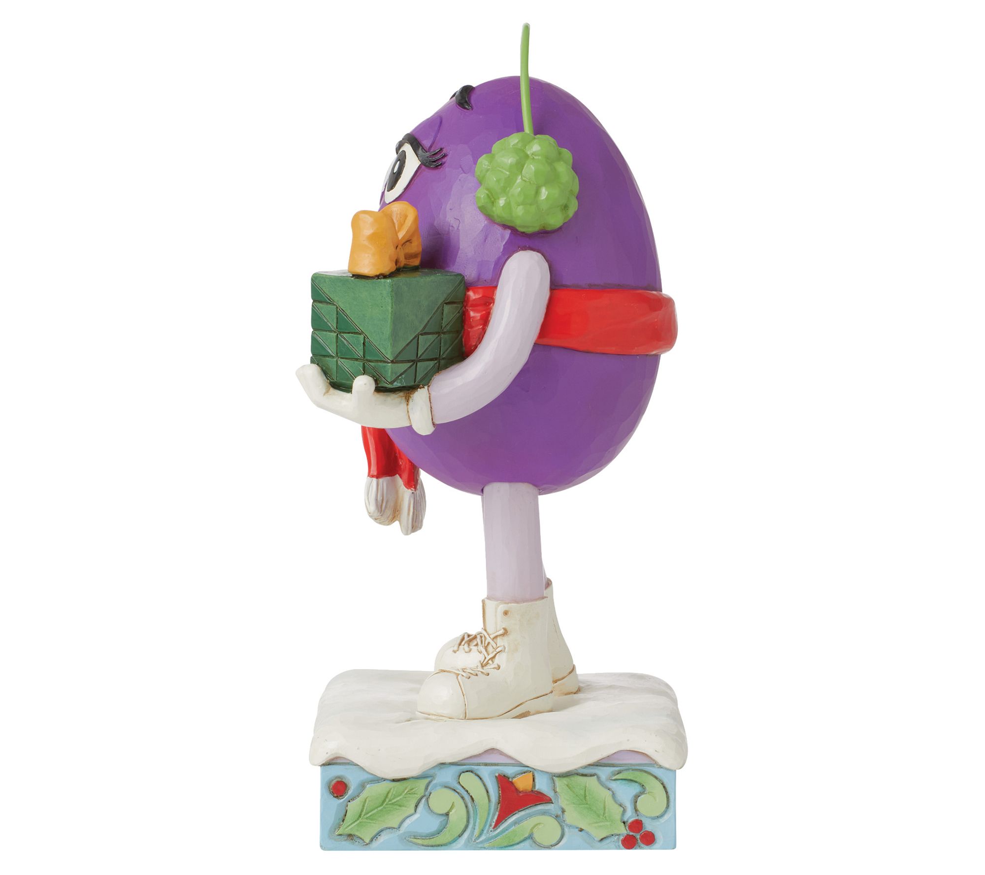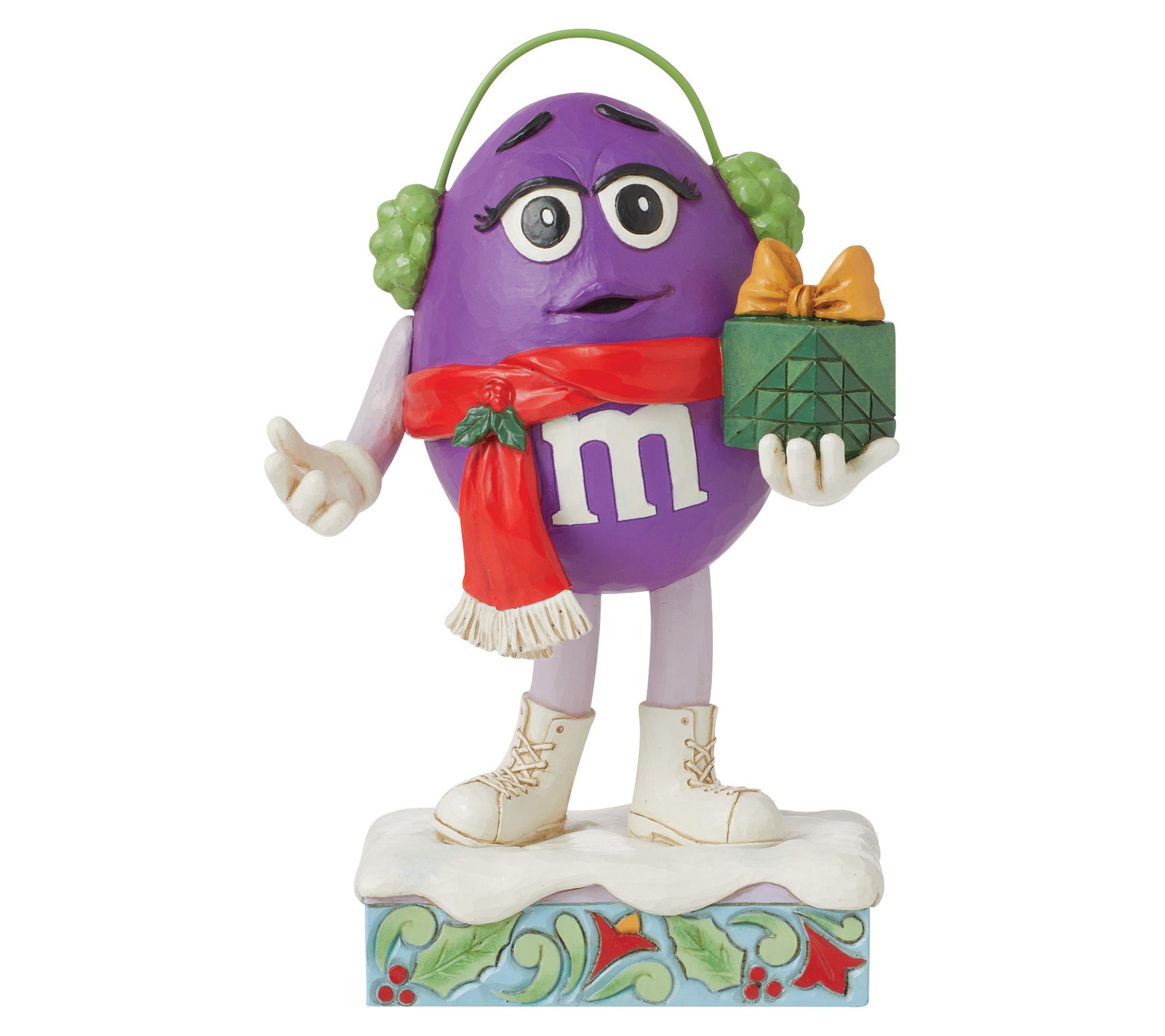 Add a touch of whimsy to your holiday decor with this charming M&M'S by Jim Shore figurine, featuring Purple dressed in festive attire, complete with snow boots, a holiday scarf, and green earmuffs, all while holding a beautifully wrapped gift. From the M&M'S Collection by Jim Shore.