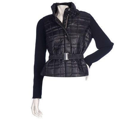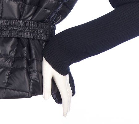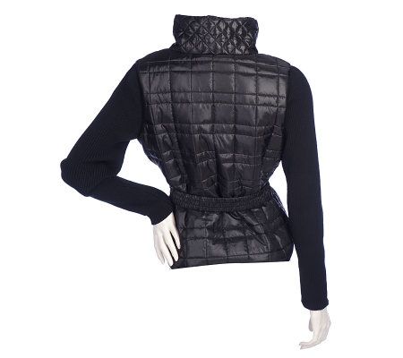 Bundle up in style. This jacket's quilted body and ribbed knit sleeves combine the look of a stylish vest with the warmth of a cold-weather coat. From M by Marc Bouwer.