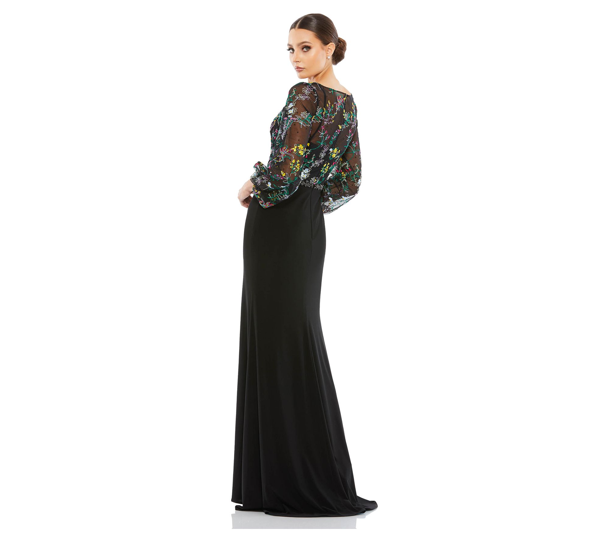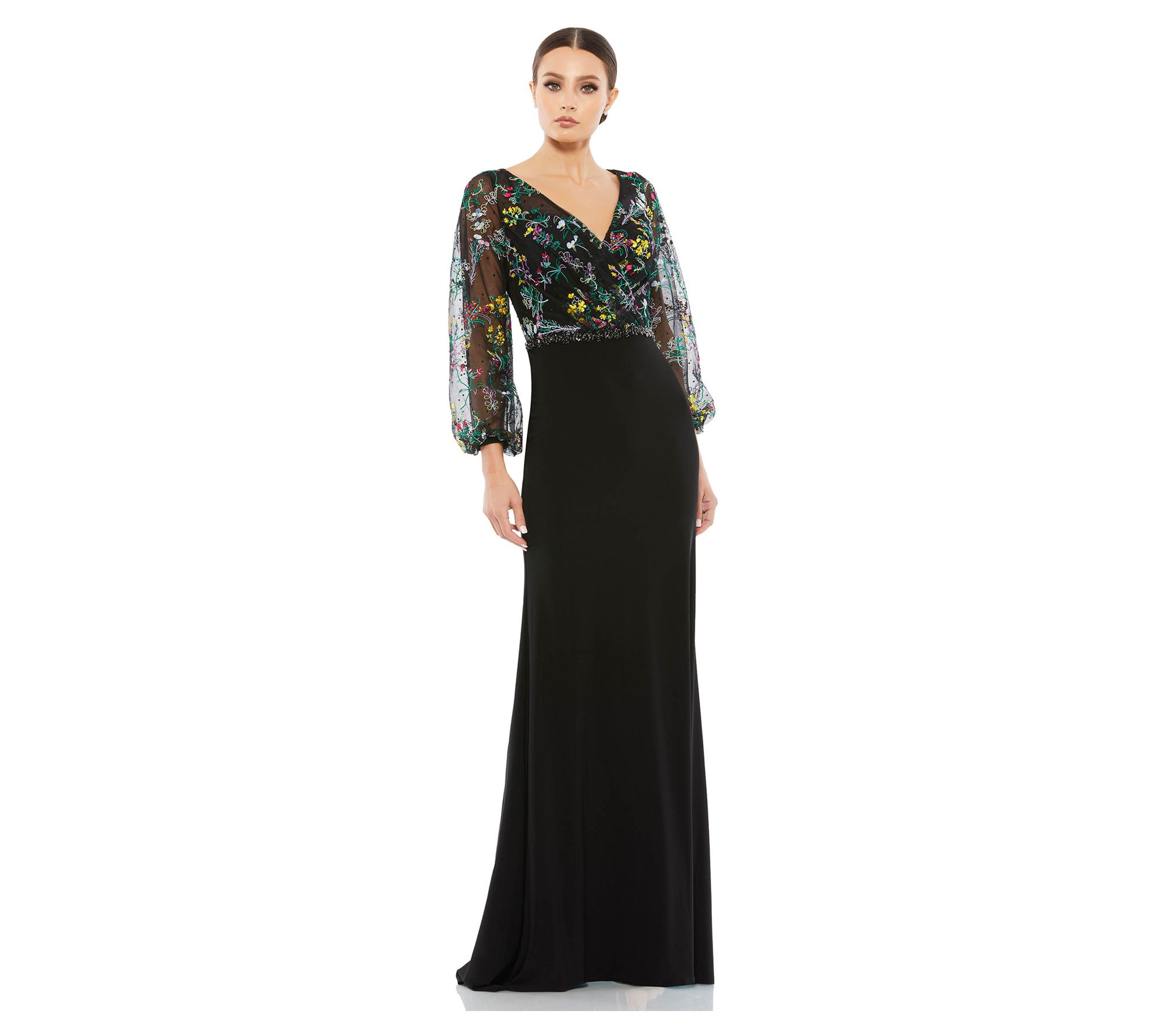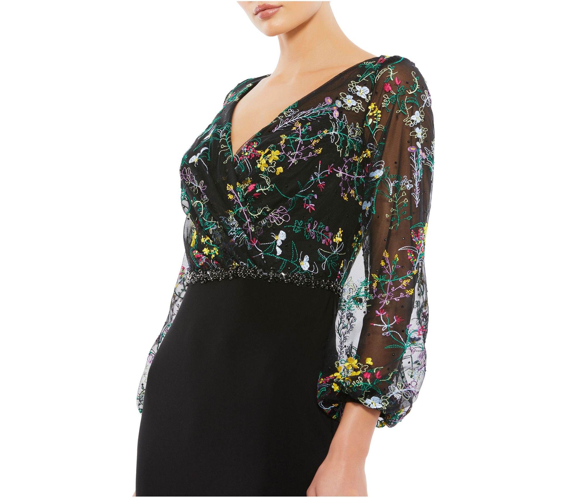 Mac Duggal Embroidered Illusion Puff Sleeve Column Gown