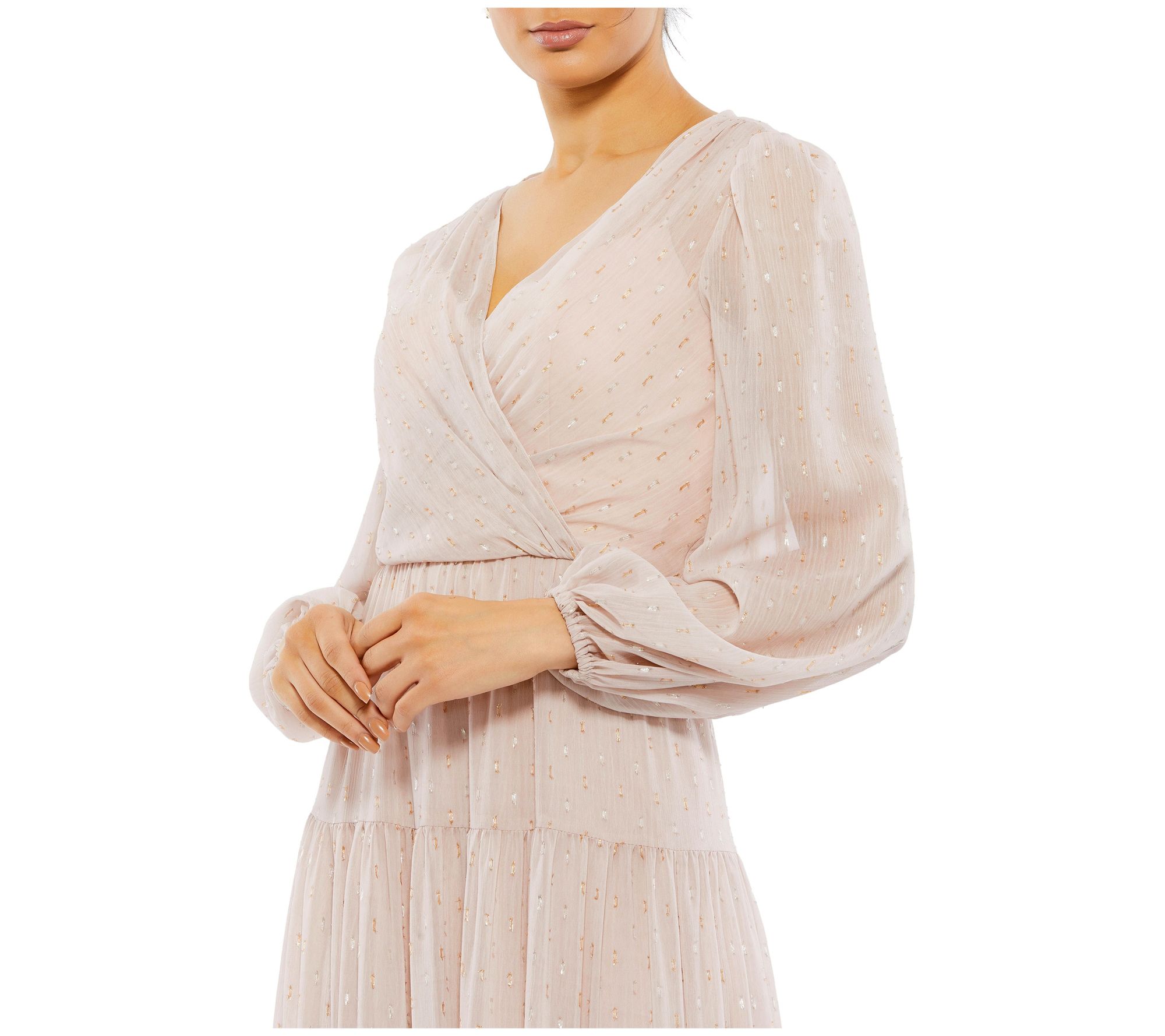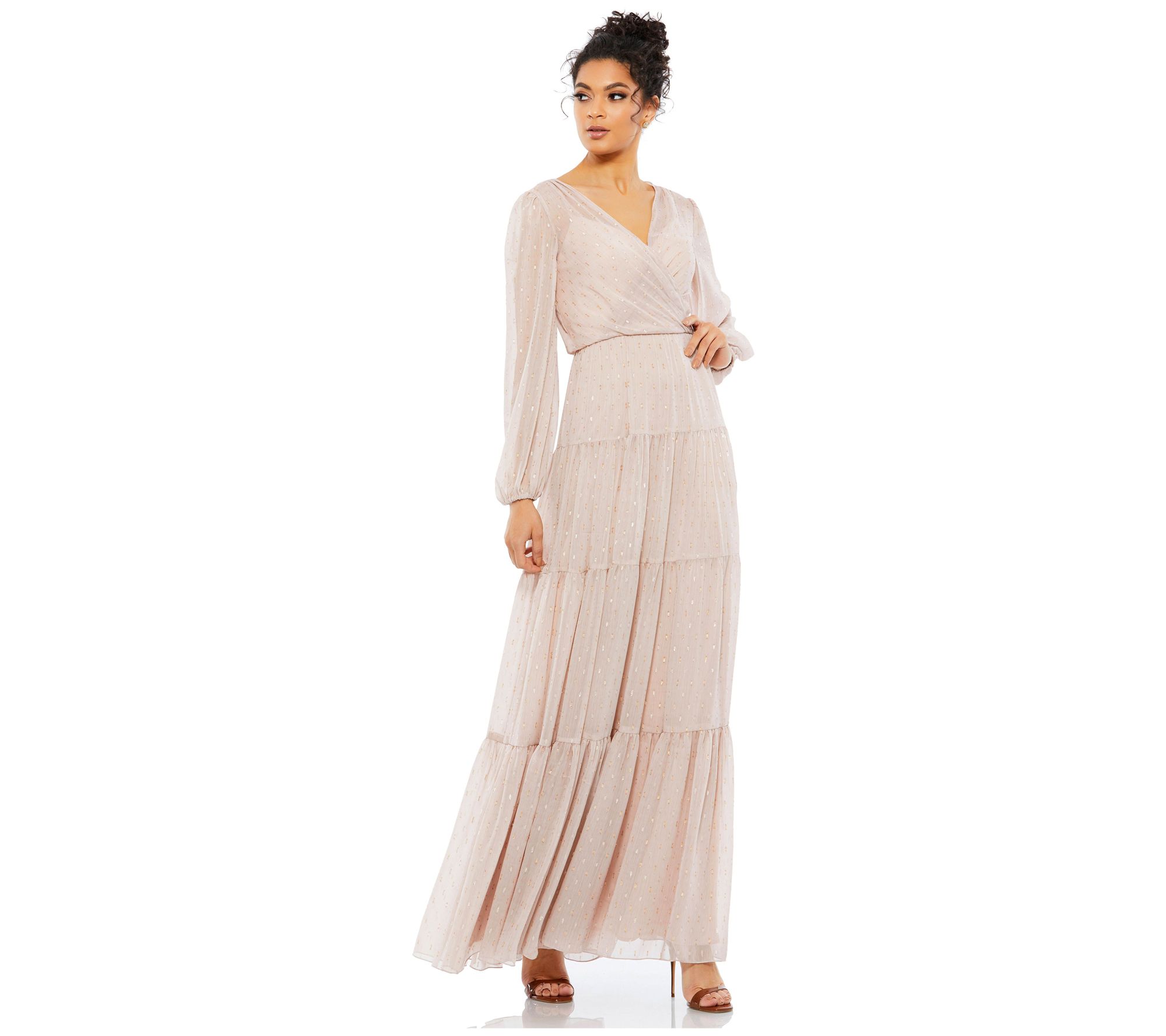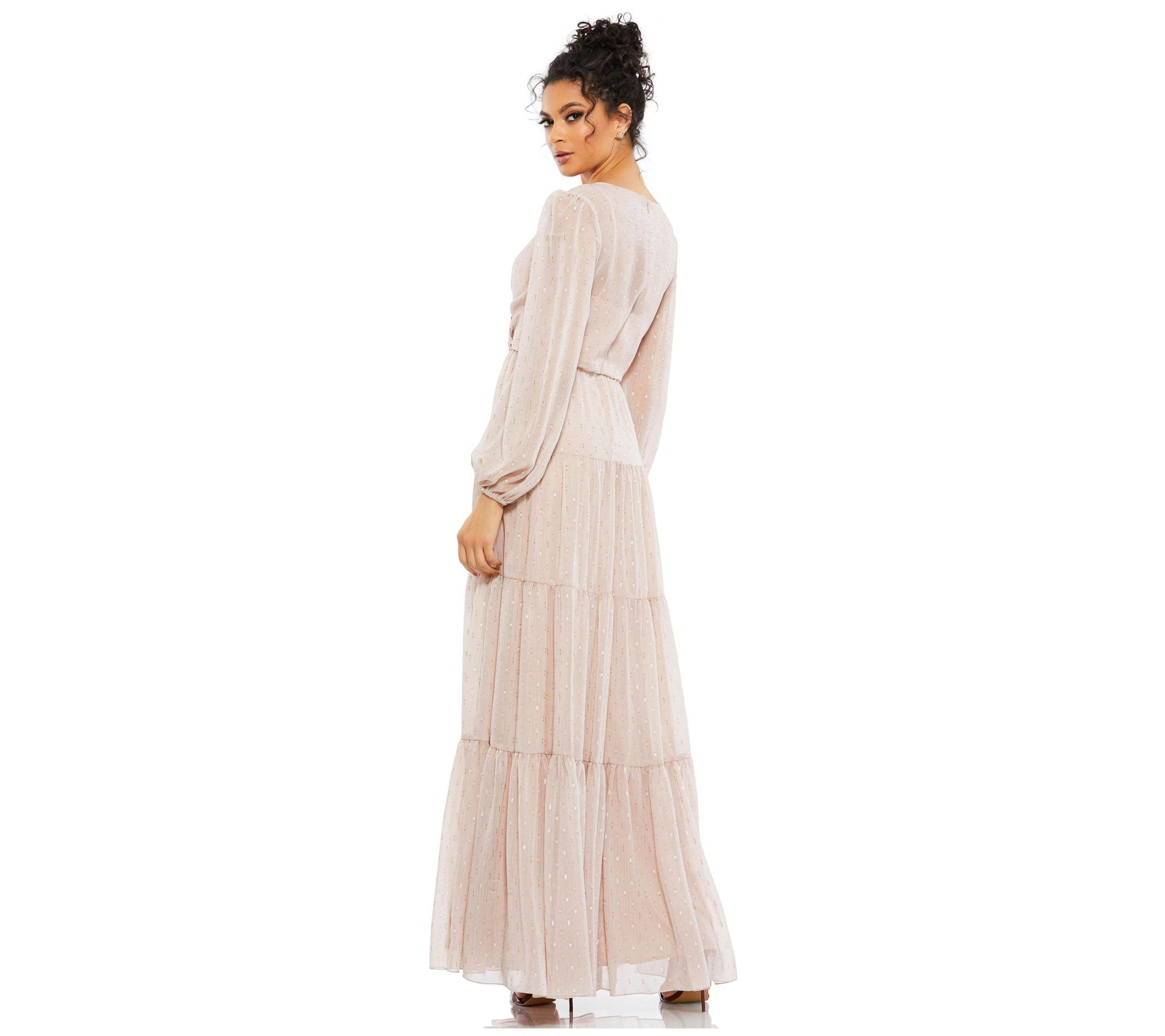 • Features: lined, V-neckline, long blouson sleeves, ruffled tiered skirt, ankle length