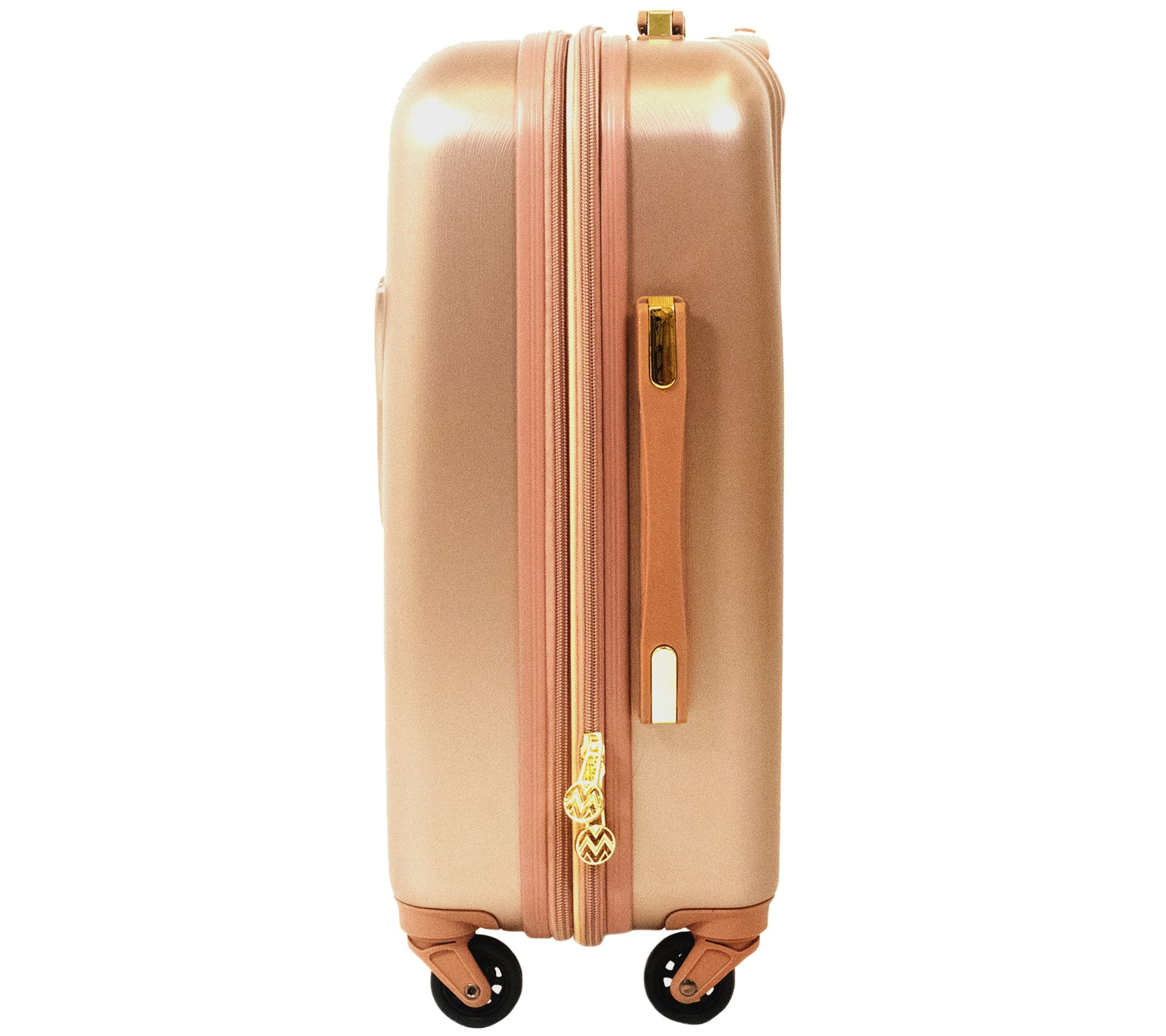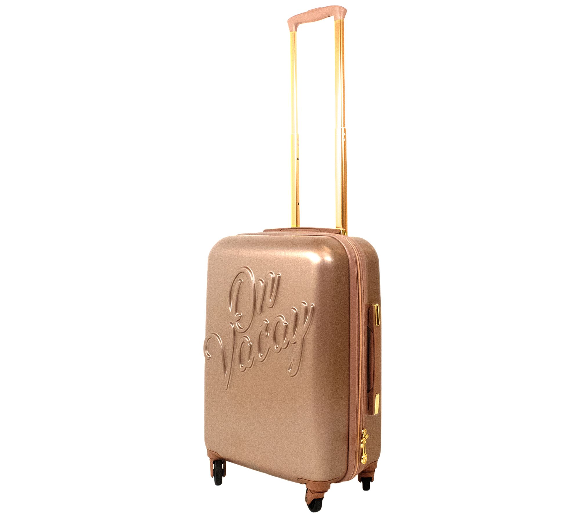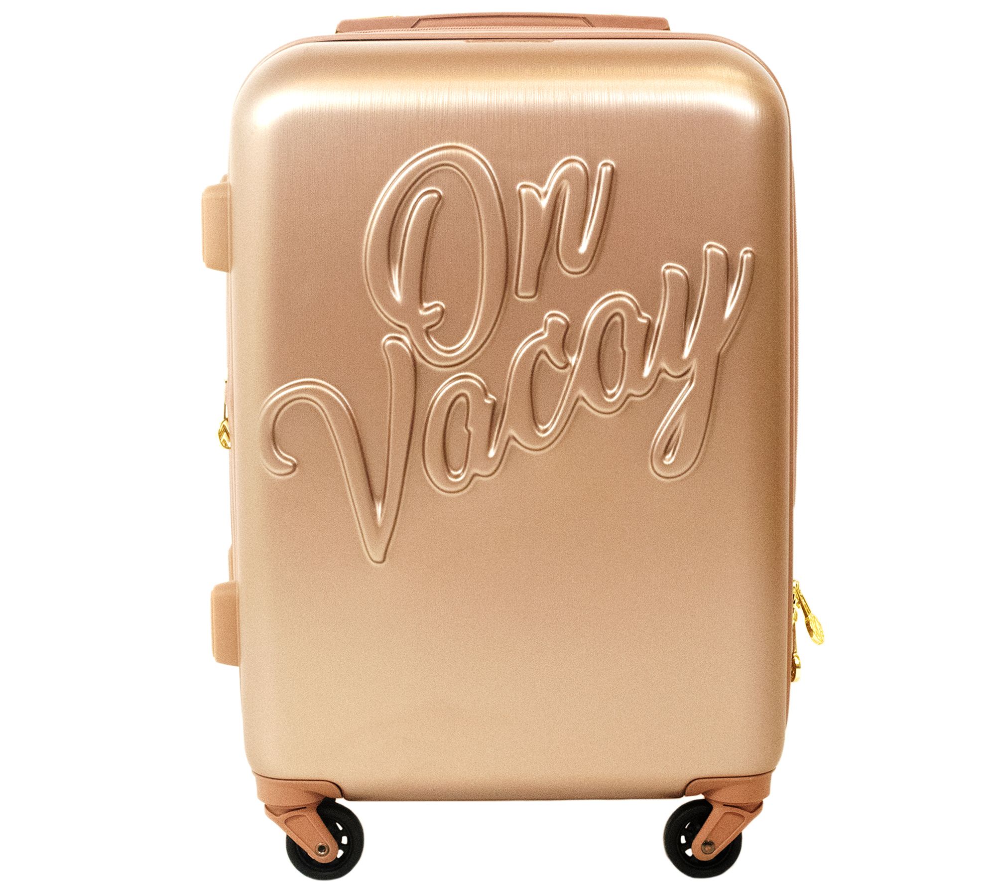 • Soft gold finish, "On Vacay" embossed words on front, ABS exterior, four multidirectional wheels, zipper closure, and goldtone telescoping handle
