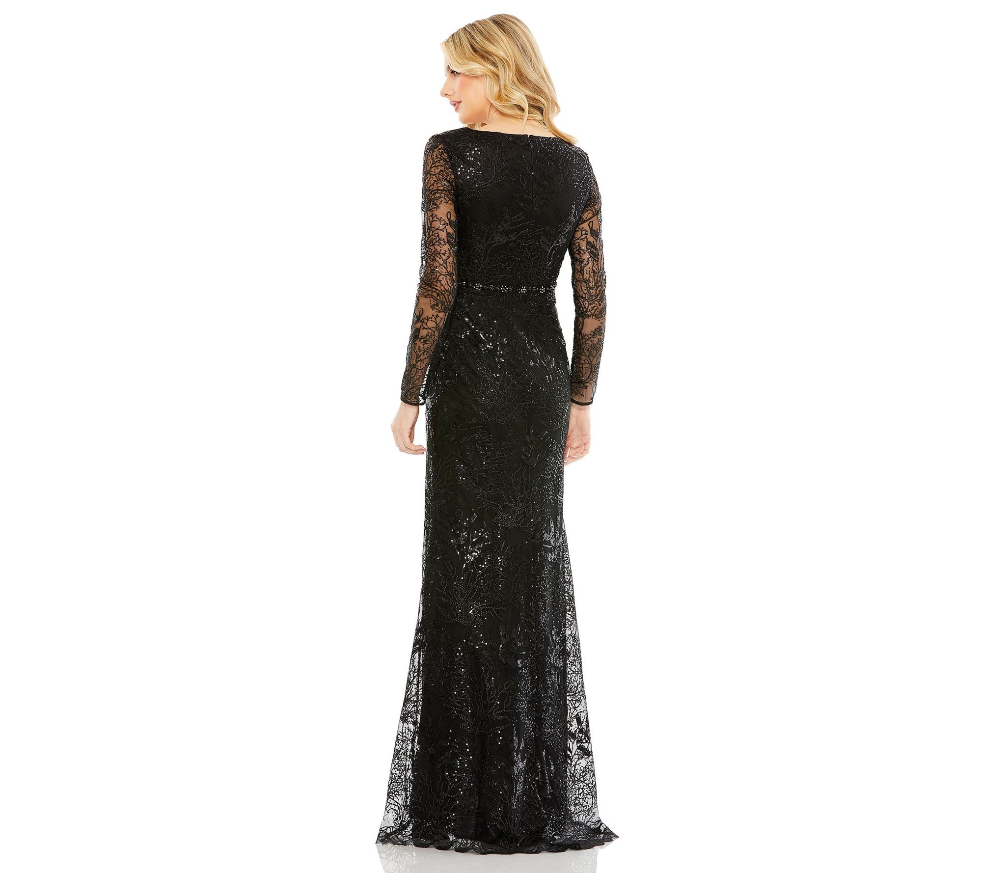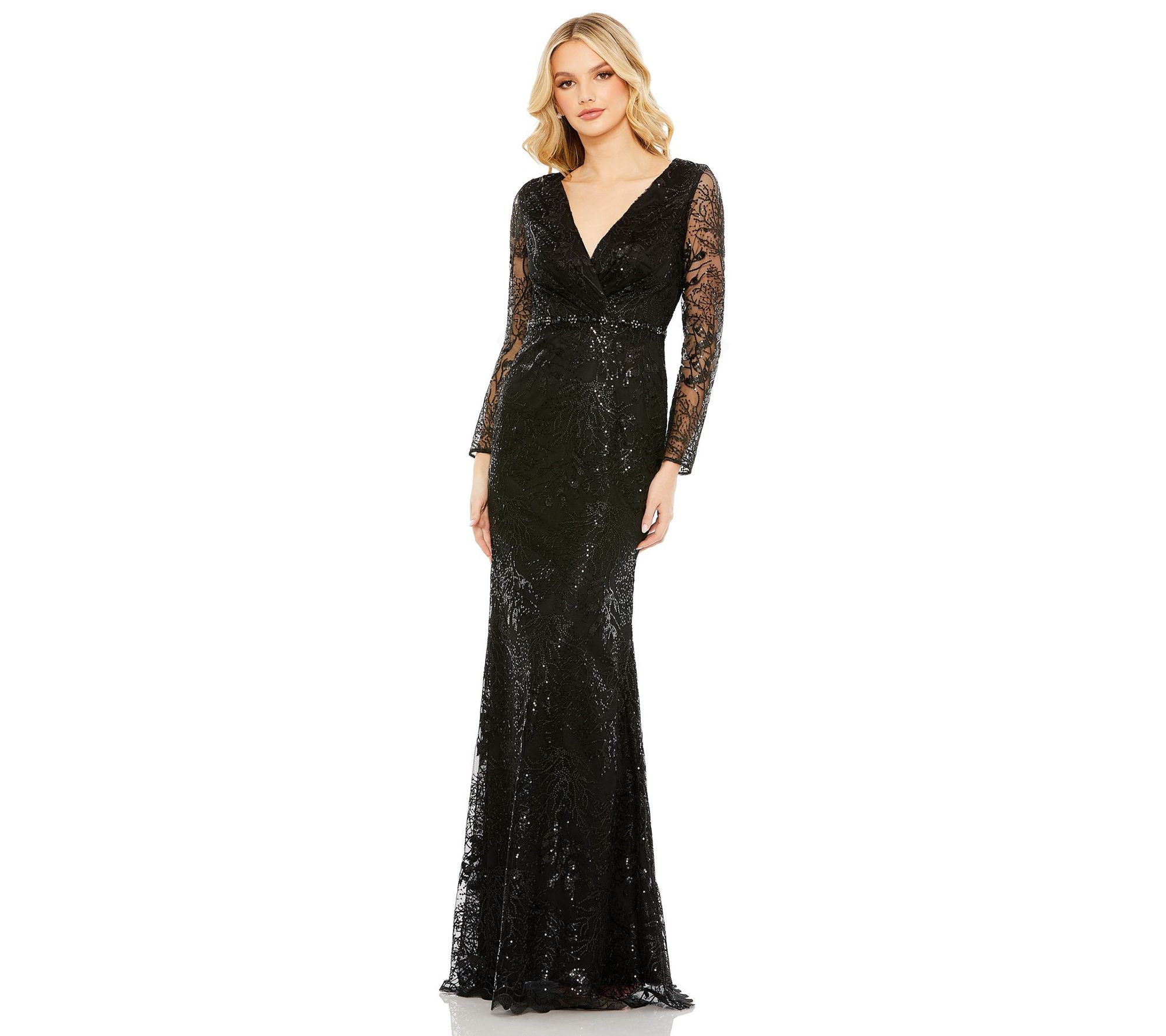 Ensure graceful gliding around the ballroom by donning this floor-skimming dress adorned with a plunging neckline and elegant long sleeves. From Mac Duggal.