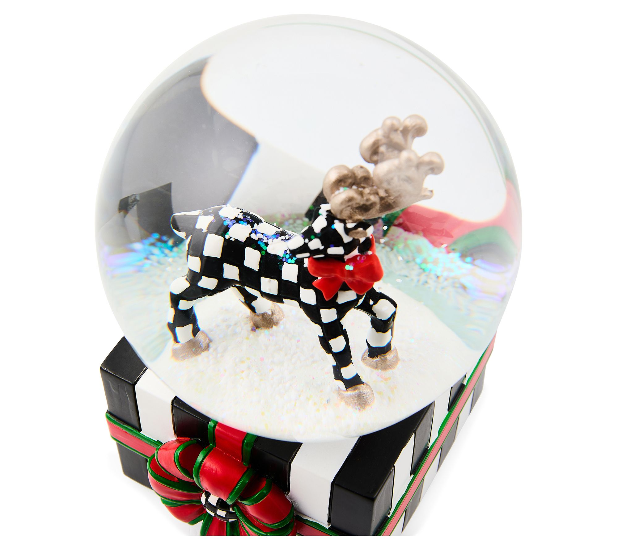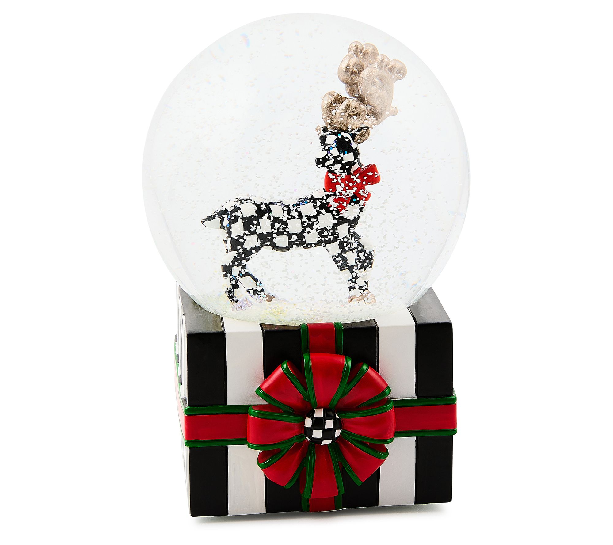 Classic holiday scenes take center stage when this snow globe gleams on your mantel or side table. Shaking it brings swirling snow around the festive deer, creating a charming highlight for quiet evenings, family gatherings, or cozy reading nooks. Let its playful pattern spark stories and smiles throughout your home. From MacKenzie-Childs.
