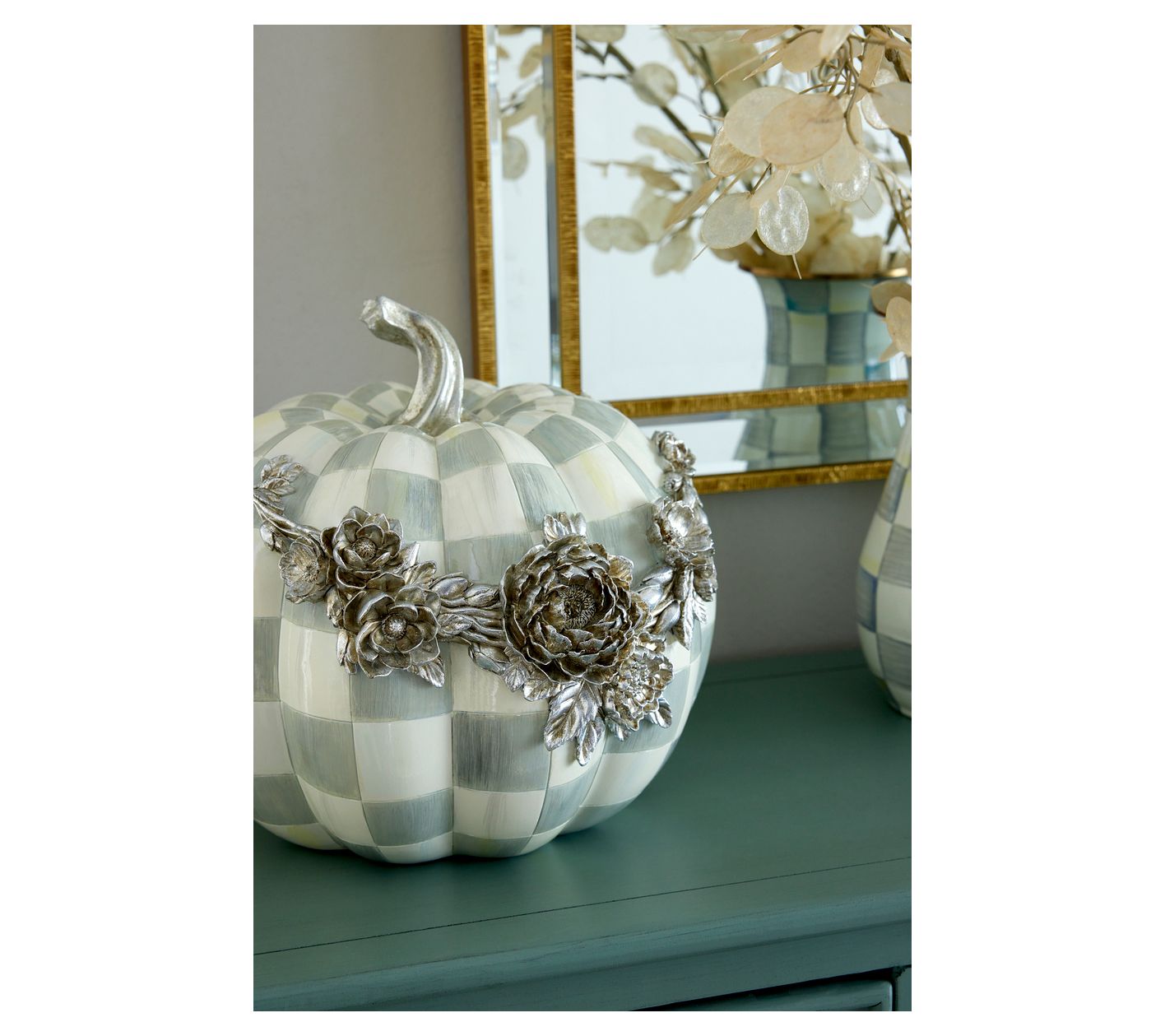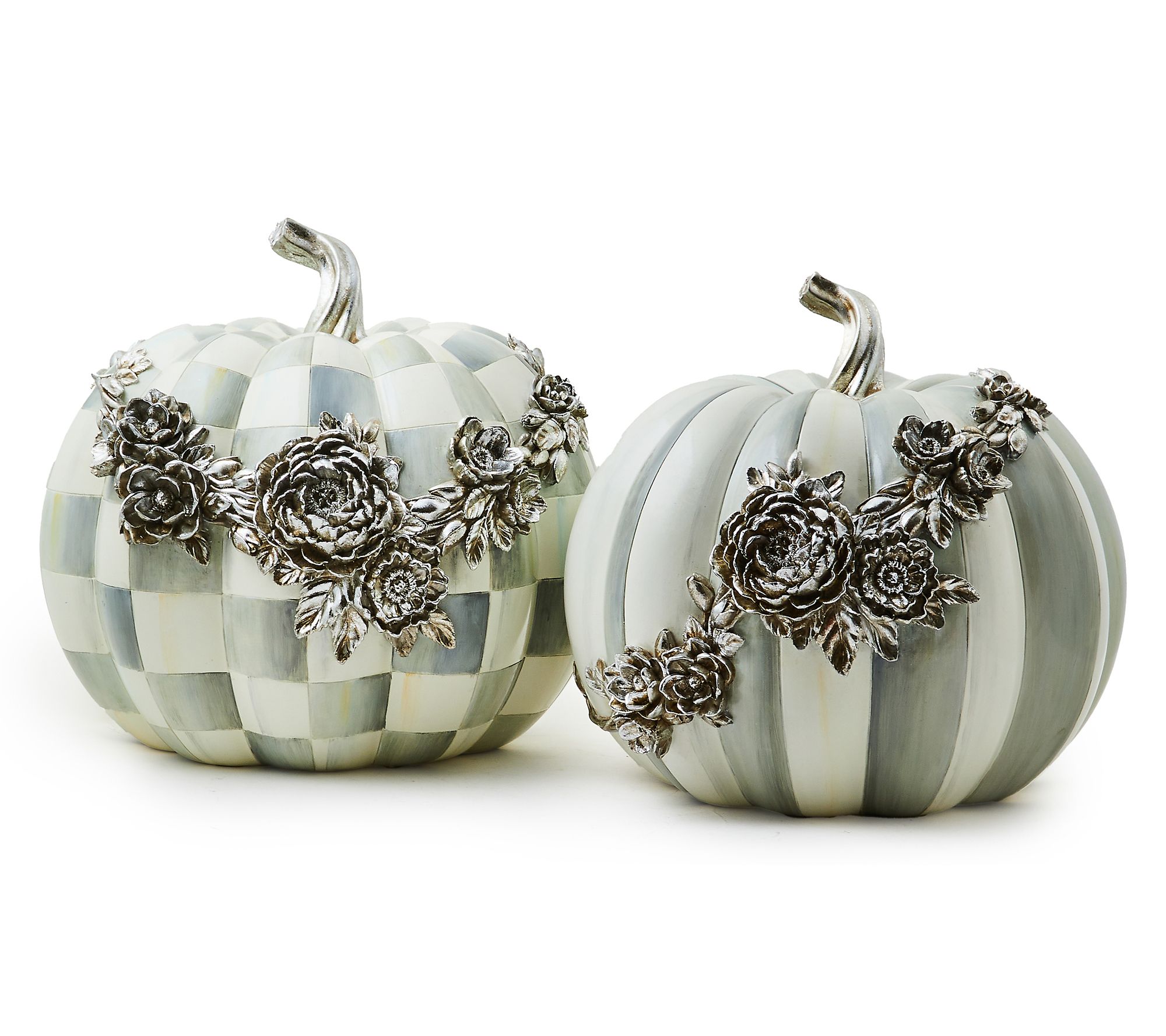 Featuring a hand-painted grey check pattern and embellished with dimensional silvertone flowers, this resin pumpkin is sure to impress. Add it to your sophisticated seasonal display or use it as a year-round decorative accent. From MacKenzie-Childs.