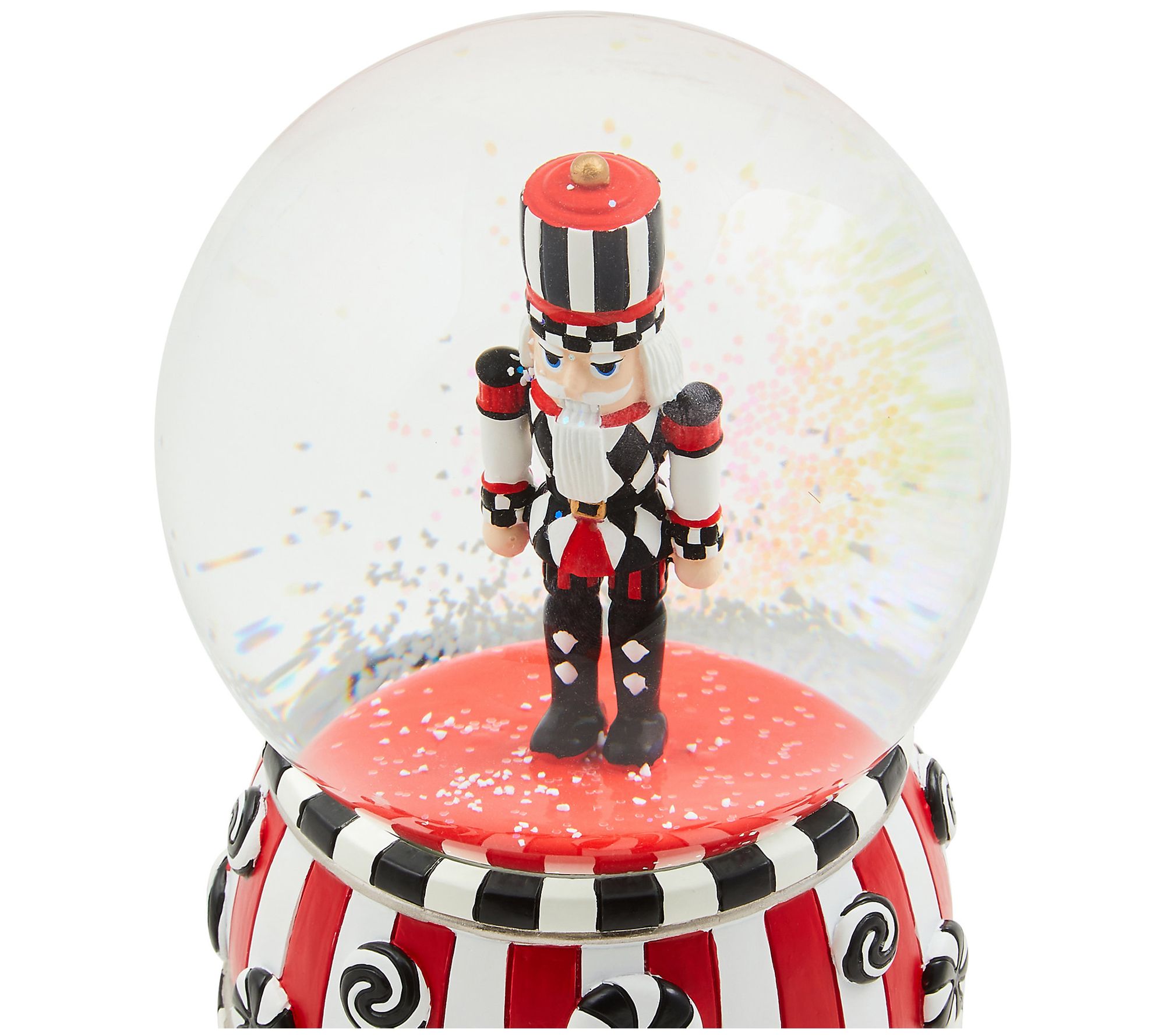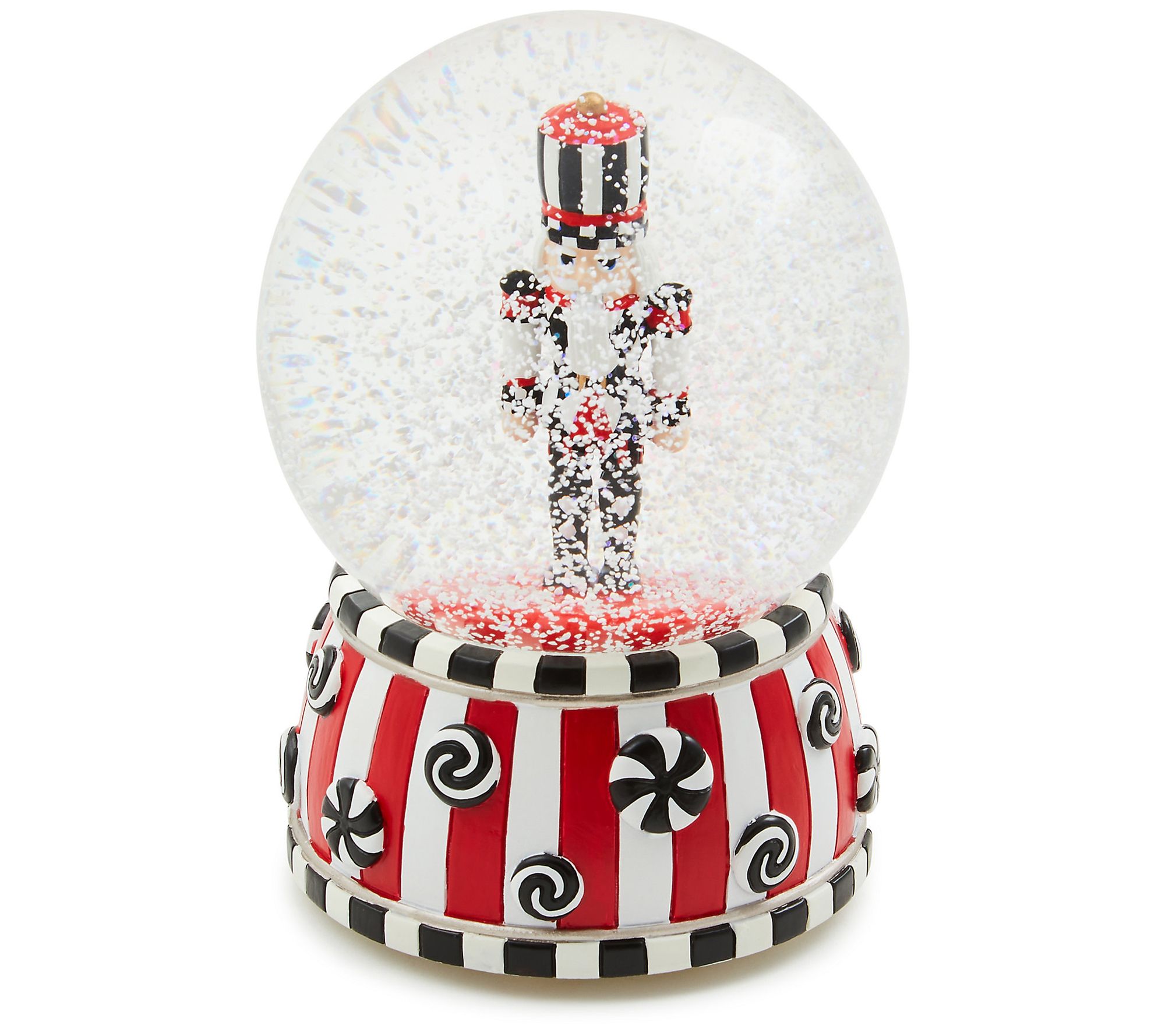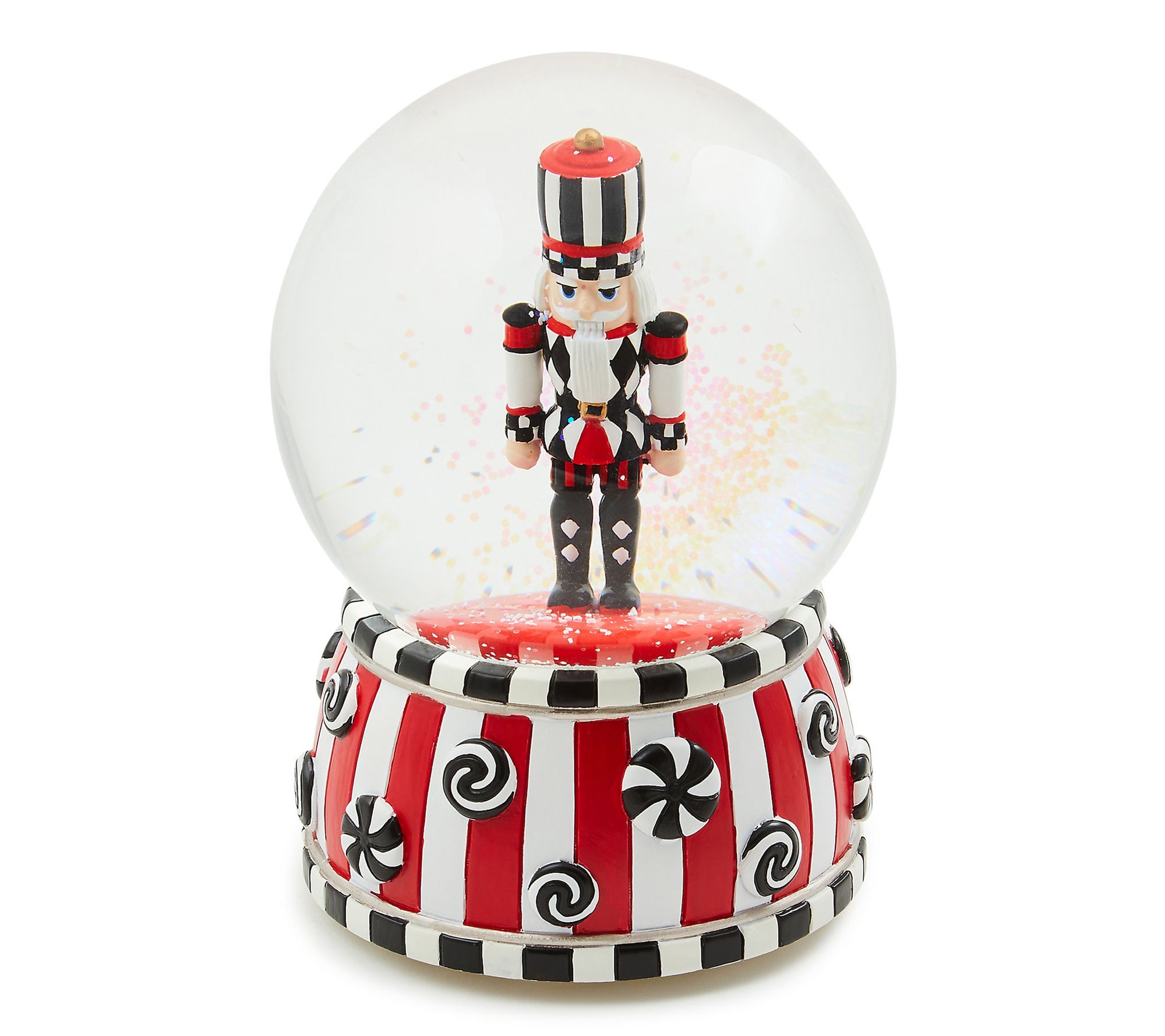 What a festive addition to your holiday home! This Peppermint nutcracker snow globe is done in red, black, and white and plays "The Nutcracker Suite" for even more charm. From MacKenzie-Childs.