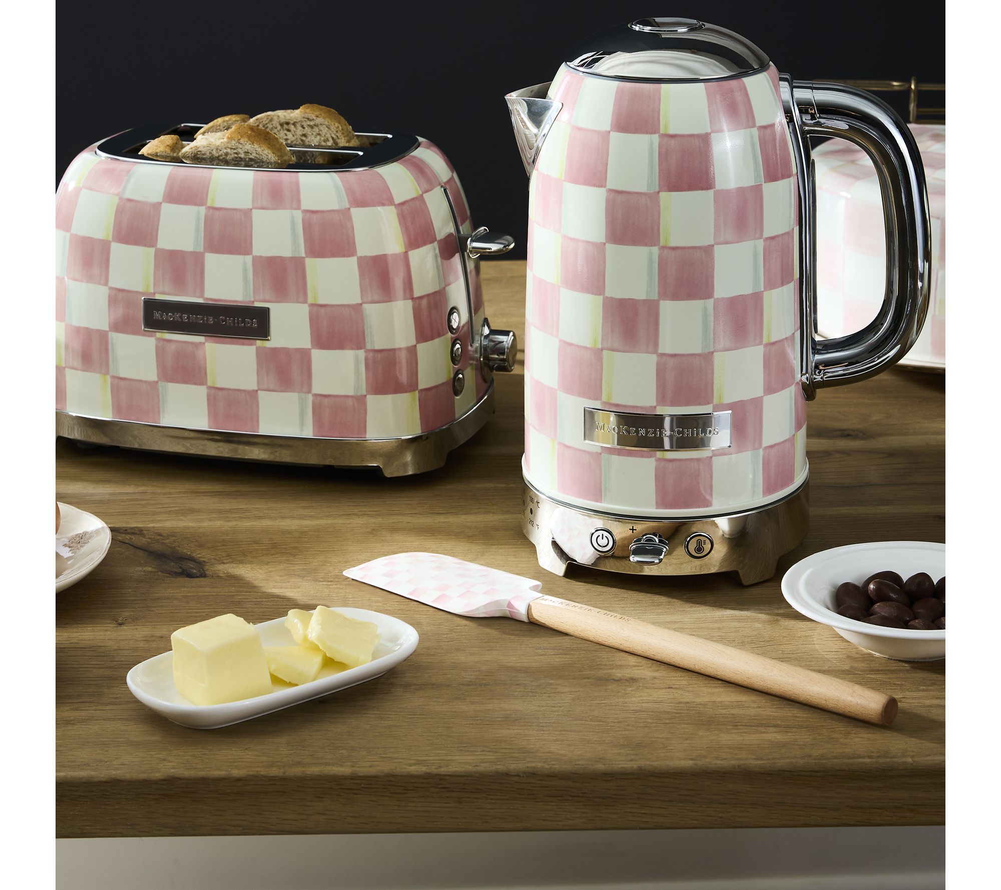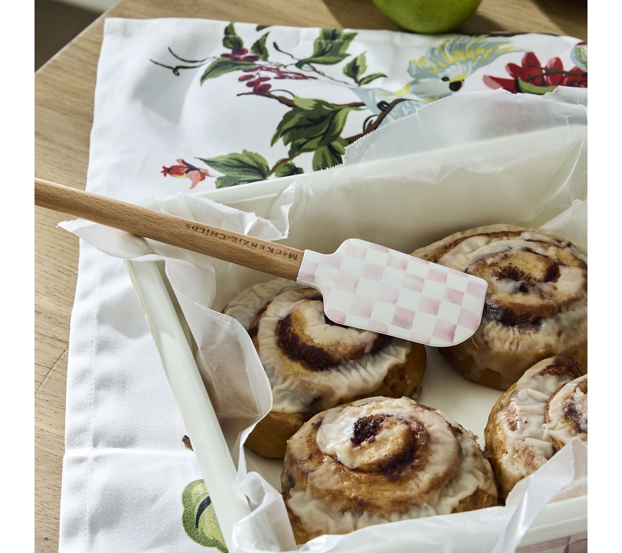 Add a splash of cheerful style to your kitchen routine with this set of two spatulas, featuring MacKenzie-Childs' signature checked pattern. Whether you're mixing cake batter or folding cookie dough, the silicone heads and beech wood handles offer a comfortable grip for every culinary task. It's an eye-catching set that brings a bit of whimsy to everyday baking. From MacKenzie-Childs.