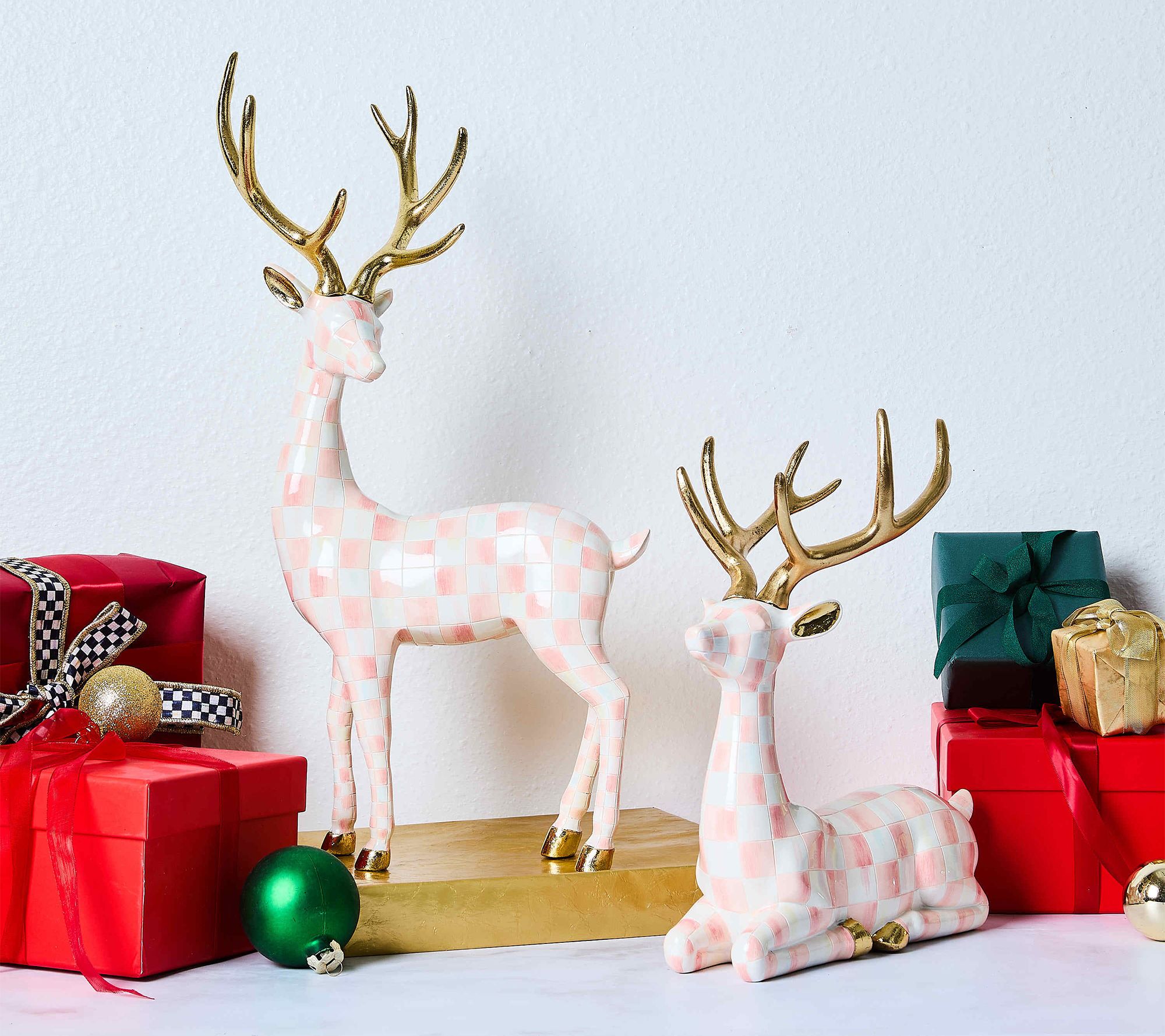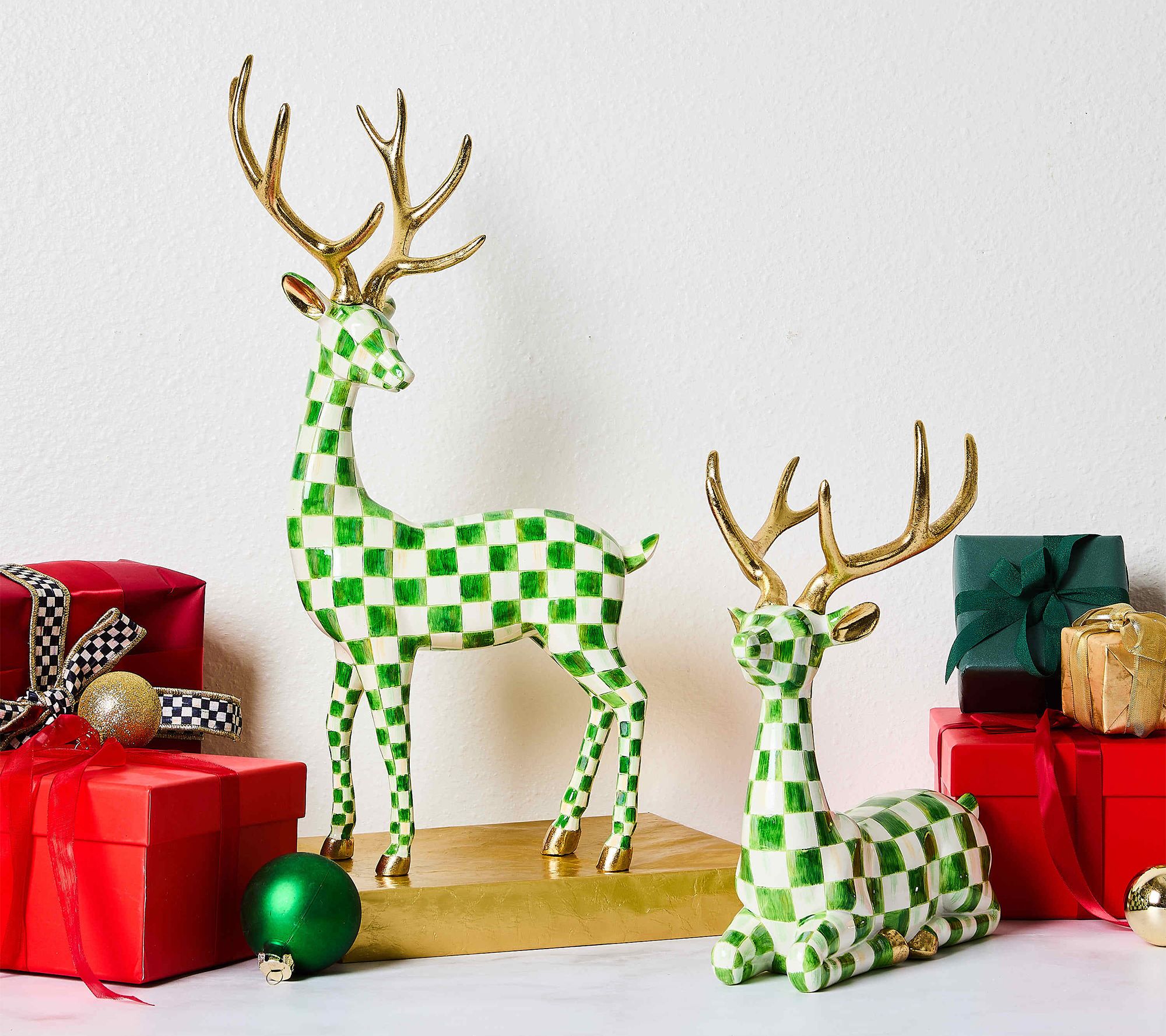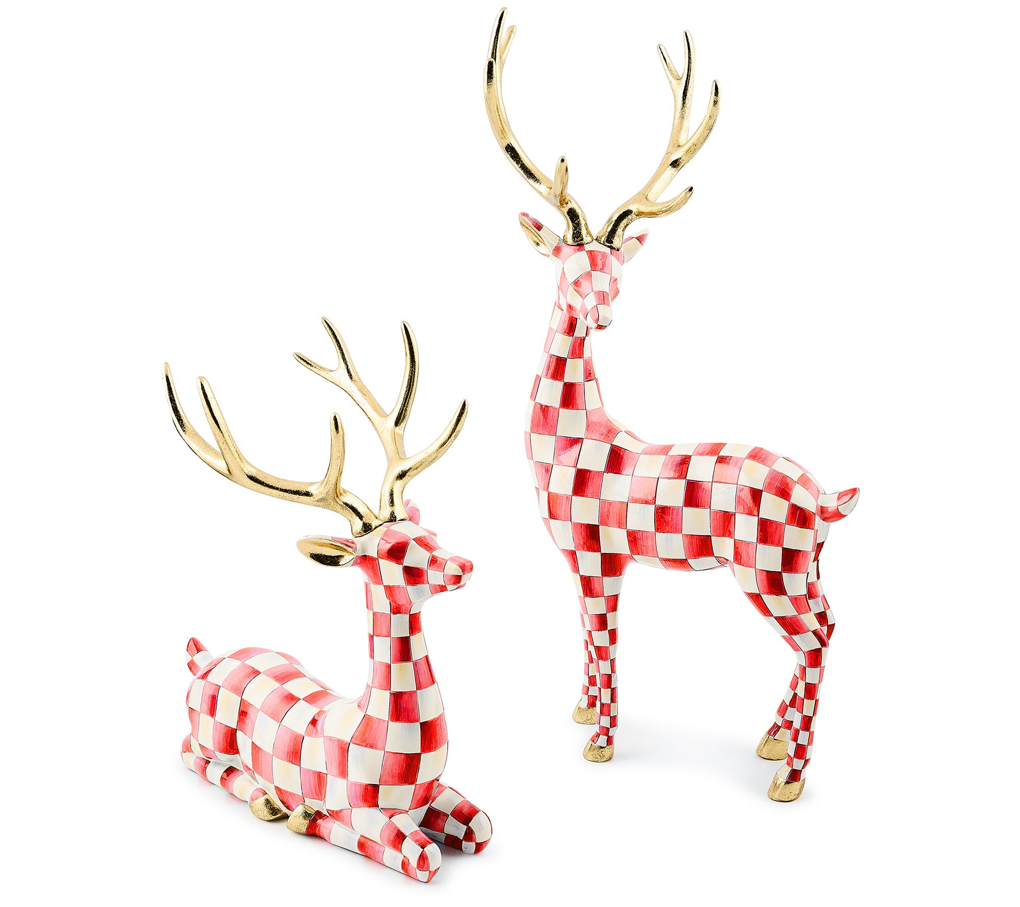 Holiday traditions or everyday whimsy -- why not both?! These playful deer bring MacKenzie-Childs' signature style to your tabletop or mantel. With one gracefully standing and the other nestled in repose, they offer instant charm and Cherry Check cheerfulness. Imagine them tucked among garlands or anchoring a festive centerpiece. From MacKenzie-Childs.