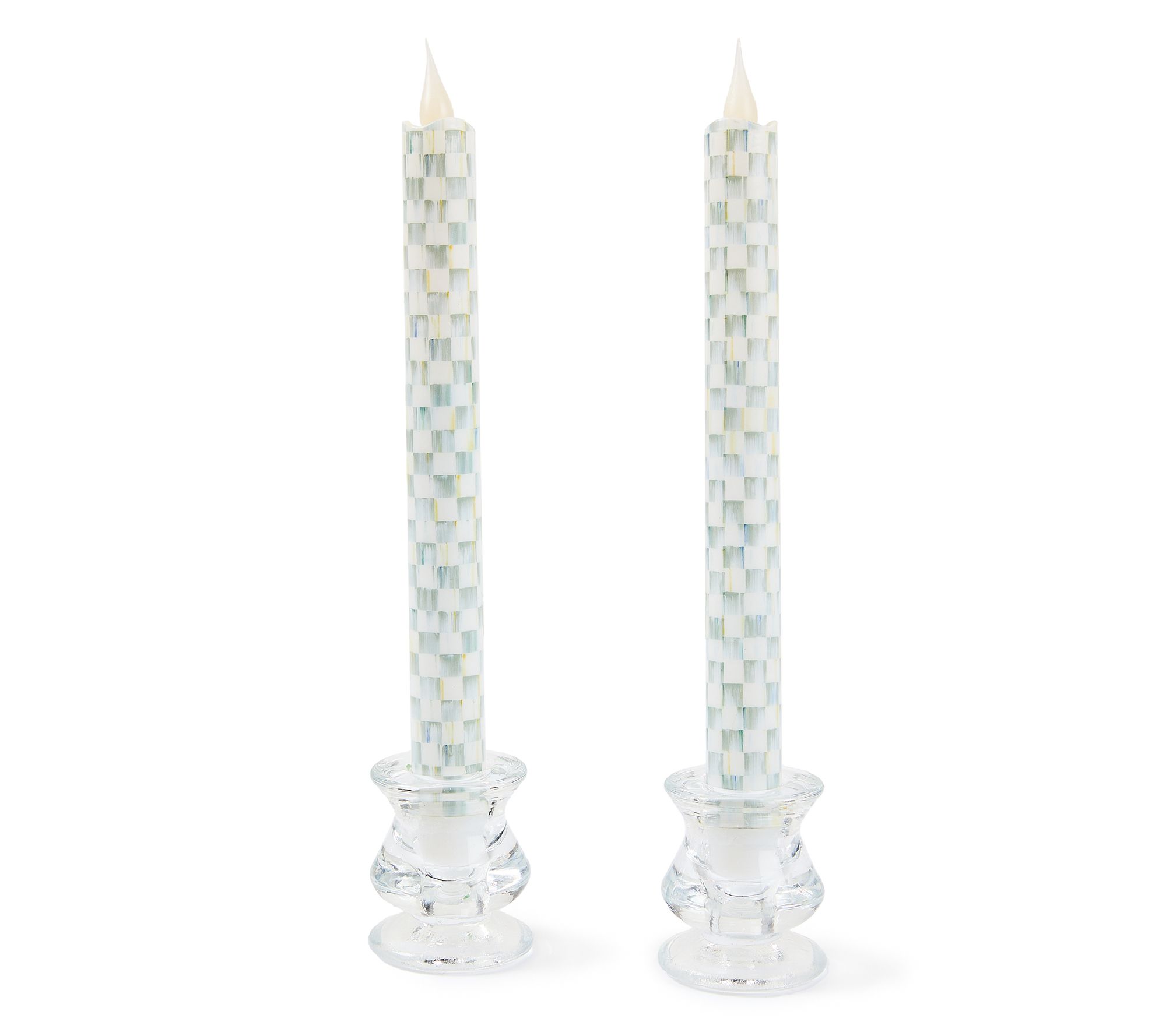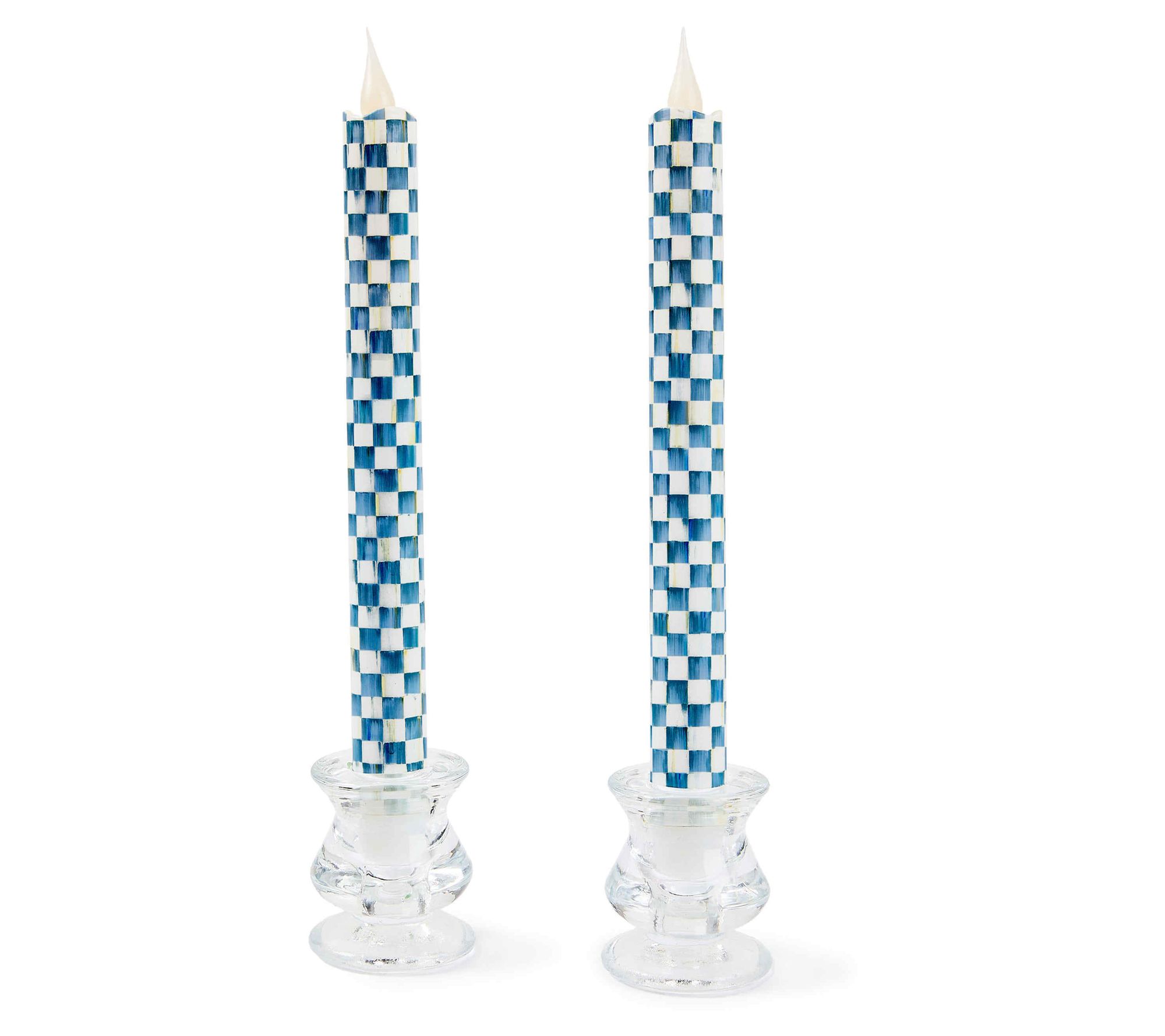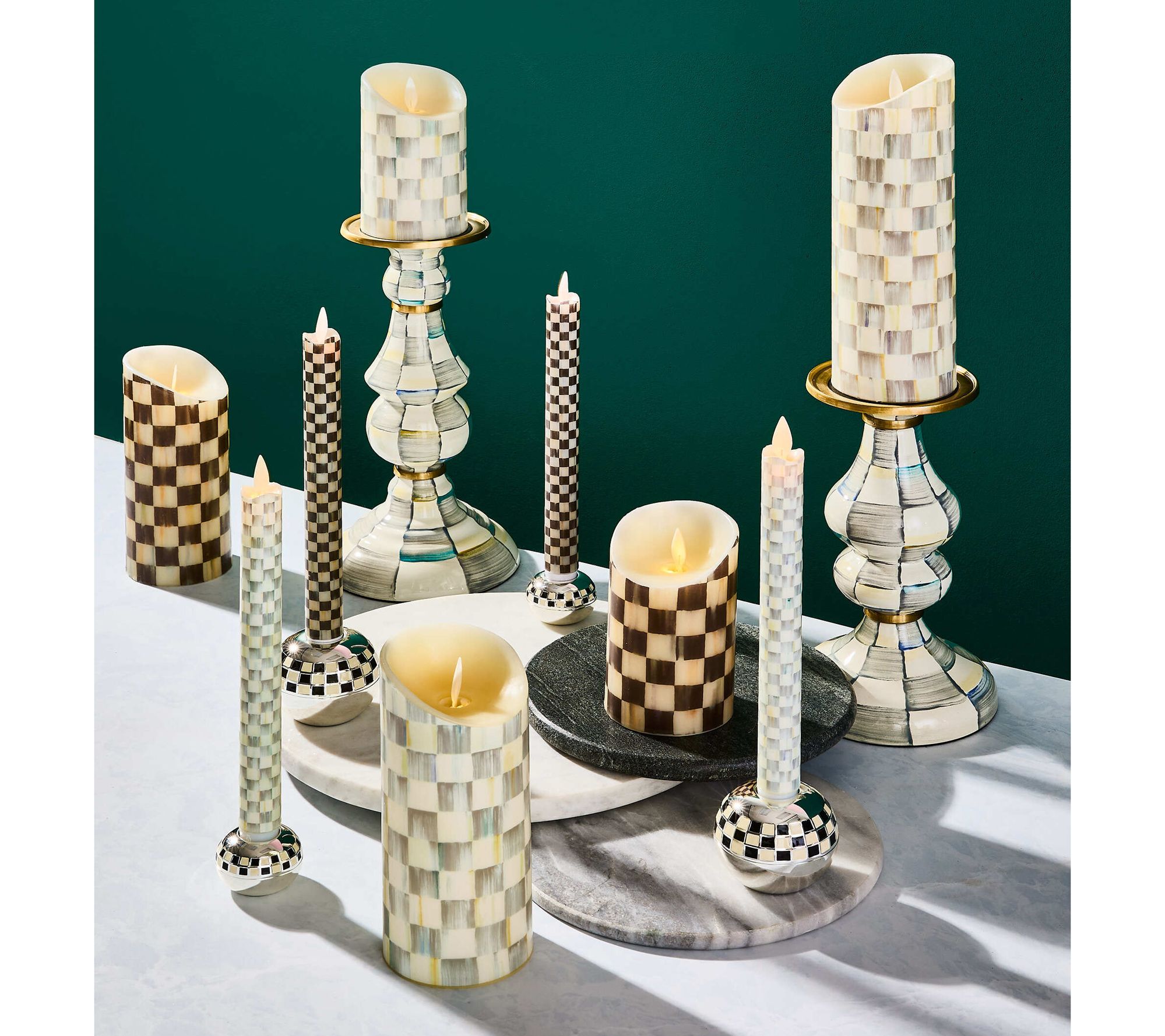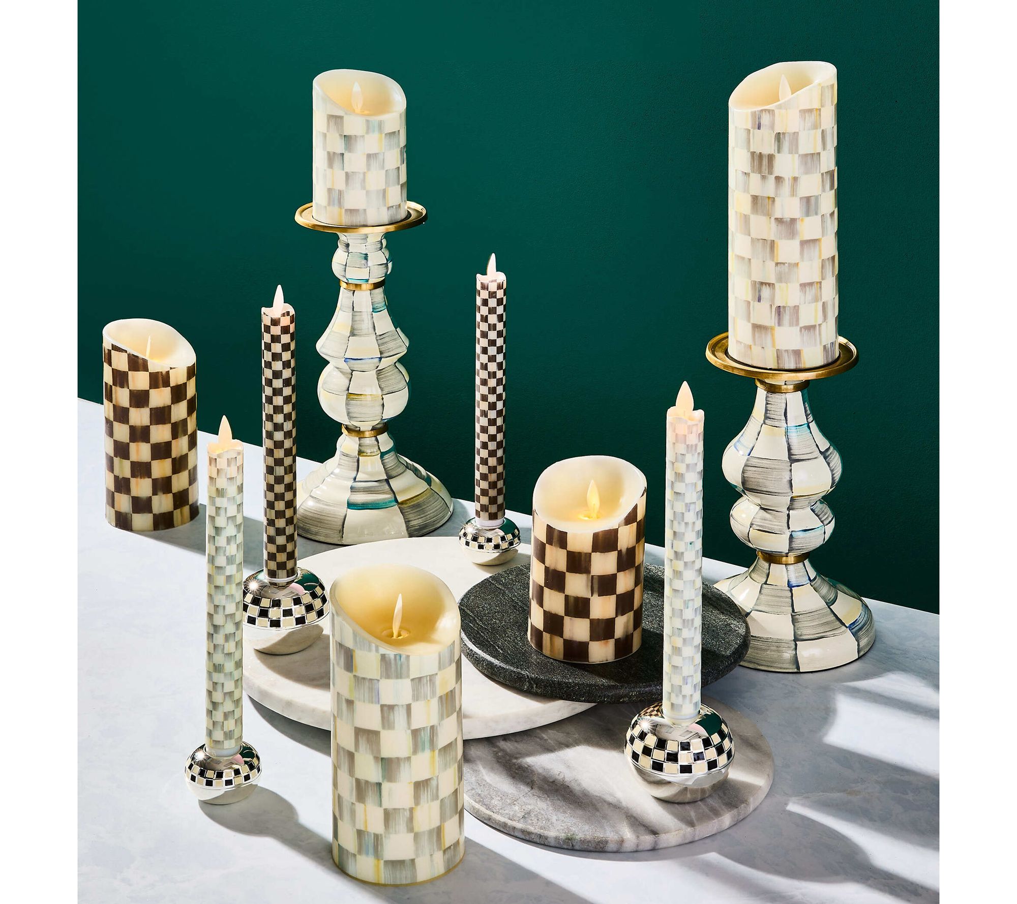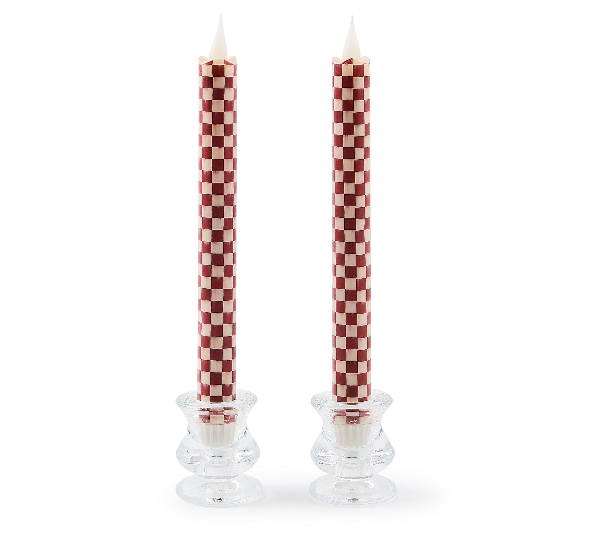 Set the scene for intimate evenings or festive get-togethers with this charming pair of check tapers -- no matches, mess, or worries. Simply pop in the batteries, place them in your favorite holders, and watch as every corner gets an inviting, flicker-free glow -- ideal for dinner tables, sideboards, or entryways. Style together or separately for a playful nod to signature whimsy. From MacKenzie-Childs.