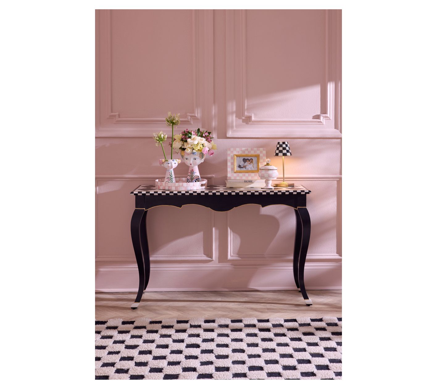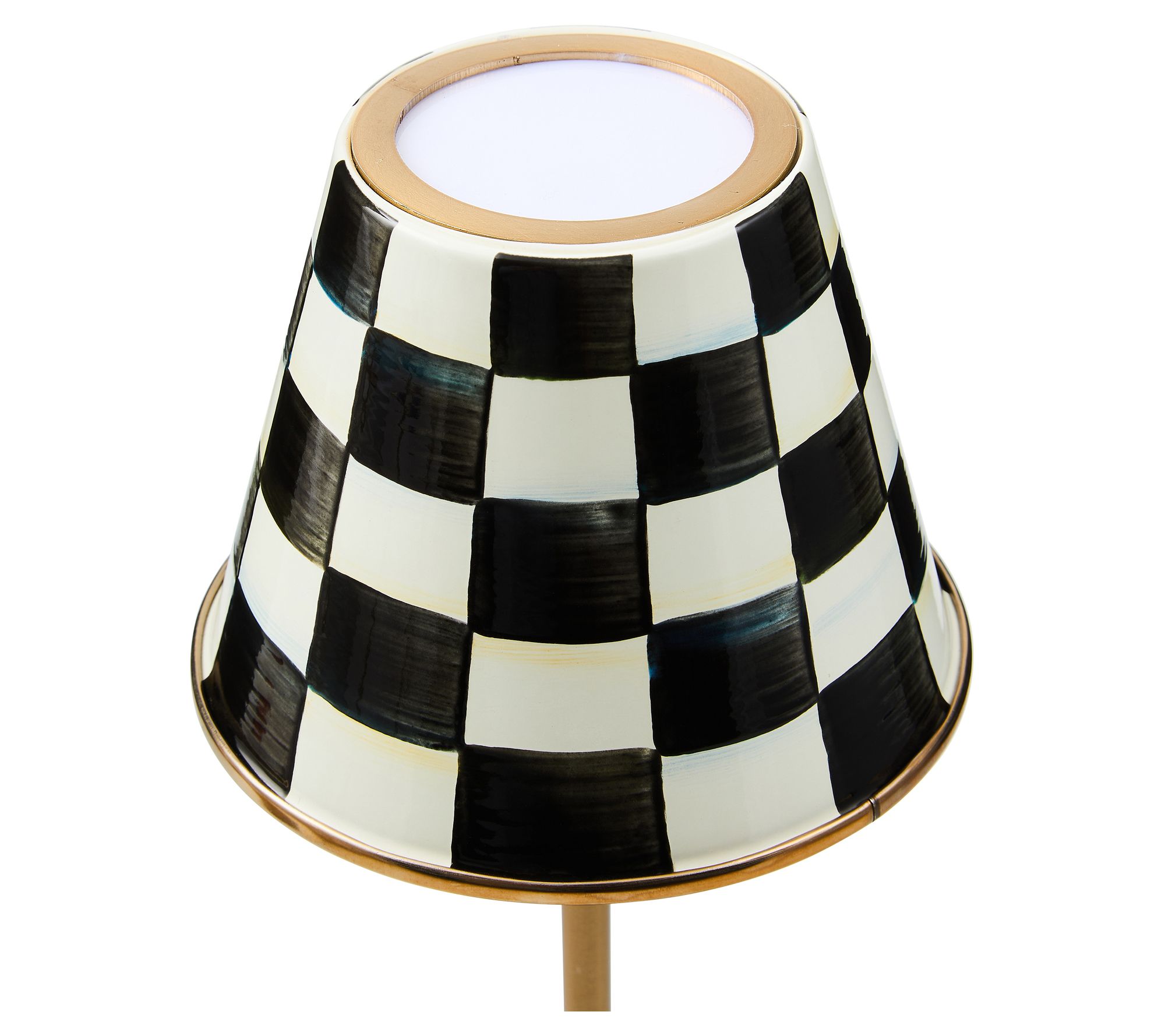 Create a cozy and inviting ambiance with the MacKenzie-Childs Courtly Check LED Rechargeable Table Lamp. With its signature pattern on a brass-finish base, this lamp brings a whimsical charm to any room. Enjoy the convenience of a wireless design while effortlessly adjusting the brightness by tapping the shade. From MacKenzie-Childs.