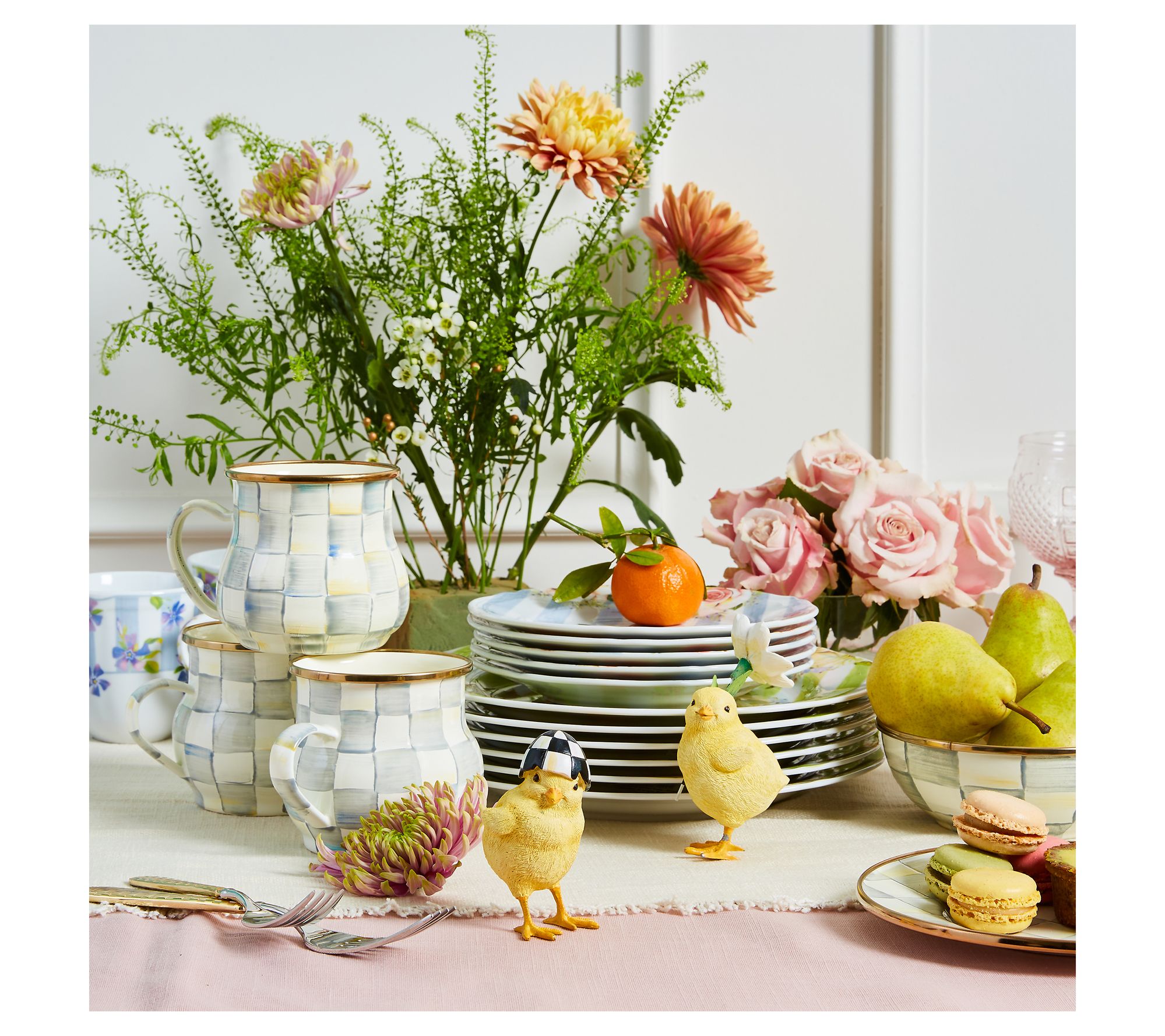 Add a touch of whimsy to your spring decor with this delightful set of Rose Garden Chicks. Each charming chick, hand-painted with intricate details, holds a spring blossom or wears an adorable cracked egg hat, making them the perfect addition to any tabletop or display. Create a joyful scene that will brighten up your home. From MacKenzie-Childs.
