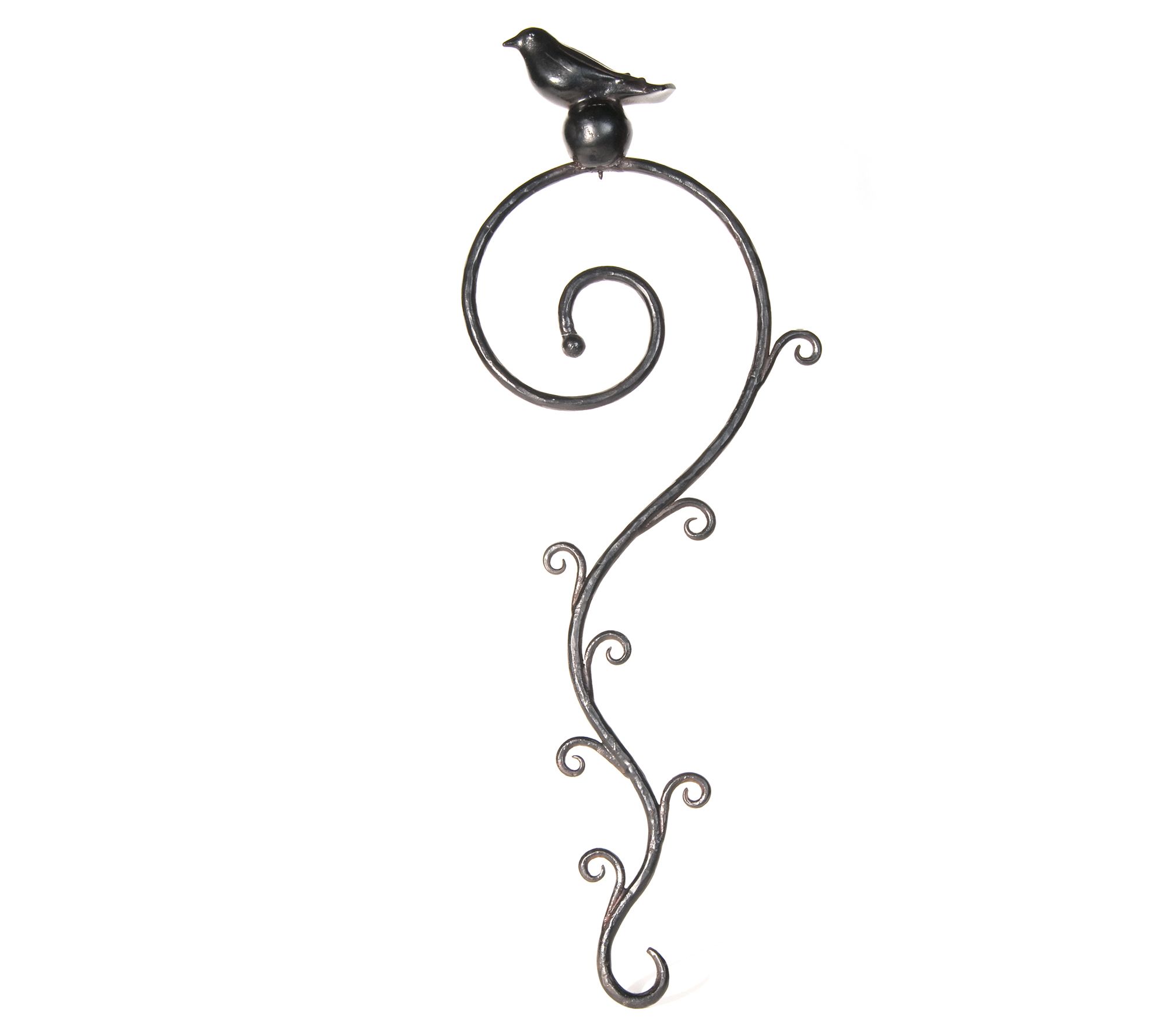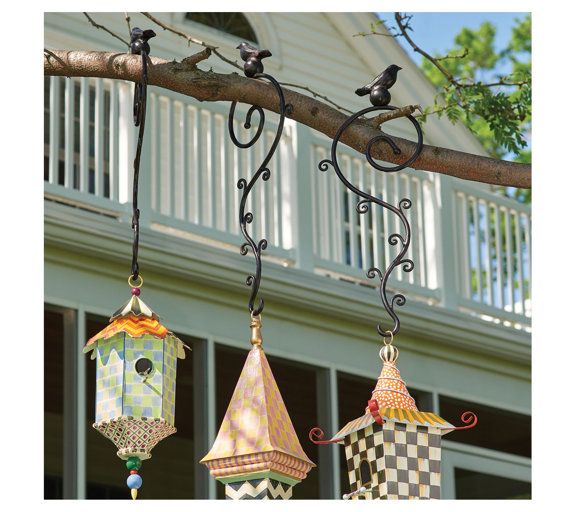 Transform your garden into a whimsical haven with the MacKenzie-Childs Birdhouse Hook. This exquisite piece, crafted from wrought iron, features a fern-inspired scroll design topped with a charming sparrow, ready to keep your feathered friends company. It's the perfect way to display your choice of birdhouse, be it Pagoda, Hollyhock, or Flyer's Folly, turning a simple backyard into a delightful garden refuge. From MacKenzie-Childs.