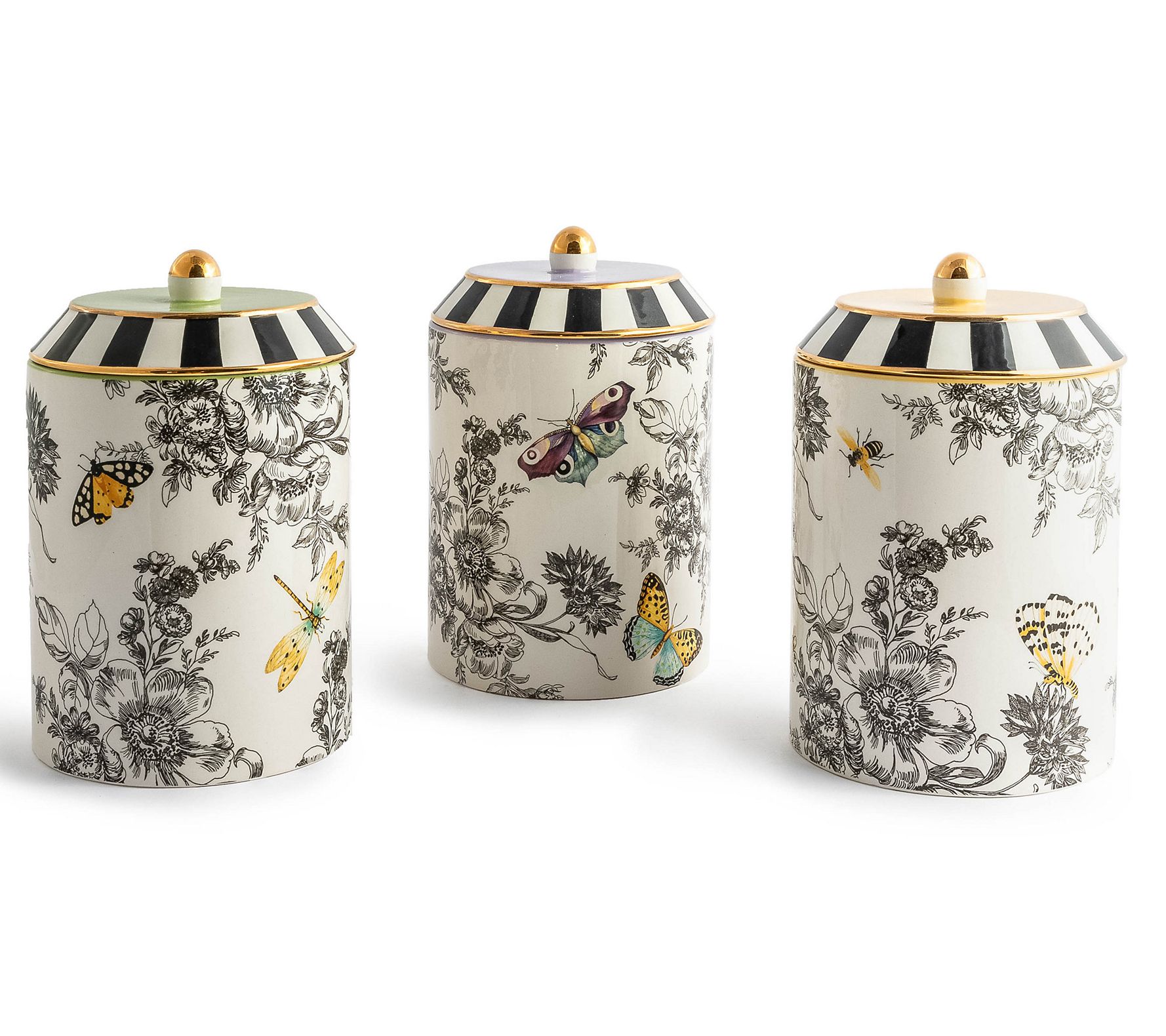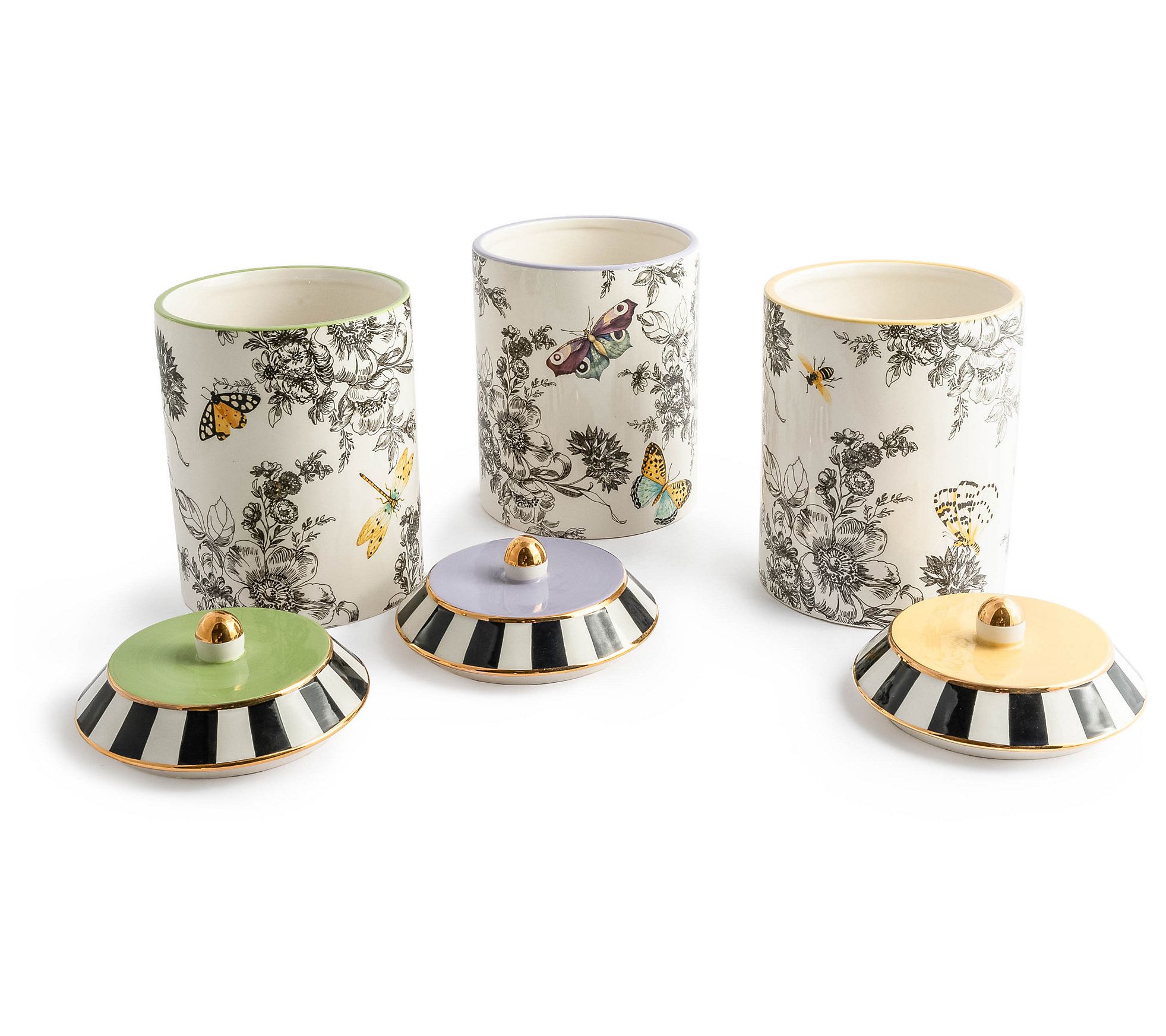 With a beautiful butterfly toile pattern accented by black-and-white stripes, colorful tops, and goldtone accents, this trio of lidded canisters brings a dash of charm to a pantry or kitchen countertop. From MacKenzie-Childs.