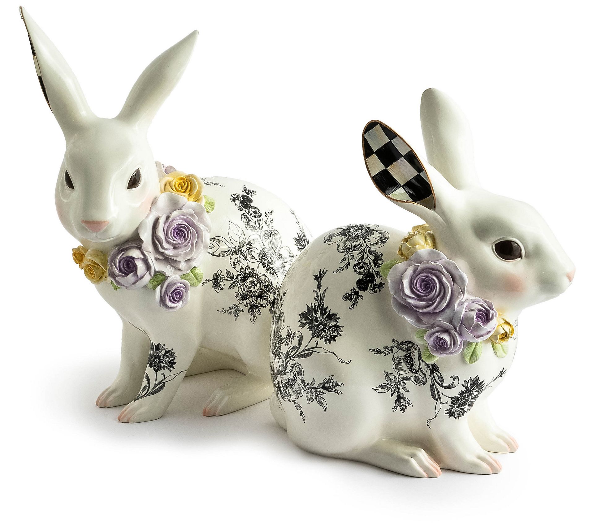 Hop into the joys of spring with this sweet rabbit figure that features a butterfly toile pattern accented by cute checkered ears and a flower garland. From MacKenzie-Childs.